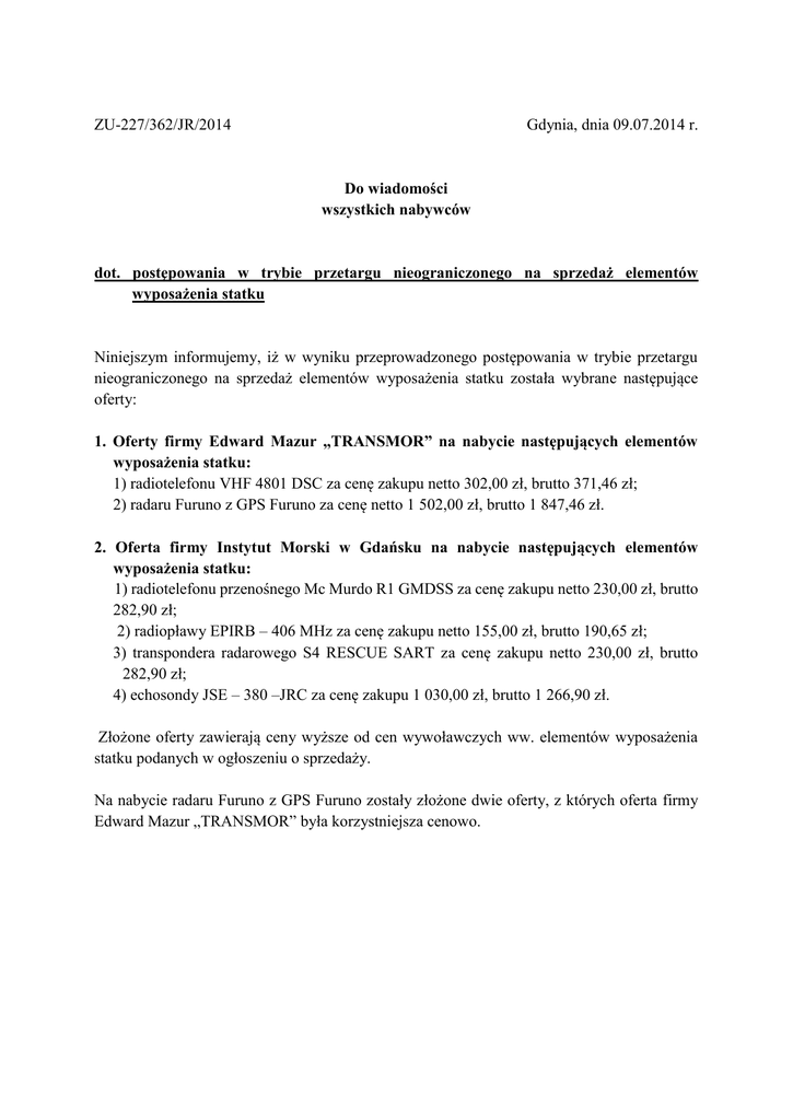 ZU-227/362/JR/2014 Gdynia, dnia 09.07.2014 r. Do wiadomości wszystkich nabywców dot. postępowania w trybie przetargu nieograniczonego na sprzedaż elementów wyposażenia statku Niniejszym informujemy, iż w wyniku przeprowadzonego postępowania w trybie przetargu nieograniczonego na sprzedaż elementów wyposażenia statku została wybrane następujące oferty: 1. Oferty firmy Edward Mazur „TRANSMOR” na nabycie następujących elementów wyposażenia statku: 1) radiotelefonu VHF 4801 DSC za cenę zakupu netto 302,00 zł, brutto 371,46 zł; 2) radaru Furuno z GPS Furuno za cenę netto 1 502,00 zł, brutto 1 847,46 zł. 2. Oferta firmy Instytut Morski w Gdańsku na nabycie następujących elementów wyposażenia statku: 1) radiotelefonu przenośnego Mc Murdo R1 GMDSS za cenę zakupu netto 230,00 zł, brutto 282,90 zł; 2) radiopławy EPIRB – 406 MHz za cenę zakupu netto 155,00 zł, brutto 190,65 zł; 3) transpondera radarowego S4 RESCUE SART za cenę zakupu netto 230,00 zł, brutto 282,90 zł; 4) echosondy JSE – 380 –JRC za cenę zakupu 1 030,00 zł, brutto 1 266,90 zł. Złożone oferty zawierają ceny wyższe od cen wywoławczych ww. elementów wyposażenia statku podanych w ogłoszeniu o sprzedaży. Na nabycie radaru Furuno z GPS Furuno zostały złożone dwie oferty, z których oferta firmy Edward Mazur „TRANSMOR” była korzystniejsza cenowo. Komisja przetargowa w poniższej tabeli odnotowała: nazwy nabywców, adresy, ceny ofertowe: Cena wywoławcza (bez podatku VAT) danego elementu wyposażenia statku Nazwa Edward Mazur 84-150 Hel, elementu „TRANSMOR” ul. Wiejska wyposażenia 34 statku, na nabycie których zostały Oferowana cena Oferowana złożone nabycia netto cena oferty nabycia brutto Instytut Morski 80-830 Gdańsk, ul. Długi Targ 41/42 Oferowana cena nabycia netto Oferowana cena nabycia brutto 200,00 zł Radiotelefon przenośny Mc Murdo R1 GMDSS Radiotelefon VHF 4801 DSC Radiopława EPIRB – 406 MHz Transpnder radarowy S4 RESCUE SART Radar Furuno z GPS Furuno Echosonda JSE – 380 JRC 250,00 zł 125,00 zł 200,00 zł 1 375,00 zł 1 000,00 zł _ _ 230,00 zł Nie podano 302,00 zł 371,46 zł _ _ _ _ 155,00 zł Nie podano _ _ 230,00 zł Nie podano 1 502, 00 zł 1 847,46 zł 1 405,00 zł Nie podano _ _ 1 030,00 zł Nie podano Brak podania cen brutto dla poszczególnych elementów wyposażenia statku przez Instytut Morski z Gdańska Sprzedający uznał za oczywistą omyłkę pisarską, którą poprawił na podstawie cen netto podanych w ofercie Instytutu Morskiego oraz wynikającej z odpowiednich przepisów prawa informacji o stawce podatku VAT, którym opodatkowana jest przedmiotowa sprzedaż. Podpisał(-) Wiceprezes Zarządu Walery Tankiewicz