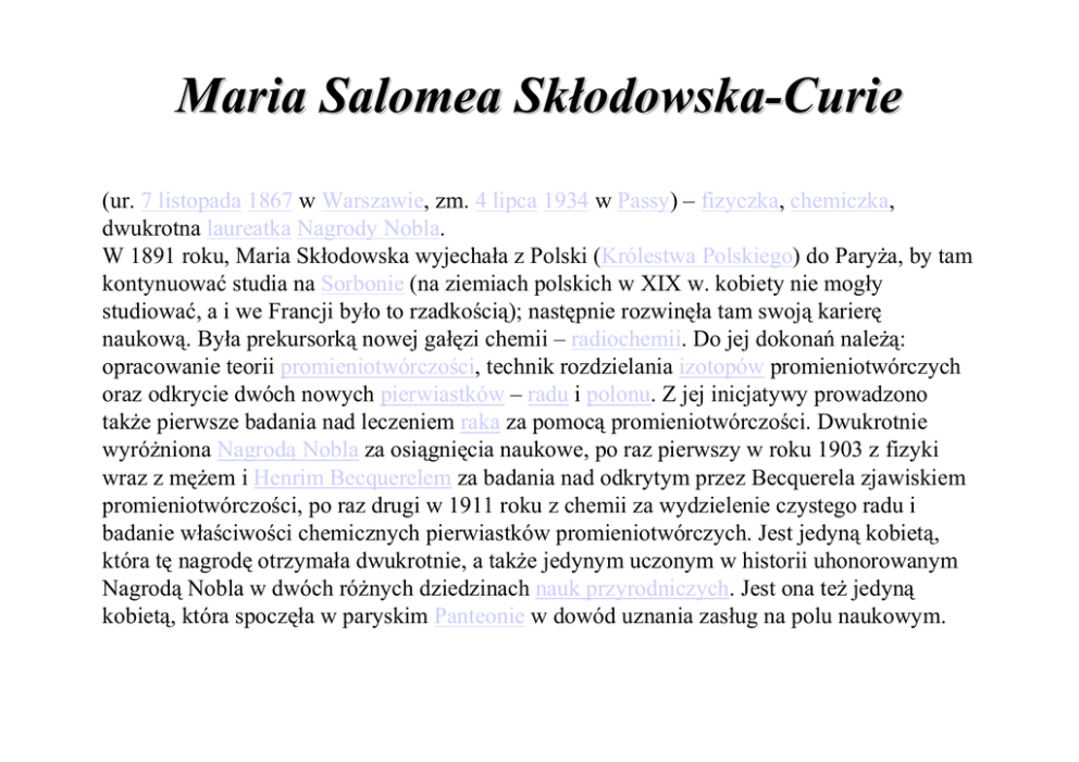 Maria Salomea Skłodowska-Curie (ur. 7 listopada 1867 w Warszawie, zm. 4 lipca 1934 w Passy) – fizyczka, chemiczka, dwukrotna laureatka Nagrody Nobla. W 1891 roku, Maria Skłodowska wyjechała z Polski (Królestwa Polskiego) do Paryża, by tam kontynuować studia na Sorbonie (na ziemiach polskich w XIX w. kobiety nie mogły studiować, a i we Francji było to rzadkością); następnie rozwinęła tam swoją karierę naukową. Była prekursorką nowej gałęzi chemii – radiochemii. Do jej dokonań należą: opracowanie teorii promieniotwórczości, technik rozdzielania izotopów promieniotwórczych oraz odkrycie dwóch nowych pierwiastków – radu i polonu. Z jej inicjatywy prowadzono także pierwsze badania nad leczeniem raka za pomocą promieniotwórczości. Dwukrotnie wyróżniona Nagrodą Nobla za osiągnięcia naukowe, po raz pierwszy w roku 1903 z fizyki wraz z mężem i Henrim Becquerelem za badania nad odkrytym przez Becquerela zjawiskiem promieniotwórczości, po raz drugi w 1911 roku z chemii za wydzielenie czystego radu i badanie właściwości chemicznych pierwiastków promieniotwórczych. Jest jedyną kobietą, która tę nagrodę otrzymała dwukrotnie, a także jedynym uczonym w historii uhonorowanym Nagrodą Nobla w dwóch różnych dziedzinach nauk przyrodniczych. Jest ona też jedyną kobietą, która spoczęła w paryskim Panteonie w dowód uznania zasług na polu naukowym. Maria Skłodowska urodziła się w Warszawie (wtedy znajdującej się w Królestwie Polskim, będącym częścią Imperium Rosyjskiego) jako piąte i ostatnie dziecko w znanej rodzinie nauczycielskiej, wywodzącej się z drobnej szlachty. Jej ojciec Władysław, pochodził z rodziny, która miała prawo do posługiwania się herbem Dołęga, zaś matka z rodziny z herbem Topór. Dziadek Józef Skłodowski był szanowanym lubelskim pedagogiem. Ojciec Władysław Skłodowski był nauczycielem matematyki i fizyki oraz dyrektorem kolejno dwóch warszawskich gimnazjów męskich, zmuszony przez władze carskie prowadził również w domu stancję dla chłopców. Matka Bronisława Boguska, była przełożoną warszawskiej pensji dla dziewcząt z dobrych domów. Oboje rodzice wychowywali swoje dzieci w duchu głębokiego patriotyzmu. Rodzeństwem Marii byli: Zofia (1861–1876), Józef (1863–1937) – znany warszawski lekarz, Bronisława (1865–1939) – lekarka i działaczka społeczna i Helena (1866–1961) – nauczycielka. Kiedy Maria miała 9 lat, najstarsza siostra Zofia zmarła na tyfus. Z kolei dwa lata później, gdy Maria miała 11 lat zmarła jej matka, która od lat chorowała na gruźlicę. Ojciec był ateistą, matka zaś głęboko wierzącą katoliczką. Po śmierci siostry i matki, Maria również została ateistką. Według innych źródeł była agnostyczką. Gdy Maria miała 10 lat rozpoczęła naukę na pensji dla dziewcząt, którą wcześniej prowadziła jej matka. Następnie kształciła się w III Żeńskim Gimnazjum Rządowym, które ukończyła w 1883 roku ze złotym medalem. Kolejny rok spędziła na wsi u ziemiańskiej rodziny jej ojca, gdzie regenerowała siły fizyczne i psychiczne po bolesnych przeżyciach związanych ze śmiercią matki i siostry. Po powrocie do Warszawy udzielała korepetycji z matematyki, fizyki, języków obcych (znała polski, rosyjski, niemiecki, angielski, francuski). W Warszawie Maria poznała Bronisławę Piasecką – nauczycielkę, którą przepełniały idee pozytywizmu. Pod jej wpływem Maria wraz z siostrami – Bronią i Helą wstąpiły na Uniwersytet Latający. Był to czas, kiedy młode Skłodowskie poznały wybitnych profesorów, którzy przekazali im zakazaną przez władzę wiedzę. Zafascynowane nauką, Maria i Bronia zawarły umowę, w myśl, której najpierw na studia do Paryża wyjedzie starsza z nich, a młodsza będzie pracować w kraju na jej utrzymanie. Po zakończonych studiach we Francji, Bronia miałaby utrzymywać Marię. W związku z tym została guwernantką najpierw w prawniczej rodzinie z Krakowa, a następnie u ziemiańskiej rodziny Żorawskich, mieszkających w majątku ziemskim w Szczukach. Tam Maria uczyła dwie córki Żorawskich, a w wolnych chwilach, za zgodą Żorawskiego uczyła wiejskie dzieci czytania, pisania i liczenia; działalność ta była zabroniona i bardzo surowo karana przez carskie władze. W Szczukach Maria poznała syna Żorawskich, Kazimierza, wtedy młodego studenta matematyki. Młodzi zakochali się w sobie i dość szybko zaręczyli. Rodzice Kazimierza jednak stanowczo odrzucili pomysł ślubu ich syna z ubogą guwernantką, a sam Kazimierz nie potrafił się im przeciwstawić. Upokorzona Maria pracowała w Szczukach jeszcze piętnaście miesięcy. Żyjąc nadzieją na małżeństwo, raz jeszcze spotkała się z Kazimierzem w Zakopanem w 1891 roku. Jednak potwierdziło ono tylko obawy Marii, że do małżeństwa nie dojdzie. Ostatecznie zerwała znajomość z młodym Żorawskim. W 1889 roku upokorzona i odtrącona Maria, po czterech latach żalu, bólu, samotności i ciężkiej pracy powróciła do Warszawy. Tutaj zaczęła uzupełniać swoją wiedzę z chemii i fizyki w laboratoriach Muzeum Przemysłu i Rolnictwa przy Krakowskim Przedmieściu. Pomagał jej cioteczny brat Józef Boguski, były asystent Dymitra Mendelejewa oraz chemik Napoleon Milicer, były współpracownik Roberta Bunsena. To właśnie ci uczeni nauczyli młodą Skłodowską analizy chemicznej, którą później mogła wykorzystać przy pracach umożliwiających jej wyizolowanie radu i polonu. Na początku 1890 roku, zgodnie z wcześniejszą umową, Bronisława, która kilka miesięcy wcześniej poślubiła Kazimierza Dłuskiego (także lekarza), zaprosiła ją do swojego paryskiego mieszkania, oferując pełne utrzymanie. Maria jeszcze przez rok się wahała, dokształcała, udzielała korepetycji, aż na początku 1891 roku zdecydowała się wyjechać do Paryża. . W 1896 roku Henri Becquerel (1852–1908), fizyk francus