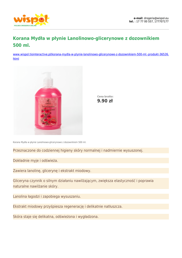 e-mail: [email protected] tel. : 17 77 00 557, 177707177 Korana Mydła w płynie Lanolinowo-glicerynowe z dozownikiem 500 ml. www.wispol.tiointeractive.pl/korana-mydla-w-plynie-lanolinowo-glicerynowe-z-dozownikiem-500-ml.-produkt-36526. html Cena brutto: 9.90 zł Korana Mydła w płynie Lanolinowo-glicerynowe z dozownikiem 500 ml. Przeznaczone do codziennej higieny skóry normalnej i nadmiernie wysuszonej. Dokładnie myje i odświeża. Zawiera lanolinę, glicerynę i ekstrakt miodowy. Gliceryna czynnik o silnym działaniu nawilżającym, zwiększa elastyczność i poprawia naturalne nawilżanie skóry. Lanolina łagodzi i zapobiega wysuszaniu. Ekstrakt miodowy przyśpiesza regenerację i delikatnie natłuszcza. Skóra staje się delikatna, odświeżona i wygładzona. Mydło nie zmienia naturalnego pH skóry. pojemność: 500 ml *Ceny obowiązują wyłącznie przy składaniu zamówień przez sklep internetowy. Ceny w sklepach mogą nieznacznie różnić się od cen prezentowanych na stronach sklepu internetowego. Przedstawiona oferta w sklepie internetowym nie stanowi oferty w rozumieniu Kodeksu Cywilnego, i jest jedynie zaproszeniem do rozpoczęcia rokowań (zgodnie z art. 71 k.c.). Zastrzegamy sobie prawo do niezrealizowania zamówień z ważnych przyczyn ekonomicznych.