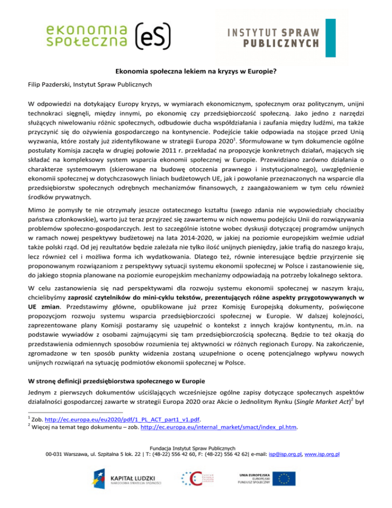 Ekonomia społeczna lekiem na kryzys w Europie? Filip Pazderski, Instytut Spraw Publicznych W odpowiedzi na dotykający Europy kryzys, w wymiarach ekonomicznym, społecznym oraz politycznym, unijni technokraci sięgnęli, między innymi, po ekonomię czy przedsiębiorczość społeczną. Jako jedno z narzędzi służących niwelowaniu różnic społecznych, odbudowie ducha współdziałania i zaufania między ludźmi, ma także przyczynić się do ożywienia gospodarczego na kontynencie. Podejście takie odpowiada na stojące przed Unią wyzwania, które zostały już zidentyfikowane w strategii Europa 20201. Sformułowane w tym dokumencie ogólne postulaty Komisja zaczęła w drugiej połowie 2011 r. przekładać na propozycje konkretnych działań, mających się składać na kompleksowy system wsparcia ekonomii społecznej w Europie. Przewidziano zarówno działania o charakterze systemowym (skierowane na budowę otoczenia prawnego i instytucjonalnego), uwzględnienie ekonomii społecznej w dotychczasowych liniach budżetowych UE, jak i powołanie przeznaczonych na wsparcie dla przedsiębiorstw społecznych odrębnych mechanizmów finansowych, z zaangażowaniem w tym celu również środków prywatnych. Mimo że pomysły te nie otrzymały jeszcze ostatecznego kształtu (swego zdania nie wypowiedziały chociażby państwa członkowskie), warto już teraz przyjrzeć się zawartemu w nich nowemu podejściu Unii do rozwiązywania problemów społeczno-gospodarczych. Jest to szczególnie istotne wobec dyskusji dotyczącej programów unijnych w ramach nowej pespektywy budżetowej na lata 2014-2020, w jakiej na poziomie europejskim weźmie udział także polski rząd. Od jej rezultatów będzie zależała nie tylko ilość unijnych pieniędzy, jakie trafią do naszego kraju, lecz również cel i możliwa forma ich wydatkowania. Dlatego też, równie interesujące będzie przyjrzenie się proponowanym rozwiązaniom z perspektywy sytuacji systemu ekonomii społecznej w Polsce i zastanowienie się, do jakiego stopnia planowane na poziomie europejskim mechanizmy odpowiadają na potrzeby lokalnego sektora. W celu zastanowienia się nad perspektywami dla rozwoju systemu ekonomii społecznej w naszym kraju, chcielibyśmy zaprosić czytelników do mini-cyklu tekstów, prezentujących różne aspekty przygotowywanych w UE zmian. Przedstawimy główne, opublikowane już przez Komisję Europejską dokumenty, poświęcone propozycjom rozwoju systemu wsparcia przedsiębiorczości społecznej w Europie. W dalszej kolejności, zaprezentowane plany Komisji postaramy się uzupełnić o kontekst z innych krajów kontynentu, m.in. na podstawie wywiadów z osobami zajmującymi się tam przedsiębiorczością społeczną. Będzie to też okazją do przedstawienia odmiennych sposobów rozumienia tej aktywności w różnych regionach Europy. Na zakończenie, zgromadzone w ten sposób punkty widzenia zostaną uzupełnione o ocenę potencjalnego wpływu nowych unijnych rozwiązań na sytuację podmiotów ekonomii społecznej w Polsce. W stronę definicji przedsiębiorstwa społecznego w Europie Jednym z pierwszych dokumentów uściślających wcześniejsze ogólne zapisy dotyczące społecznych aspektów działalności gospodarczej zawarte w strategii Europa 2020 oraz Akcie o Jednolitym Rynku (Single Market Act)2 był 1 2 Zob. http://ec.europa.eu/eu2020/pdf/1_PL_ACT_part1_v1.pdf. Więcej na temat tego dokumentu – zob. http://ec.europa.eu/internal_market/smact/index_pl.htm. Fundacja Instytut Spraw Publicznych 00-031 Warszawa, ul. Szpitalna 5 lok. 22 | T: (48-22) 556 42 60, F: (48-22) 556 42 62| e-mail: [email protected], www.isp.org.pl komunikat „Inicjatywa na rzecz przedsiębiorczości społecznej”, wydany przez Komisję Europejską w ostatnich dniach października 2011 roku. Już na wstępie dostrzeżono w nim skalę, na jaką zdążył się rozwinąć rynek przedsiębiorczości społecznej w Europie. Podkreślono, że należące do niego podmioty zatrudniają w całej Unii więcej niż 11 milionów osób, ponad 6% ogólnej liczby pracujących, a co czwarte europejskie przedsiębiorstwo ma charakter społeczny3. Nawet, jeśli ta ocena wpływu oparta została na wynikach zaledwie trzech badań, nieprzedstawiających raczej wszystkich aspektów zjawiska, to już samą wartością jest dostrzeżenie w ten sposób przez Komisję roli sektora w europejskiej gospodarce. Zauważono przy tym, że podmioty zaliczane w poszczególnych krajach do ekonomii / przedsiębiorczości społecznej cechuje olbrzymie zróżnicowanie. Dlatego też Komisja nie zdecydowała się na sformułowanie jednolitej definicji przedsiębiorstwa społecznego. Zamiast tego wskazała kilka ogólnych kryteriów, które takie podmioty powinny spełniać4: • Należący do wspólnego interesu cel socjalny lub społeczny jest racją bytu działalności komercyjnej, a ta ostatnia często charakteryzuje się wysokim poziomem innowacyjności społecznej, • Zyski są w większości reinwestowane w realizację tego celu społecznego, • Sposób organizacji wewnętrznej lub system własności odzwierciedla ich misję, opierając się na demokratycznych lub partycypacyjnych zasadach i jest skierowany na dążenie do osiągnięcia sprawiedliwości społecznej. Komisja zwróciła jednocześnie uwagę, że do tej kategorii należeć mogą dwa rodzaje podmiotów. Z jednej strony, zalicza się do niej przedsiębiorstwa świadczące usługi społeczne lub dostarczające towary i usługi przeznaczone dla słabszych (wykluczonych) grup społecznych. Z drugiej, takie, gdzie wprowadzono sposób produkcji towarów i usług, pozwalający na włączanie w jego trakcie osób zaliczanych do wykluczonych grup społecznych (np. osób niepełnosprawnych, długotrwale bezrobotnych lub posiadających mniejsze szanse na rynku pracy ze względu na inne okoliczności życiowe). Taki zapis może brzmieć znajomo dla osób, które czytały wcześniej projekt polskiej ustawy o 