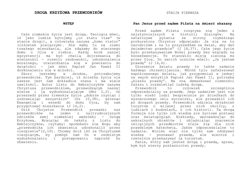 DROGA KRZYŻOWA PRZEWODNIKÓW STACJA PIERWSZA WSTĘP Pan Jezus przed sądem Piłata na śmierć skazany Całe ziemskie życie jest drogą. Teologia mówi, iż jako ludzie bytujemy „in statu viae” (w stanie drogi), a człowieka nazywa „homo viator” (człowiek pielgrzym). Nie mamy tu na ziemi trwałego mieszkania, ale zdążamy do wiecznego domu u Ojca w niebie. Każdy krok naszej egzystencji ma być chwilą dojrzewania do wieczności - rozwoju osobowości, udoskonalenia moralnego, utwierdzania się w powołaniu do świętości - jak mówi Papież Jan Paweł II doskonaleniu się w miłości. Skoro jesteśmy w drodze, potrzebujemy przewodnika. Tym bardziej, iż ścieżka życia nie zawsze jest nam dokładnie znana i ma wiele zawiłości. Autor Listu do Hebrajczyków nazywa Chrystusa przewodnikiem, przewodzącym naszej wierze i ją wydoskonalającym (Hbr 2,2). On przeszedł przez ziemskie życie „dobrze czyniąc i uzdrawiając wszystkich” (Dz 10,38), głosząc Ewangelię i wszedł do domu Ojca, by nam przygotować mieszkanie (J 14,2). Dziś Chrystus Przewodnik prowadzi nas przewodników na jeden z najtrudniejszych odcinków swej ziemskiej wędrówki Drogę Krzyżową. Wracając do tekstu z Listu do Hebrajczyków, czytamy: spodobało się Bogu aby „przewodnika ich zbawienia udoskonalił przez cierpienie”(2,10). Chcemy dziś iść za Chrystusem cierpiącym, by pomógł nam On w osobistym wydoskonalaniu i postępowaniu naprzód ku zbawieniu. Przed sądem Piłata rozgrywa się jeden z najsłynniejszych w historii dialogów. Na natarczywe pytania ze strony rzymskiego prokuratora Chrystus odpowiada: Ja się na to narodziłem i na to przyszedłem na świat, aby dać świadectwo prawdzie” (J 18,37). Całe jego życie było przekazywaniem Bożej prawdy bez względu na konsekwencje. To stanowiło misję zleconą mu przez Ojca. Do swoich uczniów mówił: „Ja jestem prawdą” (J 14,6). Głoszenie światu prawdy to także zadanie każdego chrześcijanina. Wśród tylu zafałszowań współczesnego świata, jak przypomniał w jednej ze swych encyklik Papież Jan Paweł II, potrzeba „blasku prawdy”. Ma ona demaskować ciemności fałszu i rozświetlać ludzką drogę. Przewodnik to człowiek szczególnie odpowiedzialny za prawdę. Jego zadaniem jest nie tylko wieść ludzi bezpiecznie po ścieżkach do wyznaczonego celu wycieczki, ale prowadzić ich po drogach prawdy. Przewodnik udziela objaśnień turystom o mijanej przez nich okolicy, o ludziach i budowlach, o ich historii. Tą drogą formuje nie tylko ich wiedzę ale życiowe postawy oraz światopogląd. Niekiedy, wprowadzając do sakralnych obiektów i objaśniając znaczenie religijnych przedmiotów staje się dla nich prawdziwym katechetą. Jakże odpowiedzialne to zadanie. Winien więc nie tylko sam zdobywać wiedzę poznawać prawdę, ale wiernie i rzetelnie przekazywać ją turystom. Panie, który sam jesteś drogą i prawdą, spraw, bym był wierny posłannictwu prawdy. STACJA DRUGA STACJA TRZECIA Jezus przyjmuje krzyż na swoje ramiona Jezus upada pod krzyżem po raz pierwszy Chrystus sam przyjmuje krzyż na swoje ramiona. Gdyby nie wyraził swej woli, nie doszłoby do rozpoczęcia Krzyżowej Drogi. Spełnia zadanie, które wyznaczył mu Ojciec swoją wolą. To nie jest tylko wtłoczenie krzyża na Jezusowe barki, ale świadome podjęcie go, spełnienie powołania wyznaczonego przez odwieczny plan zbawienia ludzi. Mówi się o różnych powołaniach ludzkich. Każde z nich na swój sposób jest naśladowaniem powołania Chrystusa, a w ostateczności pójścia za planem Ojca. Być przewodnikiem to też powołanie. Przewodzić ludziom, ukierunkowywać ich drogi, to wielka sprawa. Można mówić o przewodnictwie jako zawodzie. Jest to oczywiście prawda. Każdy człowiek ma swój zawód. Czy nie lepiej jednak mówić o powołaniu przewodnika? Bóg wezwał mnie, bym na mojej drodze, tej właśnie a nie innej drodze życia, czynił jak najwięcej dobra dla innych i bym w ten właśnie sposób sam wydoskonalał się w miłości. Czy nie lepiej mówić o służbie? Przewodnik służy człowiekowi, a w nim służy samemu Chrystusowi. Gdy użyjemy słowa zawód, to wydaje się, że nasz stosunek do turystów może przekształcać się w bezosobowe relacje. Będziemy pracę dla nich traktować jedynie jako okazję do zarobku, bądź do szukania uznania dla samych siebie. Powstaje jakby rozdział między nami a nimi. Relacja służby natomiast otwiera ku drugiemu człowiekowi, zbliża doń duchowo i wiąże z nim. Pozwala na odkrycie jego osobistej godności. Chryste, niosący krzyż, ucz mnie dziś podczas tej Drogi Krzyżowej jak lepiej służyć człowiekowi spełniając moje przewodnickie powołanie. Każdy upadek Chrystusa przywodzi na myśl ludzkie grzechy. To ich ciężar przygniata do ziemi, wyczerpuje siły, utrudnia powstanie. Chrystus przyjmuje upadki, powstaje z nich i idzie dalej. W ten sposób poucza człowieka o złu grzechu, uczy go podnoszenia się ze zła, to znaczy nieustannego nawracania się. Każda ze scen upadku na krzyżowej drodze ma pomóc człowiekowi, by nie uległ pokusie utraty poczucia winy. Turystyka, czas wolny, to chwile, gdy człowiek uwalnia swe barki od ciężaru codziennych obowiązków. Czuje się wolny choćby na kilka godzin. Niestety dla wielu czas ten wiąże się z poważną pokusą uwolnienia od obowiązków moralnych. Jako prowadzący wycieczki znamy dobrze te obrazy: życia na wczasowym „luzie”, wrzaskliwości, alkoholowych libacji, zapomnienia o szóstym przykazaniu, zaniedbania najprostszych religijnych praktyk. Wielu turystów myśli: „Tam jestem obcy, tam mnie nie znają, tam mogę się wyżyć”. Jakże bardzo ważne są słowa powtarzane wielokrotnie przez Papieża Jana Pawła II: wolność to nie samowola, wolność nie może polegać na porzuceniu odpowiedzialności i zerwaniu z moralnym prawem. Wręcz przeciwnie, wolność to świadome dążenie do dobra. Przewodnik pr