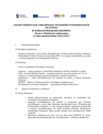 ZASADY REKRUTACJI i ORGANIZACJI WYJAZDÓW STYPENDIALNYCH NA STUDIA W RAMACH PROGRAMU ERASMUS+ Akcja1: Mobilność edukacyjna w roku akademickim 2016/2017 I. Postanowienia ogólne: §1 Przedmiot regulaminu Niniejszy dokument, zwany dalej „Regulaminem” określa zasady rekrutacji studentów Dolnośląskiej Szkoły Wyższej zwanej dalej DSW, na wyjazdy stypendialne na studia w ramach programu Unii Europejskiej Erasmus+. §2 Definicje Użyte w regulaminie określenia oznaczają Erasmus+ - unijny program w dziedzinie kształcenia, szkoleń, młodzieży i sportu SMS - Student Mobility Studies – wyjazdy studentów na część studiów od 3 do 12 miesięcy w obrębie jednego poziomu kształcenia i kapitału mobilności Stypendysta - osoba zakwalifikowana do wyjazdu na studia w ramach programu Erasmus+ BMWD - Biuro ds. Międzynarodowej Współpracy Dydaktycznej Koordynator Uczelniany Programu – mgr Jadwiga Dobrowolska-Dyrcz II. Zasady uczestnictwa w rekrutacji §3 Proces Rekrutacji 1. Osobą odpowiedzialną za organizację rekrutacji na wydziałach jest Wydziałowy Koordynator Programu. 2. Organem kwalifikującym do udziału w programie jest Komisja Kwalifikująca, zwana dalej Komisją, powoływana przez Wydziałowego Koordynatora Programu w celu przeprowadzenia egzaminu językowego i rozmowy kwalifikacyjnej. W skład Komisji wchodzą: Wydziałowy Koordynator Programu, lektor języka obcego oraz przedstawiciel władz wydziału. 3. Rekrutacja ogłaszana jest dwa razy do roku przez BMWD. W marcu ogłaszana jest rekrutacja główna, w październiku – rekrutacja dodatkowa. §4 Kryteria 1. Kryteria formalne programu: a. Student powinien być oficjalnie zarejestrowany na kierunku studiów, który prowadzi do uzyskania tytułu licencjata, magistra lub doktoranta w DSW, b. w momencie wyjazdu na studia zagraniczne powinien być studentem co najmniej drugiego roku studiów, warunek ten jednak nie tyczy osób, które kontynuują proces kształcenia w DSW, c. w czasie trwania wyjazdu zagranicznego nie może przebywać na urlopie dziekańskim, 2. Kryteria wydziałowe a. kryteriami przy ocenie studenta w procesie rekrutacji są: znajomość języka obcego, w którym będą prowadzone zajęcia na uczelni partnerskiej (waga 50%), średnia ocen z ostatniego roku studiów (waga 30%), zajęcia nadprogramowe, motywacja studenta i doświadczenie zagraniczne (waga 20%); b. inne wewnątrzwydziałowe kryteria udziału w programie Erasmus+, jeśli takie ustalono. 3. Wymagane terminy i dokumenty a. informacje dostępne są w BMWD, u Wydziałowych Koordynatorów Programu oraz na stronie internetowej BMWD: www.erasmusplus.dsw.edu.pl 4. Sposób przeprowadzenia oceny kandydatów: a. Procedura rekrutacji składa się z dwóch etapów – preselekcji kandydatów na podstawie złożonych przez studentów dokumentów oraz selekcji właściwej, która obejmuje przeprowadzenie egzaminu językowego oraz rozmowy kwalifikacyjnej. b. Po zsumowaniu wszystkich punktów tworzona jest lista rankingowa pozwalająca na przygotowanie listy głównej i rezerwowej. 5. Termin i sposób ogłaszania decyzji a. Komisja Kwalifikująca po zamknięciu postępowania rekrutacyjnego sporządza protokół wraz z listą osób zakwalifikowanych oraz listą rezerwową, b. Lista zakwalifikowanych studentów wraz z listą rezerwową jest przekazywana do BMWD, c. W terminie do 7 dni od ogłoszenia decyzji Komisji kandydatowi przysługuje prawo do odwołania się od decyzji. Organem odwoławczym jest dziekan macierzystego wydziału. 6. Uczelnie partnerskie a. Wykaz wszystkich dostępnych miejsc na studia w uczelniach zagranicznych dostępny jest w BMWD, i w informatorze wydawanym na potrzeby procesu rekrutacji. 7. Przygotowanie do wyjazdu a. Przed wyjazdem BMWD organizuje obowiązkowe szkolenia dla stypendystów z procedur i zasad programu, wypełniania formularzy, a także organizacyjnych, i kulturowych aspektów studiowania za granicą. Liczba oferowanych przez BMWD szkoleń zależy od potrzeb stypendystów i sytuacji bieżącej. b. Stypendysta, uczelnia wysyłająca oraz uczelnia przyjmująca przygotowują i podpisują ”Porozumienie o programie zajęć”, Learning Agrement for Studies, część Before the Mobility czyli program studiów, który student będzie realizował na uczelni partnerskiej. c. Stypendysta - we współpracy z BMWD i uczelnią przyjmującą aranżuje sprawy zamieszkania w kraju docelowym, ubezpieczenia, podróży, a także jeśli wymagane: wizy. d. Przed wyjazdem stypendysta jest przez BMWD zaproszony do złożenia obowiązkowego testu biegłości językowej na platformie Erasmus+ Online Linguistic Support. §5 Zasady finansowania a. Każdemu stypendyście programu Erasmus+ przysługuje dofinansowanie z budżetu programu. Przyznane stypendium powinno obejmować pełny okres kształcenia zagranicznego w realizowany w obrębie danego roku akademickiego, co w sposób szczegółowy opisuje umowa finansowa pomiędzy stypendystą, a Uczelnią, b. Obowiązują następujące ujednolicone stawki miesięczne na wyjazd SMS w roku akademickim 2016/2017: Grupa 1: Austria, Dania, Finlandia, Francja Norwegia, Szwajcaria, Szwecja, Wielka Brytania, Włochy - stypendium miesięczne wynosi - 500 EUR Grupa 2: Belgia, Chorwacja, Czechy, Grecja, Hiszpania, Holandia, Niemcy, Portugalia, Słowenia, Turcja – stypendium miesięczne wynosi - 400 EUR Grupa 3: Bułgaria, Estonia, Litwa, Rumunia, Słowacja, Węgry - stypendium miesięczne wynosi - 300 EUR 6. Czas pobytu a wysokość stypendium a. stypendium rozlicza się po powrocie z uczelni przyjmującej. Przy określaniu długości pobytu pod uwagę brane jest zaświadczenie wystawione przez uczelnię przyjmującą. Okres pobytu rozlicza się z dokładnością do 1 dnia, b. podstawą do pełnego rozliczenia się z programu jest przedłożenie przez studenta następujących dokumentów: 1) potwierdzenie pobytu wydane przez uczelnię przyjmującą - z datą rozpoczęcia i zakończenia pobytu 2) przedło