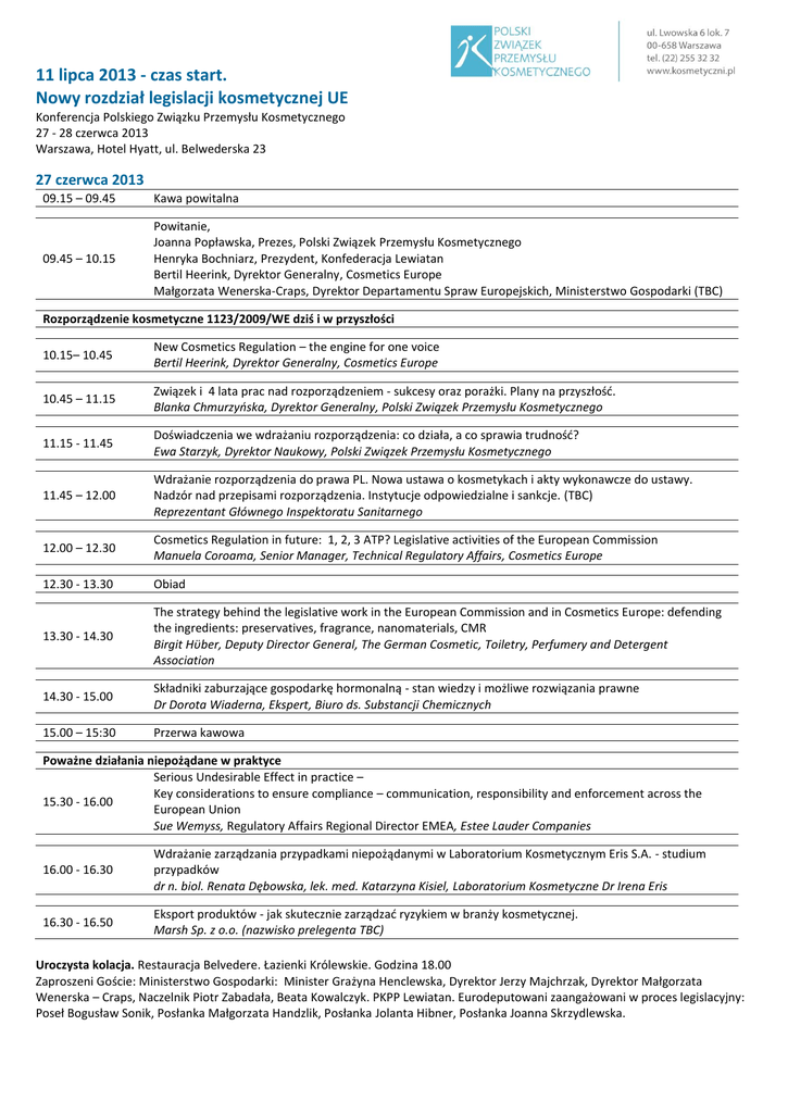 11 lipca 2013 - czas start. Nowy rozdział legislacji kosmetycznej UE Konferencja Polskiego Związku Przemysłu Kosmetycznego 27 - 28 czerwca 2013 Warszawa, Hotel Hyatt, ul. Belwederska 23 27 czerwca 2013 09.15 – 09.45 Kawa powitalna 09.45 – 10.15 Powitanie, Joanna Popławska, Prezes, Polski Związek Przemysłu Kosmetycznego Henryka Bochniarz, Prezydent, Konfederacja Lewiatan Bertil Heerink, Dyrektor Generalny, Cosmetics Europe Małgorzata Wenerska-Craps, Dyrektor Departamentu Spraw Europejskich, Ministerstwo Gospodarki (TBC) Rozporządzenie kosmetyczne 1123/2009/WE dziś i w przyszłości 10.15– 10.45 New Cosmetics Regulation – the engine for one voice Bertil Heerink, Dyrektor Generalny, Cosmetics Europe 10.45 – 11.15 Związek i 4 lata prac nad rozporządzeniem - sukcesy oraz porażki. Plany na przyszłość. Blanka Chmurzyńska, Dyrektor Generalny, Polski Związek Przemysłu Kosmetycznego 11.15 - 11.45 Doświadczenia we wdrażaniu rozporządzenia: co działa, a co sprawia trudność? Ewa Starzyk, Dyrektor Naukowy, Polski Związek Przemysłu Kosmetycznego 11.45 – 12.00 Wdrażanie rozporządzenia do prawa PL. Nowa ustawa o kosmetykach i akty wykonawcze do ustawy. Nadzór nad przepisami rozporządzenia. Instytucje odpowiedzialne i sankcje. (TBC) Reprezentant Głównego Inspektoratu Sanitarnego 12.00 – 12.30 12.30 - 13.30 Cosmetics Regulation in future: 1, 2, 3 ATP? Legislative activities of the European Commission Manuela Coroama, Senior Manager, Technical Regulatory Affairs, Cosmetics Europe , Obiad 13.30 - 14.30 The strategy behind the legislative work in the European Commission and in Cosmetics Europe: defending the ingredients: preservatives, fragrance, nanomaterials, CMR Birgit Hϋber, Deputy Director General, The German Cosmetic, Toiletry, Perfumery and Detergent Association 14.30 - 15.00 Składniki zaburzające gospodarkę hormonalną - stan wiedzy i możliwe rozwiązania prawne Dr Dorota Wiaderna, Ekspert, Biuro ds. Substancji Chemicznych 15.00 – 15:30 Przerwa kawowa Poważne działania niepożądane w praktyce Serious Undesirable Effect in practice – Key considerations to ensure compliance – communication, responsibility and enforcement across the 15.30 - 16.00 European Union Sue Wemyss, Regulatory Affairs Regional Director EMEA, Estee Lauder Companies 16.00 - 16.30 Wdrażanie zarządzania przypadkami niepożądanymi w Laboratorium Kosmetycznym Eris S.A. - studium przypadków dr n. biol. Renata Dębowska, lek. med. Katarzyna Kisiel, Laboratorium Kosmetyczne Dr Irena Eris 16.30 - 16.50 Eksport produktów - jak skutecznie zarządzać ryzykiem w branży kosmetycznej. Marsh Sp. z o.o. (nazwisko prelegenta TBC) Uroczysta kolacja. Restauracja Belvedere. Łazienki Królewskie. Godzina 18.00 Zaproszeni Goście: Ministerstwo Gospodarki: Minister Grażyna Henclewska, Dyrektor Jerzy Majchrzak, Dyrektor Małgorzata Wenerska – Craps, Naczelnik Piotr Zabadała, Beata Kowalczyk. PKPP Lewiatan. Eurodeputowani zaangażowani w proces legislacyjny: Poseł Bogusław Sonik, Posłanka Małgorzata Handzlik, Posłanka Jolanta Hibner, Posłanka Joanna Skrzydlewska. 28 czerwca 2013 Bezpieczeństwo kosmetyków - legislacja i praktyka 9.00 - 9.30 Kawa powitalna 9.30-10.15 Raw material safety without animal tests - modern strategies and challenges Dr Uwe Rossow, Director Safety Cosmetics & Toiletries, Johnson&Johnson Germany 10.15 – 11:00 Ekspozycja – kluczowy element oceny bezpieczeństwa kosmetyków. Anna Frydrych, Kierownik ds. Bezpieczeństwa i Ewaluacji Produktu, Cederroth Polska 11.00 – 12:00 Safety assessment of cosmetics: What’s new in the SCCS Notes of guidance? Prof. Vera Rogiers, Vrije Universiteit Bruksela 12.00 – 12.30 Problemy Ekspozycji Inhalacyjnej Dr Piotr Koziej, Centrum Kosmetyków Dr Piotr Koziej 12.30 - 13.00 Dokumentacja produktu kosmetycznego w praktyce: efekt prac Grupy Roboczej Ocena Bezpieczeństwa Ewa Starzyk, Dyrektor Naukowy, Polski Związek Przemysłu Kosmetycznego
