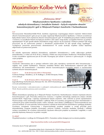 „Zbliżenia 2014“ Międzynarodowe Spotkanie z udziałem młodych dziennikarzy i świadków historii – byłych więźniów obozów koncentracyjnych i gett w Miejscach Pamięci Auschwitz i Sachsenhausen Co? Stowarzyszenie Maximilian-Kolbe-Werk, katolicka organizacja wspomagająca byłych więźniów hitlerowskich obozów koncentracyjnych i gett, już po raz piąty organizuje Międzynarodowe Spotkanie, w którym uczestniczyć będą młodzi ludzie i byli więźniowie obozów koncentracyjnych i gett. W niedalekiej przyszłości osobisty kontakt i rozmowy ze świadkami historii nie będą już możliwe. Jaki wpływ mają media, szczególnie Internet, na pamięć i upamiętnianie? W jaki sposób młodzi dziennikarze mogą włączyć się do dyskusji o kulturze pamięci? Jak mogą przyczynić się do zachowania pamięci o zbrodniach nazistowskich? W jaki sposób mogą zapobiegać i występować przeciwko prawicowemu ekstremizmowi? W czasie dyskusji wspólnie szukać będziemy odpowiedzi na postawione pytania. Kto? Do udziału zapraszamy młodych dziennikarzy, studentów dziennikarstwa i osoby odbywające praktyki dziennikarskie, w wieku od 18 do 30 lat, z Niemiec i Polski oraz innych krajów Środkowej i Wschodniej Europy. Liczba uczestników ograniczona jest do 20 osób. Wymagany jest udział w zarówno w pierwszej jak i w drugiej części projektu. Gdzie i kiedy? Auschwitz zakorzeniony jest w pamięci milionów ludzi, jako największy nazistowski obóz koncentracyjny i zagłady oraz symbol ludobójstwa. Położony niedaleko Berlina obóz Sachsenhausen zajmował jako obóz szkoleniowy dla komendantów i strażników obozów koncentracyjnych szczególne miejsce w nazistowskim systemie obozów koncentracyjnych. Część 1: 22 do 28 stycznia 2014 w Oświęcimiu Centrum Dialogu i Modlitwy, ul. M. Kolbego 1, 32-602 Oświęcim, Polska www.cdim.pl Część 2: 16 do 20 marca 2014 w Oranienburgu / Sachsenhausen Jugendherberge Sachsenhausen, Bernauer Str. 162, 16515 Oranienburg, Deutschland www.jh-sachsenhausen.de Koszty wyżywienia i zakwaterowania w pokojach wieloosobowych opłaci Stowarzyszenie Maximilian-KolbeWerk. Koszty podróży ponoszą sami uczestnicy. Jak? Młodzi dziennikarze spotykają się w Miejscach Pamięci Auschwitz i Sachsenhausen z byłymi więźniami obozów koncentracyjnych i gett. Prowadzą intensywne rozmowy i wspólnie odwiedzają autentyczne miejsca zbrodni nazistowskich. Nagrywają i zapisują wspomnienia byłych więźniów, żeby uchronić je przed zapomnieniem. Wykorzystując różne technologie medialne i aplikacje Web 2.0 uczestnicy przygotowują prace dziennikarskie w wybranych przez siebie formatach (audio, wideo, artykuły i inne teksty) i publikują je w konwencjonalnych oraz nowych mediach. W razie potrzeby fachowej pomocy udzielą im doświadczeni dziennikarze i pedagog medialny. Uczestnicy świadomie wykorzystują i rozpowszechniają rezultaty projektu w swojej przyszłej pracy dziennikarskiej. Program projektu zawierający zarówno wykłady, warsztaty medialne, dyskusje i refleksje zachęca uczestników do wymiany doświadczeń. Językami roboczymi projektu są niemiecki i angielski, w razie potrzeby będziemy tłumaczyć na polski i rosyjski. Co dalej? Wypełnij formularz i wyślij go do 30 listopada 2013 r. Formularz-online dostępny jest na stronie projektu: http://maximilian-kolbe-werk-projekt2014.blogspot.de Cieszymy się na Twoje zgłoszenie! Maximilian-Kolbe-Werk • Karlstraße 40 • 79104 Freiburg •Deutschland • Tel.: +49/761/200-348 • Fax: -596 • E-Mail: [email protected] •www.maximilian-kolbe.werk.de