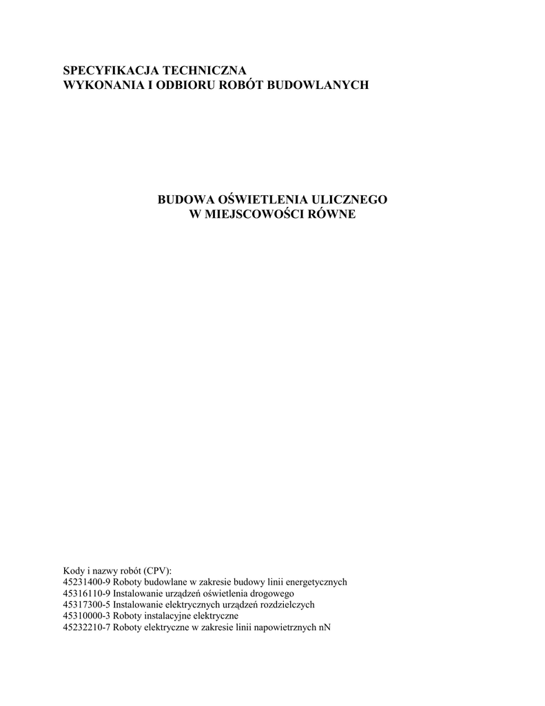 SPECYFIKACJA TECHNICZNA WYKONANIA I ODBIORU ROBÓT BUDOWLANYCH BUDOWA OŚWIETLENIA ULICZNEGO W MIEJSCOWOŚCI RÓWNE Kody i nazwy robót (CPV): 45231400-9 Roboty budowlane w zakresie budowy linii energetycznych 45316110-9 Instalowanie urządzeń oświetlenia drogowego 45317300-5 Instalowanie elektrycznych urządzeń rozdzielczych 45310000-3 Roboty instalacyjne elektryczne 45232210-7 Roboty elektryczne w zakresie linii napowietrznych nN SPIS TREŚCI 1. CZĘŚĆ OGÓLNA 1.1. Nazwa nadana zamówieniu przez zamawiającego 1.2. Przedmiot ST 1.3. Zakres stosowania ST 1.4. Przedmiot i zakres robót objętych ST 1.5. Określenia podstawowe, definicje 1.6. Ogólne wymagania dotyczące robót 1.7. Dokumentacja robót montażowych i prefabrykacyjnych 1.8. Nazwy i kody 2. WYMAGANIA DOTYCZĄCE WŁAŚCIWOŚCI MATERIAŁÓW 3. WYMAGANIA DOTYCZĄCE SPRZĘTU, MASZYN I NARZĘDZI 4. WYMAGANIA DOTYCZĄCE TRANSPORTU 5. WYMAGANIA DOTYCZĄCE WYKONANIA ROBÓT 6. KONTROLA JAKOŚCI ROBÓT 7. WYMAGANIA DOTYCZĄCE PRZEDMIARU I OBMIARU ROBÓT 8. SPOSÓB ODBIORU ROBÓT 9. PODSTAWA ROZLICZENIA ROBÓT 10. DOKUMENTY ODNIESIENIA BUDOWA OŚWIETLENIA ULICZNEGO 1. CZĘŚĆ OGÓLNA. 1.1. Nazwa nadana zamówieniu przez zamawiającego. Oświetlenia uliczne w miejscowości RÓWNE. 1.2. Przedmiot Specyfikacji Technicznej. Przedmiotem niniejszej Specyfikacji Technicznej są wymagania dotyczące wykonania i odbioru robót związanych z budową oświetlenia ulicznego w miejscowościach j/ w. 1.3. Zakres stosowania ST. Specyfikacja Techniczna jest stosowana jako dokument przetargowy przy zlecaniu i realizacji robót 1.4. Przedmiot i zakres robót objętych Ustalenia zawarte w niniejszej specyfikacji dotyczą zasad prowadzenia robót związanych wykonaniem oświetlenia wg zakresu określonego w dokumentacji projektowej. 1.5. Określenia podstawowe 1.5.1 Elektroenergetyczna linia napowietrzna - urządzenie napowietrzne, przeznaczone do przesyłania energii elektrycznej, składające się z przewodów, izolatorów, konstrukcji wsporczych i osprzętu. 1.5.2. Napięcie znamionowe linii U - napięcie międzyprzewodowe, na które linia jest zbudowana. 1.5.3. Przęsło - część linii napowietrznej, zawarta między sąsiednimi konstrukcjami wsporczymi. 1.5.4. Zwis f - odległość pionowa między przewodem a prostą łączącą punkty zawieszenia przewodu w środku rozpiętości przęsła. 1.5.5. Słup - konstrukcja wsporcza linii, osadzona w gruncie bezpośrednio lub za pomocą fundamentu. 1.5.6. Wysięgnik - element profilowy montowany na wierzchołku lub zna boku słupa służący do zamocowania i ustawienia oprawy oświetleniowej w pozycji pracy. 1.5.7. Oprawa oświetleniowa - urządzenie służące do rozdziału, filtracji i przekształcania strumienia świetlnego wysyłanego przez źródło światła zawierające wszystkie niezbędne elementy do przymocowania i połączenia z instalacją elektryczną. 1.5.8. Fundament - konstrukcja betonowa zagłębiona w ziemi, służąca do ustawienia słupa lub szafy oświetleniowej. 1.5.9. Szafa oświetleniowa - urządzenie rozdzielczo-sterownicze bezpośrednio zasilające instalacje oświetleniowe. 1.5.10 Osprzęt linii - zbiór elementów przeznaczonych do łączenia i zakończenia przewodów. 1.5.11. Skrzyżowanie - takie miejsce na trasie linii , w którym jakakolwiek część rzutu poziomego linii , przecina lub pokrywa jakąkolwiek część rzutu poziomego innej linii lub innego urządzenia naziemnego. 1.5.12. Linia kablowa – kabel wielożyłowy w układzie wielofazowym albo kilka kabli jedno lub wielożyłowych połączonych równolegle, łącznie z osprzętem, ułożone na wspólnej trasie i łączące zaciski tych samych dwóch urządzeń elektrycznych jedno- lub wielofazowych. 1.5.13. Trasa kablowa – pas terenu, na którym ułożone są jedna lub więcej linii kablowych. 1.5.14. Osprzęt elektryczny linii kablowej – zbiór elementów przeznaczonych do łączenia, rozgałęzienia i zakończenia kabli. 1.5.15. Skrzyżowanie – takie miejsce na trasie linii kablowej, w którym jakakolwiek cześć rzutu poziomego linii kablowej przecina lub pokrywa jakakolwiek cześć rzutu poziomego innej linii kablowej lub innego urządzenia podziemnego. 1.5.16. Zbliżenie – takie miejsce na trasie linii kablowej, w którym odległość miedzy linia kablowa, urządzeniem podziemnym lub droga komunikacyjna itp. jest mniejsza niż odległość dopuszczalna dla danych warunków układania bez stosowania przegród lub osłon zabezpieczających i w którym nie występuje skrzyżowanie. 1.5.17. Przepust kablowy – konstrukcja o przekroju najczęściej okrągłym, przeznaczona do ochrony kabla przed uszkodzeniem mechanicznym, chemicznym i działaniem łuku elektrycznego. 1.5.18 Dodatkowa ochrona przeciwporażeniowa - ochrona części przewodzących, dostępnych w wypadku pojawienia się na nich napięcia w warunkach zakłóceniowych. 1.6 Ogólne wymagania dotyczące robót. Wykonawca robót jest odpowiedzialny za jakość ich wykonania oraz za zgodność z Dokumentacją Projektową, Specyfikacją Techniczną i poleceniami Inspektora nadzoru Ogólne wymagania dotyczące robót podano w ST „Wymagania ogólne” kod CPV 45000000-7. 1.7 Dokumentacja robót montażowych i prefabrykacyjnych. Dokumentację robót montażowych linii kablowej stanowią - projekt wykonawczy w zakresie wynikającym z rozporządzenia Ministra Infrastruktury z 02.09.2004 r. w sprawie szczegółowego zakresu i formy dokumentacji projektowej, specyfikacji technicznych wykonania i odbioru robót budowlanych oraz programu funkcjonalno-użytkowego (Dz. U. z 2004 r. Nr 202, poz. 2072 ze zmianami Dz. U. z 2005 r. Nr 75, poz. 664), - specyfikacje techniczne wykonania i odbioru robót (obligatoryjne w przypadku zamówień publicznych), sporządzone zgodnie z rozporządzeniem Ministra Infrastruktury z dnia 02.09.2004 r. w sprawie szczegółowego zakresu i formy dokumentacji projektowej, specyfikacji technicznych wykonania i odbioru robót bu