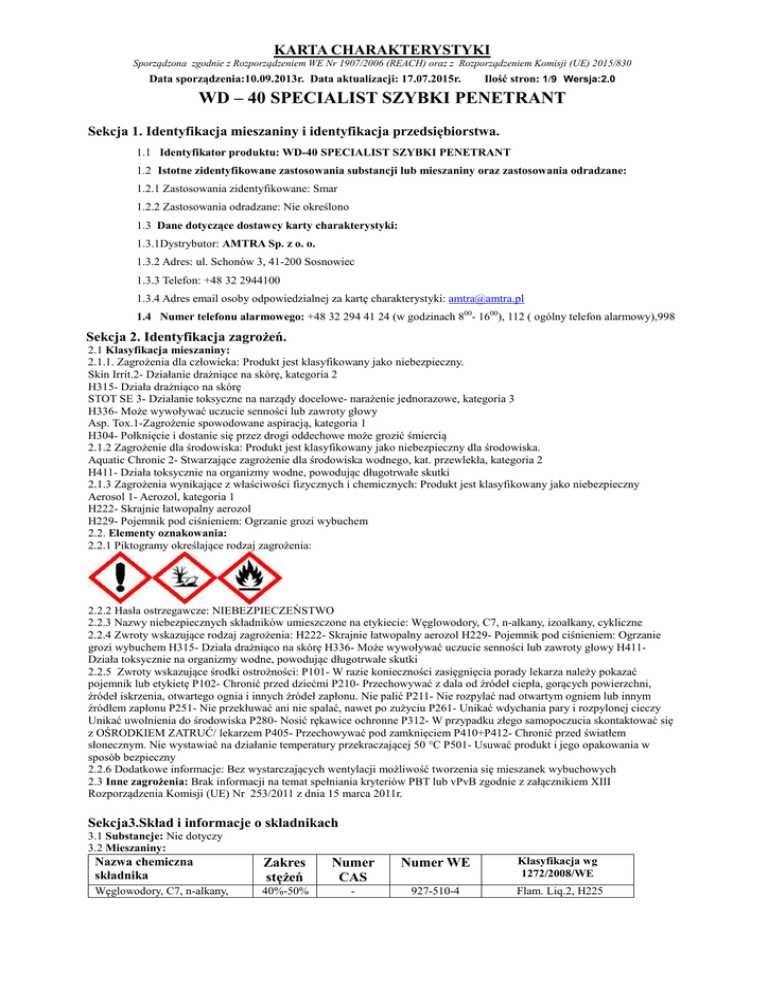 KARTA CHARAKTERYSTYKI Sporządzona zgodnie z Rozporządzeniem WE Nr 1907/2006 (REACH) oraz z Rozporządzeniem Komisji (UE) 2015/830 Data sporządzenia:10.09.2013r. Data aktualizacji: 17.07.2015r. Ilość stron: 1/9 Wersja:2.0 WD – 40 SPECIALIST SZYBKI PENETRANT Sekcja 1. Identyfikacja mieszaniny i identyfikacja przedsiębiorstwa. 1.1 Identyfikator produktu: WD-40 SPECIALIST SZYBKI PENETRANT 1.2 Istotne zidentyfikowane zastosowania substancji lub mieszaniny oraz zastosowania odradzane: 1.2.1 Zastosowania zidentyfikowane: Smar 1.2.2 Zastosowania odradzane: Nie określono 1.3 Dane dotyczące dostawcy karty charakterystyki: 1.3.1Dystrybutor: AMTRA Sp. z o. o. 1.3.2 Adres: ul. Schonów 3, 41-200 Sosnowiec 1.3.3 Telefon: +48 32 2944100 1.3.4 Adres email osoby odpowiedzialnej za kartę charakterystyki: [email protected] 1.4 Numer telefonu alarmowego: +48 32 294 41 24 (w godzinach 800- 1600), 112 ( ogólny telefon alarmowy),998 Sekcja 2. Identyfikacja zagrożeń. 2.1 Klasyfikacja mieszaniny: 2.1.1. Zagrożenia dla człowieka: Produkt jest klasyfikowany jako niebezpieczny. Skin Irrit.2- Działanie drażniące na skórę, kategoria 2 H315- Działa drażniąco na skórę STOT SE 3- Działanie toksyczne na narządy docelowe- narażenie jednorazowe, kategoria 3 H336- Może wywoływać uczucie senności lub zawroty głowy Asp. Tox.1-Zagrożenie spowodowane aspiracją, kategoria 1 H304- Połknięcie i dostanie się przez drogi oddechowe może grozić śmiercią 2.1.2 Zagrożenie dla środowiska: Produkt jest klasyfikowany jako niebezpieczny dla środowiska. Aquatic Chronic 2- Stwarzające zagrożenie dla środowiska wodnego, kat. przewlekła, kategoria 2 H411- Działa toksycznie na organizmy wodne, powodując długotrwałe skutki 2.1.3 Zagrożenia wynikające z właściwości fizycznych i chemicznych: Produkt jest klasyfikowany jako niebezpieczny Aerosol 1- Aerozol, kategoria 1 H222- Skrajnie łatwopalny aerozol H229- Pojemnik pod ciśnieniem: Ogrzanie grozi wybuchem 2.2. Elementy oznakowania: 2.2.1 Piktogramy określające rodzaj zagrożenia: 2.2.2 Hasła ostrzegawcze: NIEBEZPIECZEŃSTWO 2.2.3 Nazwy niebezpiecznych składników umieszczone na etykiecie: Węglowodory, C7, n-alkany, izoalkany, cykliczne 2.2.4 Zwroty wskazujące rodzaj zagrożenia: H222- Skrajnie łatwopalny aerozol H229- Pojemnik pod ciśnieniem: Ogrzanie grozi wybuchem H315- Działa drażniąco na skórę H336- Może wywoływać uczucie senności lub zawroty głowy H411Działa toksycznie na organizmy wodne, powodując długotrwałe skutki 2.2.5 Zwroty wskazujące środki ostrożności: P101- W razie konieczności zasięgnięcia porady lekarza należy pokazać pojemnik lub etykietę P102- Chronić przed dziećmi P210- Przechowywać z dala od źródeł ciepła, gorących powierzchni, źródeł iskrzenia, otwartego ognia i innych źródeł zapłonu. Nie palić P211- Nie rozpylać nad otwartym ogniem lub innym źródłem zapłonu P251- Nie przekłuwać ani nie spalać, nawet po zużyciu P261- Unikać wdychania pary i rozpylonej cieczy Unikać uwolnienia do środowiska P280- Nosić rękawice ochronne P312- W przypadku złego samopoczucia skontaktować się z OŚRODKIEM ZATRUĆ/ lekarzem P405- Przechowywać pod zamknięciem P410+P412- Chronić przed światłem słonecznym. Nie wystawiać na działanie temperatury przekraczającej 50 °C P501- Usuwać produkt i jego opakowania w sposób bezpieczny 2.2.6 Dodatkowe informacje: Bez wystarczających wentylacji możliwość tworzenia się mieszanek wybuchowych 2.3 Inne zagrożenia: Brak informacji na temat spełniania kryteriów PBT lub vPvB zgodnie z załącznikiem XIII Rozporządzenia Komisji (UE) Nr 253/2011 z dnia 15 marca 2011r. Sekcja3.Skład i informacje o składnikach 3.1 Substancje: Nie dotyczy 3.2 Mieszaniny: Nazwa chemiczna składnika Zakres stężeń Numer CAS Numer WE Klasyfikacja wg 1272/2008/WE Węglowodory, C7, n-alkany, 40%-50% - 927-510-4 Flam. Liq.2, H225 KARTA CHARAKTERYSTYKI Sporządzona zgodnie z Rozporządzeniem WE Nr 1907/2006 (REACH) oraz z Rozporządzeniem Komisji (UE) 2015/830 Data sporządzenia:10.09.2013r. Data aktualizacji: 17.07.2015r. Ilość stron: 2/9 Wersja:2.0 WD – 40 SPECIALIST SZYBKI PENETRANT izoalkany, cykliczne Węglowodory, C11-C14, nalkany izoalkany, cykloalkany, <2% związki aromatyczne Destylaty lekkie obrabiane wodorem (ropa naftowa) Dwutlenek węgla Węglowodory, C7-C9, izoalkany 30%-50% - 926-141-6 Asp. Tox. 1, H304 Skin Irrit.2, H315 STOT SE 3, H336 Aquatic Chronic 2, H411 Asp. Tox.1, H304 1%-5% 64742-47-8 265-149-8 Asp. Tox. 1, H304 1%-5% 1%-5% 124-38-9 - 204-696-9 921-728-3 Flam. Liq.2, H225 Asp. Tox.1, H304 Skin Irrit.2, H315 STOT SE 3, H336 Aquatic Chronic 2, H411 SEKCJA 4. ŚRODKI PIERWSZEJ POMOCY 4.1 Opis środków pierwszej pomocy: 4.1.1 Połknięcie: W razie połknięcia przepłukać jamę ustną oraz przetransportować do najbliższej placówki medycznej celem podjęcia leczenia. Pokazać opakowanie lub etykietę. Nie wywoływać wymiotów, niebezpieczeństwo aspiracji. Jeśli wystąpią spontanicznie wymioty, trzymać głowę poniżej bioder. 4.1.2. Zatrucie inhalacyjne: Wynieść poszkodowanego z miejsca narażenia i zapewnić dostęp świeżego powietrza oraz spokój i odpoczynek. W przypadku dolegliwości (kaszel, wymioty, zawroty głowy, świszczący oddech) zapewnić pomoc lekarską. Nieprzytomnego ułożyć w pozycji bocznej. 4.1.3. Skażenie skóry: Zdjąć skażoną odzież. Skórę zmyć ciepłą wodą z mydłem. W razie wystąpienia podrażnienia skóry skontaktować się z lekarzem. 4.1.4.Skażenie oczu: Jeżeli poszkodowany nosi szkła kontaktowe niezwłocznie je wyjąć. Dokładnie przemyć oczy dużą ilością wody, wywijając powieki. Zapewnić pomoc okulisty. Uwaga: osoby narażone na skażenie oczu powinny być pouczone o konieczności i sposobie natychmiastowego płukania oczu 4.2 Najważniejsze ostre i opóźnione objawy oraz skutki narażenia: 4.2.1 Skażenie oczu: Może wystąpić podrażnienie, zaczerwienienie or