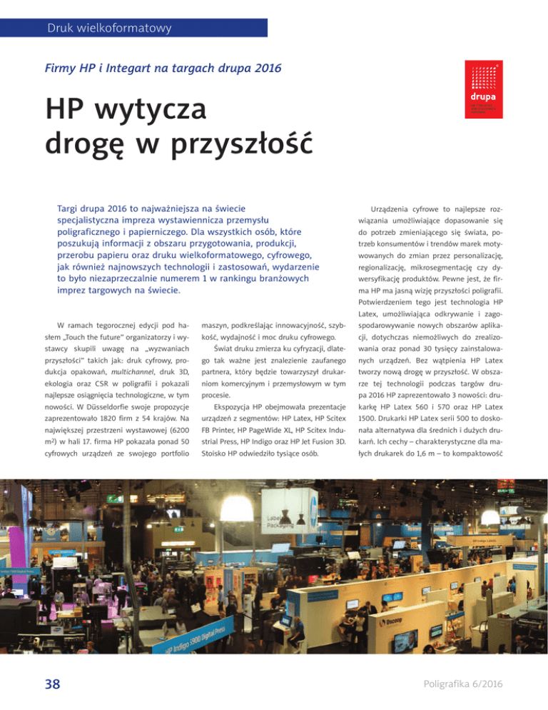 Druk wielkoformatowy Firmy HP i Integart na targach drupa 2016 HP wytycza drogę w przyszłość Targi drupa 2016 to najważniejsza na świecie specjalistyczna impreza wystawiennicza przemysłu poligraficznego i papierniczego. Dla wszystkich osób, które poszukują informacji z obszaru przygotowania, produkcji, przerobu papieru oraz druku wielkoformatowego, cyfrowego, jak również najnowszych technologii i zastosowań, wydarzenie to było niezaprzeczalnie numerem 1 w rankingu branżowych imprez targowych na świecie. Urządzenia cyfrowe to najlepsze rozwiązania umożliwiające dopasowanie się do potrzeb zmieniającego się świata, potrzeb konsumentów i trendów marek motywowanych do zmian przez personalizację, regionalizację, mikrosegmentację czy dywersyfikację produktów. Pewne jest, że firma HP ma jasną wizję przyszłości poligrafii. Potwierdzeniem tego jest technologia HP Latex, umożliwiająca odkrywanie i zago- W ramach tegorocznej edycji pod hasłem „Touch the future” organizatorzy i wy- maszyn, podkreślając innowacyjność, szyb- spodarowywanie nowych obszarów aplika- kość, wydajność i moc druku cyfrowego. cji, dotychczas niemożliwych do zrealizo- stawcy skupili uwagę na „wyzwaniach Świat druku zmierza ku cyfryzacji, dlate- wania oraz ponad 30 tysięcy zainstalowa- przyszłości” takich jak: druk cyfrowy, pro- go tak ważne jest znalezienie zaufanego nych urządzeń. Bez wątpienia HP Latex dukcja opakowań, multichannel, druk 3D, partnera, który będzie towarzyszył drukar- tworzy nową drogę w przyszłość. W obsza- ekologia oraz CSR w poligrafii i pokazali niom komercyjnym i przemysłowym w tym rze tej technologii podczas targów dru- najlepsze osiągnięcia technologiczne, w tym procesie. pa 2016 HP zaprezentowało 3 nowości: dru- nowości. W Düsseldorfie swoje propozycje Ekspozycja HP obejmowała prezentacje karkę HP Latex 560 i 570 oraz HP Latex zaprezentowało 1820 firm z 54 krajów. Na urządzeń z segmentów: HP Latex, HP Scitex 1500. Drukarki HP Latex serii 500 to dosko- największej przestrzeni wystawowej (6200 FB Printer, HP PageWide XL, HP Scitex Indu- nała alternatywa dla średnich i dużych dru- strial Press, HP Indigo oraz HP Jet Fusion 3D. karń. Ich cechy – charakterystyczne dla ma- Stoisko HP odwiedziło tysiące osób. łych drukarek do 1,6 m – to kompaktowość m2) w hali 17. firma HP pokazała ponad 50 cyfrowych urządzeń ze swojego portfolio 38 Poligrafika 6/2016 Druk wielkoformatowy i łatwość w obsłudze, a także wydajność będą zamieszczane na bieżąco na stronie portfolio mediów najlepszych na rynku do- i solidna konstrukcja pozwalające na reali- www.integart.com.pl/events. stawców takich jak: Avery, Junkers&Müllers, zowanie dużych zleceń w krótkim czasie. Z kolei nowa drukarka HP Latex 1500 to Modele z serii HP Latex 500 mają wszyst- bez wątpienia konkurent dla serii 3000, te- kie zalety technologii 3. generacji HP Latex raz dostępny w niedrogim urządzeniu typu Odkrywanie to podstawa działalności w stosunku do ekosolwentu: wysoką jakość superwide. Urządzenie umożliwia przede HP. Technologia PageWide została opraco- i prędkość druku, natychmiastowe schnię- wszystkim szybki wydruk aplikacji o szero- wana na potrzeby maszyn do druku przemy- cie tuszu, odporność na zarysowania, ła- kości do 3,2 m. Zastosowana technologia słowego HP Web Press. Ultraszybka techno- twość użytkowania i ekologiczność charak- gwarantuje utrzymanie tej samej jakości logia druku zrewolucjonizowała oczekiwania terystyczną dla tuszy na bazie wody. za każdym razem. poligrafii, również w wersji biurowej, nada- Stoisko HP na targach drupa 2016 Aplikacje w technologii HP Latex Katalog Printed Interiors Neschen, 3M, Sihl, Berger, Visual Magnetics, Solter, w tym również Integart. Zastosowano również trzy innowacyjne W modelu 1500 znalazły się: głowice jąc nowy standard dokumentom technicz- rozwiązania pozwalające na zwiększenie drukujące HP Thermal Inkjet, czujnik optycz- nym w wydaniu XL. Urządzenia te świetnie wydajności i skrócenie czasu obsługi: ny przesuwania nośnika, spektrofotometr, sprawdzają się w realizacjach prac CAD- I stół obrotowy, czyli nowy, połączony mo- silny podajnik roll-to-roll, podświetlana dio- owskich, druku map czy zastosowaniach duł podawania i odbierania nośników; dami LED strefa druku, serwer druku oraz la- do reklamy. Spełnione oczekiwania w zakre- ulepszony system suszenia z kolekto- tarnia statusu umożliwiająca szybki, zdalny sie tempa pracy, jakości koloru, wydajności rem skroplin; monitoring urządzenia. energetycznej oraz kosztów eksploatacji po- I I głowica typu optimizer zwiększająca prędkość i jakość druku. Seria HP Latex 500 posiada bezwałko- wy system podawania, a wszystkie zadania Atrakcyjna cena, szeroka gama zastoso- zwalają firmom na całym świecie osiągać wań aplikacyjnych oraz wysoka jakość i wy- przewagę konkurencyjną. Od czerwca tego dajność sprawiają, że urządzenie znajdzie roku Integart posiada w swoim portfolio no- szerokie zastosowanie w różnych branżach, we drukarki HP PageWide XL. od reklamowej po dekoracje wnętrz. Już 8 lipca br. firma zaprasza na pre-- operatora są wykonywane z przodu maszy- Firma HP przoduje w rozwiązaniach apli- mierowy pokaz urządzenia HP PageWide ny. Drukarki wytrzymują ciężar większych kacyjnych stosowanych we wnętrzach; za jej XL 8000 do HP Demo w Błoniu pod Wro- rolek o wadze do 55 kg i średnicy 250 mm, przykładem zmienia się tradycyjne podejście cławiem. co oznacza możliwość podawania 100-me- do aranżacji wnętrz. Na targach drupa obok Pokaz osiągnięć i nowości HP Digital trowych rolek np. samoprzylepnych folii wi- ekspozycji mediów zostało zaprezentowane na targach drupa 2016 pokazuje, że przy- nylowych. Praktyczną innowacją pomagają- najnowsze wydanie katalogu „Portfolio Do- szłość druku komercyjnego jest napędzana cą w ogran
