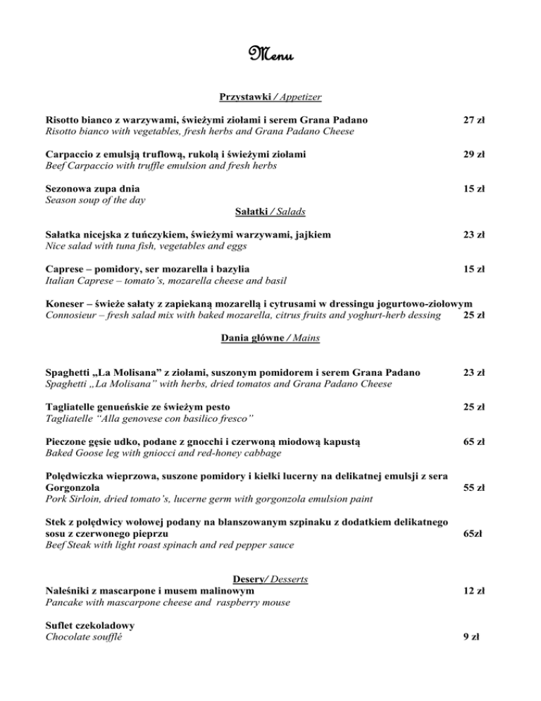 Menu Przystawki / Appetizer Risotto bianco z warzywami, świeżymi ziołami i serem Grana Padano Risotto bianco with vegetables, fresh herbs and Grana Padano Cheese 27 zł Carpaccio z emulsją truflową, rukolą i świeżymi ziołami Beef Carpaccio with truffle emulsion and fresh herbs 29 zł Sezonowa zupa dnia Season soup of the day 15 zł Sałatki / Salads Sałatka nicejska z tuńczykiem, świeżymi warzywami, jajkiem Nice salad with tuna fish, vegetables and eggs 23 zł Caprese – pomidory, ser mozarella i bazylia Italian Caprese – tomato’s, mozarella cheese and basil 15 zł Koneser – świeże sałaty z zapiekaną mozarellą i cytrusami w dressingu jogurtowo-ziołowym Connosieur – fresh salad mix with baked mozarella, citrus fruits and yoghurt-herb dessing 25 zł Dania główne / Mains Spaghetti „La Molisana” z ziołami, suszonym pomidorem i serem Grana Padano Spaghetti „La Molisana” with herbs, dried tomatos and Grana Padano Cheese 23 zł Tagliatelle genueńskie ze świeżym pesto Tagliatelle “Alla genovese con basilico fresco” 25 zł Pieczone gęsie udko, podane z gnocchi i czerwoną miodową kapustą Baked Goose leg with gniocci and red-honey cabbage 65 zł Polędwiczka wieprzowa, suszone pomidory i kiełki lucerny na delikatnej emulsji z sera Gorgonzola Pork Sirloin, dried tomato’s, lucerne germ with gorgonzola emulsion paint 55 zł Stek z polędwicy wołowej podany na blanszowanym szpinaku z dodatkiem delikatnego sosu z czerwonego pieprzu Beef Steak with light roast spinach and red pepper sauce 65zł Desery/ Desserts Naleśniki z mascarpone i musem malinowym Pancake with mascarpone cheese and raspberry mouse 12 zł Suflet czekoladowy Chocolate soufflé 9 zł