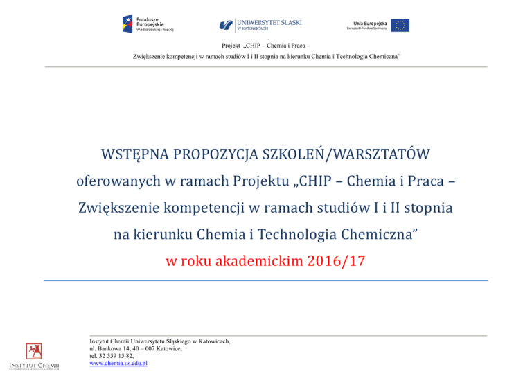 Projekt „CHIP – Chemia i Praca – Zwiększenie kompetencji w ramach studiów I i II stopnia na kierunku Chemia i Technologia Chemiczna” WSTĘPNA PROPOZYCJA SZKOLEN/WARSZTATOW oferowanych w ramach Projektu „CHIP – Chemia i Praca – Zwiększenie kompetencji w ramach studiow I i II stopnia na kierunku Chemia i Technologia Chemiczna” w roku akademickim 2016/17 Instytut Chemii Uniwersytetu Śląskiego w Katowicach, ul. Bankowa 14, 40 – 007 Katowice, tel. 32 359 15 82, www.chemia.us.edu.pl Projekt „CHIP – Chemia i Praca – Zwiększenie kompetencji w ramach studiów I i II stopnia na kierunku Chemia i Technologia Chemiczna” 1. Szkolenia i zajęcia warsztatowe podnoszące kompetencje istotne z punktu widzenia potrzeb rynku pracy Proponowane zajęcia prowadzone przez zewnętrznych specjalistów (propozycja może ulec zmianie): Lp 1 Nazwa warszatu/szkolenia Praktyczna chemia obliczeniowa2 Praktyczna chemia obliczeniowa Temat kursu 1 5 Obliczenia kwantowo–chemiczne w praktyce - wprowadzenie; Obliczenia kwantowo–chemiczne w badaniach mechanizmów reakcji chemicznych Analiza i prezentacja Elementy rachunku prawdopodobieństwa, danych statystyka opisowa i wizualizacja danych Analiza i prezentacja Statystyka matematyczna i wizualizacja danych danych Bezpieczeństwo danych elektronicznych i systemów komputerowych 6 Szkolenie kształtujące uniwersalne kompetencje zawodowo-społeczne 2 3 4 1 2 jeżeli inny niż nazwa kursu w semestrze letnim planuje się uruchomienie kolejnych grup Instytut Chemii Uniwersytetu Śląskiego w Katowicach, ul. Bankowa 14, 40 – 007 Katowice, tel. 32 359 15 82, www.chemia.us.edu.pl Liczba osób/ grupę 8 osób x 2 grupy 8 osób x 1 grupa 12 osób x 2 grupy 12 osób x 2 grupy 12 osób x 2 grupy wszyscy uczestnicy Projektu Liczba godz./grupę 15 proponowany termin 1 grupa: sem. zimowy 2 grupa: sem. letni sem. zimowy 15 20 20 15 6 1 grupa: sem. zimowy 2 grupa: sem. letni 1 grupa: sem. zimowy 2 grupa: sem. letni 1 grupa: sem. zimowy 2 grupa: sem. letni sem. letni Projekt „CHIP – Chemia i Praca – Zwiększenie kompetencji w ramach studiów I i II stopnia na kierunku Chemia i Technologia Chemiczna” 2. Szkolenia i zajęcia warsztatowe podnoszące kompetencje istotne z punktu widzenia potrzeb rynku pracy Proponowane zajęcia prowadzone przez zewnętrznych specjalistów z zagranicy (propozycja może ulec zmianie): Lp Nazwa warsztatu/szkolenia Temat kursu 3 1 Elements of Scientific English for Chemistry Students 4 Elements of Scientific English for Chemistry Students Elements of Scientific English for Chemistry Students Oxidation and reduction mechanisms Elements of Scientific English for Chemistry Students Chemistry in English Potential anticancer drugs 2 3 4 5 6 3 4 Chemistry in English Liczba osób/ grupę 6 osób x 1 grupa Introduction to molecular spectroscopy 6 osób x 1 grupa Biologically active compounds for potential 6 osób x use as antifungal agents 1 grupa Redox properties of non-innocent ligands in coordination and organometallic chemistry, and in switchable molecular materials” General and Inorganic Chemistry jeżeli inny niż nazwa kursu w semestrze letnim planuje się uruchomienie kolejnych grup zajęć prowadzonych w języku angielskim Instytut Chemii Uniwersytetu Śląskiego w Katowicach, ul. Bankowa 14, 40 – 007 Katowice, tel. 32 359 15 82, www.chemia.us.edu.pl 6 osób x 1 grupa 6 osób x 1 grupa 6 osób x 1 grupa Liczba godz./grupę 30 30 30 30 proponowany termin do grudnia 2016r. do grudnia 2016r. sem. zimowy (grudzień/styczeń 2016) sem. letni sem. zimowy 60 60 sem. letni Projekt „CHIP – Chemia i Praca – Zwiększenie kompetencji w ramach studiów I i II stopnia na kierunku Chemia i Technologia Chemiczna” 3. Współpraca z otoczeniem społeczno-gospodarczym służąca lepszemu przygotowaniu do wejścia na rynek pracy (propozycja może ulec zmianie): Lp Nazwa warsztatu/szkolenia Temat kursu 5 1 Praktyczne zajęcia u pracodawcy Innowacyjne procesy biooczyszczania powietrza z lotnych związków organicznych (LZO) i odorów w Kompaktowych Bioreaktorach Trójfazowych Analiza wielopierwiastkowa próbek środowiskowych i rzeczywistych Metody wyosabniania oraz analiza materiału dowodowego i materiału biologicznego za pomocą testów ELISA oraz metod chromatograficznych – GC-FID, GC-MS i LC-MS Techniki chromatograficzne w analizie próbek rzeczywistych Nowoczesne metody badań węglowodorów pochodzenia rafineryjnego z uwzględnieniem aspektów oceny statystycznej wyników badań 2 3 4 5 5 Praktyczne zajęcia u pracodawcy Praktyczne zajęcia u pracodawcy Praktyczne zajęcia u pracodawcy Praktyczne zajęcia u pracodawcy jeżeli inny niż nazwa kursu Instytut Chemii Uniwersytetu Śląskiego w Katowicach, ul. Bankowa 14, 40 – 007 Katowice, tel. 32 359 15 82, www.chemia.us.edu.pl Liczba osób/ grupę 5 osób x 1 grupa 5 osób x 1 grupa 5 osób x 2 grupy 5 osób x 1 grupa 5 osób x 1 grupa Liczba godz./grupę proponowany termin do grudnia 2016r. 40 40 40 40 sem. zimowy 1 grupa: sem. zimowy 2 grupa: sem. letni sem. letni sem. letni 40 Projekt „CHIP – Chemia i Praca – Zwiększenie kompetencji w ramach studiów I i II stopnia na kierunku Chemia i Technologia Chemiczna” 4. Współpraca z otoczeniem społeczno-gospodarczym służąca lepszemu przygotowaniu do wejścia na rynek pracy (propozycja może ulec zmianie): Lp Nazwa warsztatu/szkolenia Liczba osób/ grupę 1 2 3 4 Praktyczna szkoła przedsiębiorczości Zarządzanie zasobami ludzkimi Wizyty studyjne w przedsiębiorstwach Spotkanie panelowe z pracodawcami wszyscy Uczestnicy Projektu wszyscy Uczestnicy Projektu 5 osób x 10 grup wszyscy Uczestnicy Projektu Instytut Chemii Uniwersytetu Śląskiego w Katowicach, ul. Bankowa 14, 40 – 007 Katowice, tel. 32 359 15 82, www.chemia.us.edu.pl Liczba godz./grupę 6 4 4 6 proponowany termin sem. letni sem. letni sem. zimowy i letni sem. letni Projekt „CHIP – Chemia i Praca – Zwiększenie kompetencji w ramach studiów I