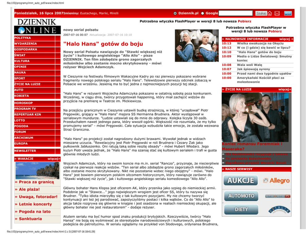 file:///D|/programy/imm_auto_pdf/www/index.html Poniedziałek, 16 lipca 2007Imieniny: Eustachego, Mariki, Mirelli Dziennik.pl Google Potrzebna wtyczka FlashPlayer w wersji 8 lub nowsza Pobierz nowy serial polsatu 2007-07-16 00:07 Aktualizacja: 2007-07-16 10:10 POLITYKA "Halo Hans" gotów do boju WYDARZENIA GOSPODARKA Nowy serial Polsatu nawiązuje do "Stawki większej niż życie" i kultowego angielskiego "Allo Allo" - pisze DZIENNIK. Ten film zdobędzie grono zagorzałych miłośników albo zostanie mocno skrytykowany - mówi reżyser Wojciech Adamczyk. ŚWIAT KULTURA OPINIE NAUKA W Cieszynie na festiwalu filmowym Wakacyjne Kadry po raz pierwszy pokazano wybrane fragmenty nowego polskiego serialu "Halo Hans". Telewidzowie pierwszy odcinek zobaczą w Polsacie we wrześniu. Jesienią ma to być jedna z najmocniejszych pozycji tej stacji. SPORT ŻYCIE NA LUZIE 10:13 10:12 10:10 10:09 10:08 10:07 10:00 10:00 więcej » Wielka ewakuacja na Okęciu W co (i gdzie) się bawić w lipcu? "Halo Hans" gotów do boju Media o Lidze Światowej: Smutny koniec Wala woli Walę Jak śpiewają syreny Przed nami dwa tygodnie upałów Amerykański Kościół płaci za molestowanie więcej» "Halo Hans" w reżyserii Wojciecha Adamczyka pokazano w ostatnią sobotę poza konkursem. Wcześniej, w ciągu dnia, twórcy przygotowali happening, który miał zachęcić widzów do przyjścia na premierę w Teatrze im. Mickiewicza. KOBIETA HOROSKOP PROGRAM TV Na przejściu granicznym w Cieszynie ustawili budkę strażniczą, w której "urzędował" Piotr Pręgowski, grający w "Halo Hans" majora SS Hermanna Brudnera. Aktor występował w serialowym mundurze. "Ludzie ustawiali się do mnie do odprawy. Kolejka liczyła 30 osób. Przesłuchałem nawet jednego pana, który wwoził ogórki. Większość nie rozumiała, że my tylko promujemy serial" - mówi Pręgowski. Cała sytuacja wzbudziła takie emocje, że została wezwana Straż Graniczna. REPERTUAR KIN LOTTO POGODA FORUM ARCHIWUM "Halo Hans" po projekcji został nagrodzony dużymi brawami. Wywołał jednak w widzach mieszane uczucia. "Rewelacyjny jest Piotr Pręgowski w roli Brudnera i Cezary Żak jako pułkownik Jabłuszenko. Oni ratują taką sobie resztę obsady" - mówi Hubert Włodarz. Jego kuzyn Piotr uważa jednak, że "Halo Hans" ma szansę stać się kultowym serialem i trafi w gusta głównie młodych ludzi. EUROPA NEWSLETTER więcej» » Praca za granicą » Ale plaża! » Uwaga, fotoradar! » Letnie koncerty Koniec romansu Foremniak i Maseraka? » Ola Kwaśniewska rezygnuje z luksusu » Tu zamieszka Kożuchowska Wojciech Adamczyk, który na swoim koncie ma m.in. serial "Ranczo", przyznaje, że niecierpliwie » Zagadkowa przyjaźń Weroniki Rosati czekał na pierwsze reakcje widzów. "Ten serial albo zdobędzie grono zagorzałych miłośników, » NASZE SERWISY albo zostanie mocno skrytykowany. Nikt nie pozostanie wobec niego obojętny" - mówi. "Halo Hans" jest bowiem pierwszym polskim sitcomem historycznym, który nawiązuje zarówno do "Stawki większej niż życie", jak i kultowego angielskiego serialu komediowego "Allo Allo". Główny bohater Hans Klopss jest oficerem AK, który przenika jako szpieg do niemieckiej armii. Podobnie jak w "Stawce..." jego największym wrogiem jest oficer SS, który tu nazywa się Brudner. "Tylko idiota mierzyłby się z tak kultowymi pozycjami. My nie chcemy tworzyć kontynuacji ani też jej parodiować, zapożyczyliśmy postaci i kilka wątków. Co do "Allo Allo" to akcja także rozgrywa się głównie w knajpie i jest osadzona w realiach niemieckiej okupacji, ale główny bohater nie jest restauratorem" - dodaje reżyser. » Pogoda na lato » Sanktuaria » NAJNOWSZE INFORMACJE » ŻYCIE NA LUZIE AUTO » WAKACJE Potrzebna wtyczka FlashPlayer w wersji 8 lub nowsza Pobierz Atutem serialu ma być humor spod znaku produkcji brytyjskich. Rzeczywiście, twórcy "Halo Hansa" nie boją się wyśmiewać ze stereotypów narodowościowych i kulturowych, polskiego podejścia do patriotyzmu. W serialu oglądamy na przykład von Slodovego, ordynansa Brudnera, file:///D|/programy/imm_auto_pdf/www/index.html (1 z 3) [2007-07-16 18:41:29] file:///D|/programy/imm_auto_pdf/www/index.html » KOBIETA.DZIENNIK.PL którego gra Bogdan Kalus. Brudner wyśmiewa się i kpi z tego niezbyt lotnego Ślązaka. Sam Klopss również nie przypomina pierwowzoru ze "Stawki...". "Mój bohater to przedwojenny lowelas, który kocha ojczyznę i poważnie traktuje swoje zadanie, ale jeszcze bardziej kocha kobiety i samego siebie" - mówi grający Klopssa Bartek Kasprzykowski. » KULTURA więcej» Polsat zamierza mocno promować swój nowy serial. Rozważana jest też opcja, by był nadawany w tym samym czasie, co "M jak miłość" w TVP2. Co z tą cnotą? Anna Nalewajk,Barbara Sowa » Jak przetrwać lato za « wstecz biurkiem? » Miłość i zdrada na planie filmowym » Glinka oczyszcza i nawilża twarz » WYDANIE DRUKOWANE » ZOBACZ TAKŻE » Kto co kręci, czyli co nas czeka po wakacjach » Agnieszka Holland: Zachodnie kino z alergią na religię » "Mała Ameryka" w HBO » Pamiątki z serialu "Dallas" na aukcji » Kryminalny "Elixir" w "Dwójce" » FORUM wszystkie posty » Dziś w Dzienniku » Archiwum Europy » Zamów prenumeratę » Kolekcje Dziennika » Kampania wizerunkowa » Matka Polka Pracująca » Konkurs: Firma dobra dla rodziny Ania Cieślak i nauka życia 2007-07-15 09:39 » 60 milionów za sekret Harry'ego 2007-07-14 10:37 2007-07-13 15:19 » Coelho: Nie nadaję się na scenę 2007-07-12 11:15 2007-07-10 08:22 » Pojawiły się Nowe Horyzonty » OSTATNIO NA FORUM więcej » TO JEST UKŁAD B E Z P Ł O D N Y ! NIE DOWIEMY SIĘ NIC NOWEGO , OPRÓCZ CHĘCI TRWANIA PRZY ... Wiktor tak właśnie jest PIS=PRL bis.Wszystko w rękach PIS i to oni decydują w wielu ... Jak Kuba Bogu ... Wojujemy mieczem w różnych państwach to w końcu i w nas ... » AUTO więcej» » SONDA Czy gdyby w tym roku były nowe wybory, poszedłbyś głosować? Proszę wybra