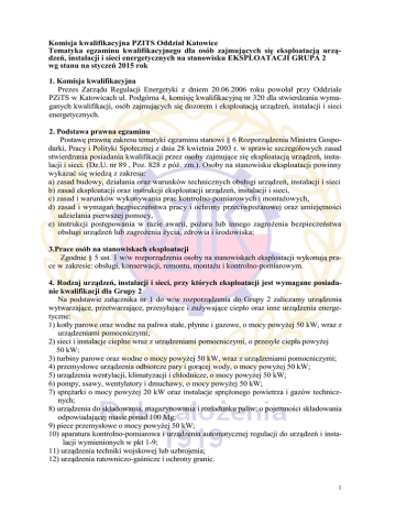 Komisja kwalifikacyjna PZITS Oddział Katowice Tematyka egzaminu kwalifikacyjnego dla osób zajmujących się eksploatacją urządzeń, instalacji i sieci energetycznych na stanowisku EKSPLOATACJI GRUPA 2 wg stanu na styczeń 2015 rok 1. Komisja kwalifikacyjna Prezes Zarządu Regulacji Energetyki z dniem 20.06.2006 roku powołał przy Oddziale PZiTS w Katowicach ul. Podgórna 4, komisję kwalifikacyjną nr 320 dla stwierdzania wymaganych kwalifikacji, osób zajmujących się dozorem i eksploatacją urządzeń, instalacji i sieci energetycznych. 2. Podstawa prawna egzaminu Postawę prawną zakresu tematyki egzaminu stanowi § 6 Rozporządzenia Ministra Gospodarki, Pracy i Polityki Społecznej z dnia 28 kwietnia 2003 r. w sprawie szczegółowych zasad stwierdzania posiadania kwalifikacji przez osoby zajmujące się eksploatacją urządzeń, instalacji i sieci. (Dz.U. nr 89 , Poz. 828 z póź. zm.). Osoby na stanowisku eksploatacji powinny wykazać się wiedzą z zakresu: a) zasad budowy, działania oraz warunków technicznych obsługi urządzeń, instalacji i sieci b) zasad eksploatacji oraz instrukcji eksploatacji urządzeń, instalacji i sieci, c) zasad i warunków wykonywania prac kontrolno-pomiarowych i montażowych, d) zasad i wymagań bezpieczeństwa pracy i ochrony przeciwpożarowej oraz umiejętności udzielania pierwszej pomocy, e) instrukcji postępowania w razie awarii, pożaru lub innego zagrożenia bezpieczeństwa obsługi urządzeń lub zagrożenia życia, zdrowia i środowiska; 3.Prace osób na stanowiskach eksploatacji Zgodnie § 5 ust. 1 w/w rozporządzenia osoby na stanowiskach eksploatacji wykonują prace w zakresie: obsługi, konserwacji, remontu, montażu i kontrolno-pomiarowym. 4. Rodzaj urządzeń, instalacji i sieci, przy których eksploatacji jest wymagane posiadanie kwalifikacji dla Grupy 2 Na podstawie załącznika nr 1 do w/w rozporządzenia do Grupy 2 zaliczamy urządzenia wytwarzające, przetwarzające, przesyłające i zużywające ciepło oraz inne urządzenia energetyczne: 1) kotły parowe oraz wodne na paliwa stałe, płynne i gazowe, o mocy powyżej 50 kW, wraz z urządzeniami pomocniczymi; 2) sieci i instalacje cieplne wraz z urządzeniami pomocniczymi, o przesyle ciepła powyżej 50 kW; 3) turbiny parowe oraz wodne o mocy powyżej 50 kW, wraz z urządzeniami pomocniczymi; 4) przemysłowe urządzenia odbiorcze pary i gorącej wody, o mocy powyżej 50 kW; 5) urządzenia wentylacji, klimatyzacji i chłodnicze, o mocy powyżej 50 kW; 6) pompy, ssawy, wentylatory i dmuchawy, o mocy powyżej 50 kW; 7) sprężarki o mocy powyżej 20 kW oraz instalacje sprężonego powietrza i gazów technicznych; 8) urządzenia do składowania, magazynowania i rozładunku paliw, o pojemności składowania odpowiadającej masie ponad 100 Mg; 9) piece przemysłowe o mocy powyżej 50 kW; 10) aparatura kontrolno-pomiarowa i urządzenia automatycznej regulacji do urządzeń i instalacji wymienionych w pkt 1-9; 11) urządzenia techniki wojskowej lub uzbrojenia; 12) urządzenia ratowniczo-gaśnicze i ochrony granic. 1 5. Szczegółowa tematyka egzaminu Tematykę opracowano zgodnie z wymaganiami podanymi w § 6 Rozporządzenia Ministra Gospodarki, Pracy i Polityki Społecznej z dnia 28 kwietnia 2003 r. dla osób na stanowisku Eksploatacji i z uwzględnieniem eksploatowanych urządzeń, instalacji i sieci podanych w załączniku nr 1 w/w Rozporządzenia dla Grupy 2. 5.1.Zasady budowy, działania oraz warunki techniczne obsługi urządzeń, instalacji i sieci - Charakterystyka przepisów i norm dotyczących budowy urządzeń, instalacji i sieci - Budowa i działanie urządzeń energetycznych oraz ich parametry techniczne (typ, temperatura, ciśnienie itp.). - Aparatura kontrolno-pomiarowa, regulacyjna i zabezpieczająca stanowiąca wyposażenie urządzeń energetycznych - Sposób technicznego i eksploatacyjnego oznaczenia urządzeń i instalacji energetycznych. 5.2.1 Zasady eksploatacji oraz instrukcje eksploatacji urządzeń, instalacji i sieci - Ogólna charakterystyka instrukcji eksploatacji urządzeń, instalacji i sieci -Wykonywanie podstawowych prac związanych z prawidłowym uruchamianiem, prowadzeniem ruchu i zatrzymaniem urządzenia energetycznego. - Częstość i zakres zapisów eksploatacyjnych ze wskazań aparatury kontrolno-pomiarowej. - Częstość i zakres wykonywania oględzin, przeglądów, napraw, remontów, prób i pomiarów. 5.2.2 Zasady racjonalnej gospodarki energetycznej -Charakterystyka wytwarzania, przesyłu i użytkowania paliw i energii w zakresie odpowiadającym stanowisku pracy. -Stosowanie ustalonych programów i harmonogramów pracy urządzeń sieci i instalacji energetycznych. -Przestrzeganie zasad oszczędnego użytkowania paliw i energii oraz obniżania energochłonności urządzeń energetycznych. 5.3.Zasady i warunki wykonywania prac kontrolno-pomiarowych i montażowych -Warunki przeprowadzenia prac kontrolno-pomiarowych. -Wykonywanie pomiarów eksploatacyjnych obejmujących: • podstawowe parametry pracy urządzeń, instalacji i sieci, • efektywność pracy (sprawność) urządzeń i instalacji, • parametry jakościowe czynników energetycznych zasilających urządzenia i instalację • wskazania aparatury kontrolno-pomiarowej. -Protokoły z przeprowadzonych badań i pomiarów. -Analiza uzyskanych wyników z pomiarów. -Charakterystyka realizacji prac montażowych urządzeń, instalacji i sieci 5.4.Zasady i wymagania bezpieczeństwa pracy i ochrony przeciwpożarowej oraz umiejętności udzielania pierwszej pomocy - Wymagania bezpieczeństwa pracy dotyczące pracowników. - Zagrożenia występujące na stanowisku pracy. - Organizacja prac przy urządzeniach i instalacjach. - Sposób i zasady przygotowania miejsca pracy. - Wykorzystywane narzędzia pracy, sprzęt ochronny i odzież ochronna do prac przy urządzeniach energetycznych. - Bezpieczeństwo pożarowe przy urządzeniach energetycznych. - Rodzaj sprzętu przeciwpożarowego i wymagania jeg