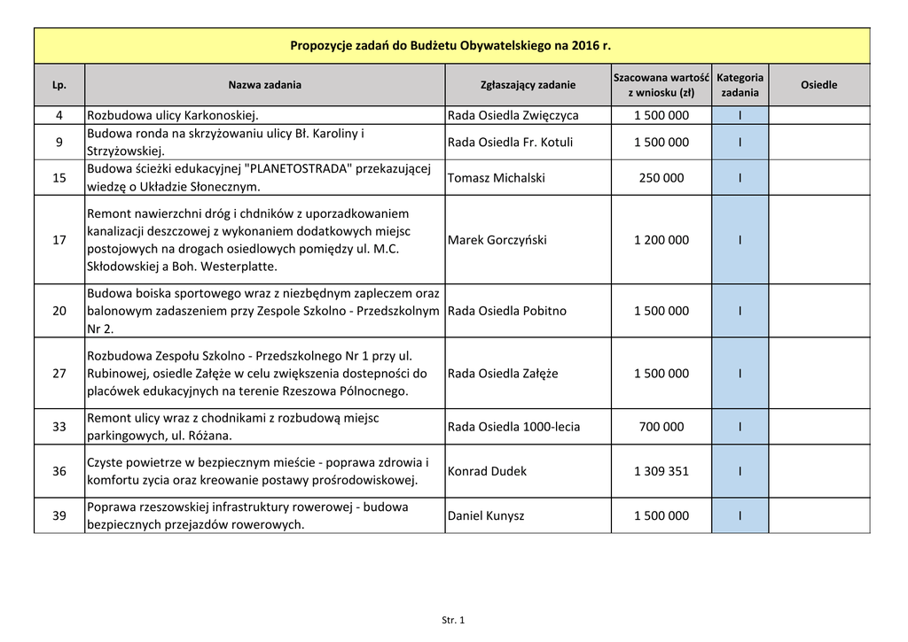 Propozycje zadań do Budżetu Obywatelskiego na 2016 r. Lp. 4 9 15 Nazwa zadania Rozbudowa ulicy Karkonoskiej. Budowa ronda na skrzyżowaniu ulicy Bł. Karoliny i Strzyżowskiej. Budowa ścieżki edukacyjnej "PLANETOSTRADA" przekazującej wiedzę o Układzie Słonecznym. Zgłaszający zadanie Szacowana wartość Kategoria z wniosku (zł) zadania Rada Osiedla Zwięczyca 1 500 000 I Rada Osiedla Fr. Kotuli 1 500 000 I Tomasz Michalski 250 000 I Marek Gorczyński 1 200 000 I 17 Remont nawierzchni dróg i chdników z uporzadkowaniem kanalizacji deszczowej z wykonaniem dodatkowych miejsc postojowych na drogach osiedlowych pomiędzy ul. M.C. Skłodowskiej a Boh. Westerplatte. 20 Budowa boiska sportowego wraz z niezbędnym zapleczem oraz balonowym zadaszeniem przy Zespole Szkolno - Przedszkolnym Rada Osiedla Pobitno Nr 2. 1 500 000 I 27 Rozbudowa Zespołu Szkolno - Przedszkolnego Nr 1 przy ul. Rubinowej, osiedle Załęże w celu zwiększenia dostepności do placówek edukacyjnych na terenie Rzeszowa Pólnocnego. Rada Osiedla Załęże 1 500 000 I 33 Remont ulicy wraz z chodnikami z rozbudową miejsc parkingowych, ul. Różana. Rada Osiedla 1000-lecia 700 000 I 36 Czyste powietrze w bezpiecznym mieście - poprawa zdrowia i komfortu zycia oraz kreowanie postawy prośrodowiskowej. Konrad Dudek 1 309 351 I 39 Poprawa rzeszowskiej infrastruktury rowerowej - budowa bezpiecznych przejazdów rowerowych. Daniel Kunysz 1 500 000 I Str. 1 Osiedle Propozycje zadań do Budżetu Obywatelskiego na 2016 r. Lp. 42 44 Nazwa zadania Zgłaszający zadanie Rzeszów dostępny od A do Z – dostosowanie ośmiu placówek Wojewódzkiej i Miejskiej Biblioteki Publicznej w Rzeszowie do potrzeb osób starszych, niewidomych i niedowidzących mające na celu zwiększenie dostępności do zbiorów i obiektów. Ewelina Rusinek Budowa przejścia poziomego lub kładki nad torami przy ulicy Wyspiańskiego (obok hurtowni Arka) łączącego ulicę ks. Sondeja w Rzeszowie. Janusz Demitraszek 403 200 I 1 000 000 I 300 000 I 96 000 I 10 000 - 20 000 I Rada Osiedla Nowe Miasto 600 000 I Alicja Bialic 160 000 I Dorota Mackiewicz 170 000 I Wojciech Chmura 3 050 000 I 49 Budowa pętli autobusowej przy ul. Słocińskiej na działce nr 579/1, własność Gminy Miasto Rzeszów. 51 Rozszerzenie oferty edukacyjnej II Liceum Ogólnokształcącego w Rzeszowie poprzez rozbudowę infrastruktury sportowej oraz Artur Szeliga turystycznej. 55 Wykonanie górki saneczkowej w Parku Papieskim. 58 59 60 61 Przedłużenie w kierunku zachodnim drogi biegnącej wzdłuż południowej elewacji Milleniu Hall do Zespołu Szkół Nr 4 i basenu "Delfin" od ul. Rejtana. Poprawa funkcjonalności i bezpieczeństwa budynku szkoły ZSO Nr 4 zaadoptowanego na potrzeby Przedszkola Publicznego Nr 34. Poprawa funkcjonalności i bezpieczeństwa w budynku oraz placu zabaw Przedszkola Publicznego nr 38. Wykonanie ścieżki rowerowej wraz z trasą spacerową (chodnikiem) od ul. Św. Rocha do Chmielnika (początek skrzyżowanie przy szkole, koniec - granica Rzeszowa z Chmielnikiem - łącznie około 4 km długości). Szacowana wartość Kategoria z wniosku (zł) zadania Rada Osiedla Słocina Wincenty Lisowski Str. 2 Osiedle Propozycje zadań do Budżetu Obywatelskiego na 2016 r. Lp. 64 65 67 69 73 Nazwa zadania Budowa ronda okrężnego na skrzyżowaniu ulicy Bł. Karoliny i Strzyżowskiej. Budowa zadaszenia pneumatycznego na boisku treningowym przy stadionie Miejskim. Drabinianka Moja, Twoja, Amfiteatr Nasz. Rewitalizacja terenu i obiektów Muzeum Techniki i Militariów w Rzeszowie. Przebudowa parkingu wraz z zagopspodarowaniem terenu przy Gimnazjum Nr 8 w Rzeszowie. Zgłaszający zadanie Agnieszka Puzio 1 500 000 I Daniel Kunysz 1 500 000 I Edyta Chorzępa 2 100 000 I Tomasz Bąk 600 000 I Renata Drozdowska 160 000 I 450 000 I 400 000 I 400 000 I 15 000 000 I 180 000 I 700 000 I 1 500 000; 200 000 I, II 5 500 000 I, III 150 000 II 77 Rewitalizacja podwórek przy budynkach: Dabrowskiego 1, 3, 13, 15, Plac Śreniawitów 8, Hetmańska 6, Chodkiewicza 1 i 3. Rada Osiedla im. Gen. Grota Roweckiego 79 Remont nawierzchni ul. Śniadeckich od ul. Fredry do ul. Orzeszkowej wraz z chodnikiem. 80 Osuszanie budynku Szkoły Podstawowej Nr 1 w Rzeszowie. 81 Rada Osiedla ŚródmieściePółnoc Rada Osiedla ŚródmieściePółnoc Grzegorz Papuga Boisko Szkoły Podstawowej Nr 28. Budowa oświetlonego chodnika łączącego ulicę Przy Torze oraz Stanisław Czechowski ulicę Warszawską. 89 101 72 86 34 "Modernizacja i rozbudowa skateparku rzeszowskiego". Remont dachu oraz boiska szkolnego Gimnazjum Nr 2 w Rzeszowie. Budowa placu zabaw dla dzieci wraz z elementami siłowni przy Fontannie Multimedialnej. Taxówki powietrzne, loty widokowe nad Rzeszowem. Remont nawierzchni, parkingu asfaltowego przy ul. Kochanowskiego w Rzeszowie o pow. 1200 m2. Szacowana wartość Kategoria z wniosku (zł) zadania Roman Reszel Rada Osiedla ŚródmieściePołudnie Ewa Mackiewicz Rada Osiedla 1000-lecia Str. 3 Osiedle 1000-lecia Propozycje zadań do Budżetu Obywatelskiego na 2016 r. Lp. Nazwa zadania Zgłaszający zadanie Szacowana wartość Kategoria z wniosku (zł) zadania Rewitalizacja terenu i obiektów Muzeum Techniki i Militariów w Rzeszowie - budowa ogólnodostępnego parkingu. Tomasz Bąk 92 Rowerowy łącznik na Osiedlu 1000-lecia. Korneliusz Marchewka 99 000 II 16 Osiedlowy plac zabaw dla dzieci z elementami siłowni zewnętrznej dla mieszkańców ul. Starzyńskiego w Rzeszowie. Rada Osiedla Baranówka 150 000 II Rozbudowa parkingu przy Osiedlowym Domu Kultury przy ul. K. K. Wojtyły 164. Rada Osiedla Biała 70 150 000 II II Budowa placu zabaw oraz siłowni na wolnym powietrzu wraz z Rada Osiedla Budziwój edukacyjną ścieżką rowerową dla dzieci. 150 000 II 2 Wykonanie parkingu po obu stronach przy budynku przy ul. Bohaterów Westerplatte 6. Maria Kaczorowska 50 000 II 3 Wykonanie drogi asfaltowej wraz z chodnikiem pomiędzy ul. M. Maria Kaczorowska C. Skłodowskiej a Bohaterów Westerplatte. 150 00