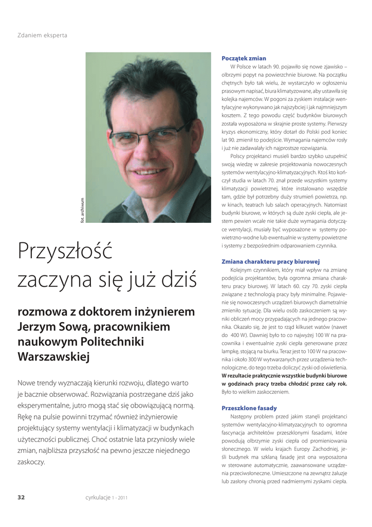Zdaniem eksperta fot. archiwum Początek zmian Przyszłość zaczyna się już dziś rozmowa z doktorem inżynierem Jerzym Sową, pracownikiem naukowym Politechniki Warszawskiej Nowe trendy wyznaczają kierunki rozwoju, dlatego warto je bacznie obserwować. Rozwiązania postrzegane dziś jako eksperymentalne, jutro mogą stać się obowiązującą normą. Rękę na pulsie powinni trzymać również inżynierowie projektujący systemy wentylacji i klimatyzacji w budynkach użyteczności publicznej. Choć ostatnie lata przyniosły wiele zmian, najbliższa przyszłość na pewno jeszcze niejednego zaskoczy. 32 cyrkulacje 1 - 2011 W Polsce w latach 90. pojawiło się nowe zjawisko – olbrzymi popyt na powierzchnie biurowe. Na początku chętnych było tak wielu, że wystarczyło w ogłoszeniu prasowym napisać, biura klimatyzowane, aby ustawiła się kolejka najemców. W pogoni za zyskiem instalacje wentylacyjne wykonywano jak najszybciej i jak najmniejszym kosztem. Z tego powodu część budynków biurowych została wyposażona w skrajnie proste systemy. Pierwszy kryzys ekonomiczny, który dotarł do Polski pod koniec lat 90. zmienił to podejście. Wymagania najemców rosły i już nie zadawalały ich najprostsze rozwiązania. Polscy projektanci musieli bardzo szybko uzupełnić swoją wiedzę w zakresie projektowania nowoczesnych systemów wentylacyjno-klimatyzacyjnych. Ktoś kto kończył studia w latach 70. znał przede wszystkim systemy klimatyzacji powietrznej, które instalowano wszędzie tam, gdzie był potrzebny duży strumień powietrza, np. w kinach, teatrach lub salach operacyjnych. Natomiast budynki biurowe, w których są duże zyski ciepła, ale jestem pewien wcale nie takie duże wymagania dotyczące wentylacji, musiały być wyposażone w systemy powietrzno-wodne lub ewentualnie w systemy powietrzne i systemy z bezpośrednim odparowaniem czynnika. Zmiana charakteru pracy biurowej Kolejnym czynnikiem, który miał wpływ na zmianę podejścia projektantów, była ogromna zmiana charakteru pracy biurowej. W latach 60. czy 70. zyski ciepła związane z technologią pracy były minimalne. Pojawienie się nowoczesnych urządzeń biurowych diametralnie zmieniło sytuację. Dla wielu osób zaskoczeniem są wyniki obliczeń mocy przypadających na jednego pracownika. Okazało się, że jest to rząd kilkuset watów (nawet do 400 W). Dawniej było to co najwyżej 100 W na pracownika i ewentualnie zyski ciepła generowane przez lampkę, stojącą na biurku. Teraz jest to 100 W na pracownika i około 300 W wytwarzanych przez urządzenia technologiczne, do tego trzeba doliczyć zyski od oświetlenia. W rezultacie praktycznie wszystkie budynki biurowe w godzinach pracy trzeba chłodzić przez cały rok. Było to wielkim zaskoczeniem. Przeszklone fasady Następny problem przed jakim stanęli projektanci systemów wentylacyjno-klimatyzacyjnych to ogromna fascynacja architektów przeszklonymi fasadami, które powodują olbrzymie zyski ciepła od promieniowania słonecznego. W wielu krajach Europy Zachodniej, jeśli budynek ma szklaną fasadę jest ona wyposażona w sterowane automatycznie, zaawansowane urządzenia przeciwsłoneczne. Umieszczone na zewnątrz żaluzje lub zasłony chronią przed nadmiernymi zyskami ciepła. Zdaniem eksperta Nowe trendy wyznaczają kierunki Zrównoważony rozwój Idea rozwoju zrównoważonego polega na odejściu od budowania jak największej powierzchni biurowej po jak najmniejszych kosztach. Wznoszone budynki muszą mieć przede wszystkim bardzo dobre charakterystyki, opisujące wpływ obiektu na środowisko. Pojawiła się dbałość o dobór materiałów budowlanych, minimalizowanie zużycia energii, oraz preferowanie jej źródeł odnawianych. Wpłynęło to na bryłę budynku i sposób zagospodarowania najbliższego otoczenia. Zmiany dotyczą również instalacji wentylacyjno-klimatyzacyjnych. Pojawiło się pytanie czy obowiązujący model komfortu cieplnego, zbudowany na teorii Ole Fangera z lat 70. wykorzystującej dwa wskaźniki PMV i PPD, jest rzeczywiście tym jedynym, według którego należy projektować budynki. Sprawdzono jak żyją ludzie w budynkach pozbawionych klimatyzacji. Okazało się, że dość dobrze sobie radzą, dostosowując własne zachowania do warunków panujących w pomieszczeniach. Jeśli nie ma klimatyzacji, ludzie zaczynają się inaczej ubierać, intensyfikują ruch powietrza, otwierając okna lub wykorzystując różnego rodzaju wentylatory. Zaskakujące było to, że poziom niezadowolenia nie był tak duży, jakby to wynikało z metody oceny według teorii Fangera. Na podstawie tych obserwacji zostały uruchomione projekty badawcze. Przebadano wiele budynków i stwierdzono, że istnieje inne podejście tzw. adaptacyjny model komfortu cieplnego. O ile w pierwszej teorii fangerowskiej zakładamy jaką aktywność fizyczną będzie miał człowiek, w co będzie ubrany i dostosowujemy parametry środowiska, tak by był zadowolony, w modelu komfortu adaptacyjnego szacujemy jakie są parametry środowiskowe i zastanawiamy się jak człowiek może dostosować swoją aktywność i izolacyjność odzieży, aby osiągnąć pożądany komfort cieplny. Jaki system wentylacji powinno się zaprojektować w budynku wpisującym się w trend rozwoju zrównoważonego? Odpowiedzią na to pytanie są systemy wentylacji hybrydowej, wykorzystujące częściowo energię gruntu, częściowo energię słoneczną lub efekt wyporu cieplnego. Konsekwencją zmiany technologii pracy biurowej i dużych przeszkleń w budynkach biurowych jest wzrost charakterystyki typowych zysków na m2 powierzchni. Kiedyś było to kilkadziesiąt watów na 1 m2 teraz ponad 100 W/m2. Utrudnia to prawidłowy rozdział powietrza i takie zaprojektowanie instalacji, aby uniknąć przeciągów i przegrzewania. Przy zyskach rzędu 50-60 W/m2 zapewnienie komfortu jest znacznie łatwiejsze niż przy zyskach 100-120 W/m2. Po przekroczeniu pewnych wartości w praktyce staje się