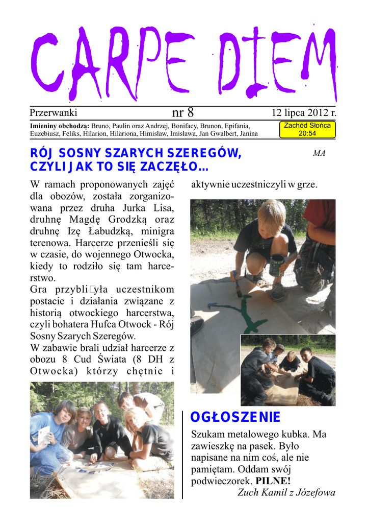 Przerwanki nr 8 12 lipca 2012 r. Imieniny obchodzą: Bruno, Paulin oraz Andrzej, Bonifacy, Brunon, Epifania, Euzebiusz, Feliks, Hilarion, Hilariona, Himisław, Imisława, Jan Gwalbert, Janina RÓJ SOSNY SZARYCH SZEREGÓW, CZYLI JAK TO SIĘ ZACZĘŁO... W ramach proponowanych zajęć dla obozów, została zorganizowana przez druha Jurka Lisa, druhnę Magdę Grodzką oraz druhnę Izę Łabudzką, minigra terenowa. Harcerze przenieśli się w czasie, do wojennego Otwocka, kiedy to rodziło się tam harcerstwo. Gra przybliżyła uczestnikom postacie i działania związane z historią otwockiego harcerstwa, czyli bohatera Hufca Otwock - Rój Sosny Szarych Szeregów. W zabawie brali udział harcerze z obozu 8 Cud Świata (8 DH z Otwocka) którzy chętnie i Zachód Słońca 20:54 MA aktywnie uczestniczyli w grze. OGŁOSZENIE Szukam metalowego kubka. Ma zawieszkę na pasek. Było napisane na nim coś, ale nie pamiętam. Oddam swój podwieczorek. PILNE! Zuch Kamil z Józefowa CARPE DIEM - Gazetka obozowa Nr 8 - 12 lipca 2012 r. WYKREŚLANKA Wyszukaj 13 haseł. Hasła są zaszyfrowane w pionie i poziomie: Przerwanki, ognisko, mundur, harcerze,namiot, warta, chatki, obóz, harcerki, pionierka, zuchy, Cyranka, sznur. N I W A R T A O G M S S B O Y G F A K H B V B N G H J D D W B G F G M L A C C K J B A J F A R Ó H W S I N A H A R C E R Z E F T Z P T Z O D D A Z M Y M C U W J Y O K P N T E T T C F R N E C C R U G L G U A W H K L K A S R H R M U N D U R L D F I O O N W K Y T G G P S U K P I O N E R K A I A O G N I S K O G B B K G P A K H M Y K O H W T P P R Z E R W A N K I O H K L M M O TWARDZIEL I HAFTY... “W czasie deszczu, dzieci się nudzą..” ale druh Maja nie! On ma talent!!! Podczas deszczowego wieczoru druh został ”przyłapany” na haftowaniu. W poprzednich wydaniach gazetki pokazałyśmy jak świetnie radzi sobie z ciężkim pracami fizycznymi wymianą zgniecionej rury kanalizacyjnej, a dziś zupełnie odmieniony... relaksuje się podczas wyszywania. MA CARPE DIEM - Gazetka obozowa Nr 8 - 12 lipca 2012 r. Lana - Oliwia Fabińska. PRZEŻYCIA Z WYSPY ROBINSON Publikujemy kolejny odcinek odpowiadania Lany. Dzień trzeci Obudziłam się gdy był jeszcze półmrok. W oddali spostrzegłam pływający na fali kuferek. Z powodu mojej nie wielkiej siły, obudziłam Hanę, która pomogła ściągnąć mi go na brzeg. W środku znajdowały się nic nie warte dla nas w tej sytuacji sznurki. Bynajmmniej tak nam się zdawało na początku. Jednak przez upał i zmęczenie okazało się że nasze myśli poważnie odbiegły od rzeczywistości ale ja się sobie nie dziwie, mając tylko 19 lat moja przygoda z odpowiedzialnością dopiero się zaczynała. Nie wiedziałam, a zresztą nie tylko ja, ale wszystkie dziewczyny jak smakuje prawdziwe życie, a szczególnie takie w zgodzie z naturą z daleka od cywilizacji. Gdy Stella z Jenny w końcu się przebudziły, my miałyśmy już plan jak wykorzystać znalezione sznurki. Naszym pierwszym celem było zbudowanie takiego miejsca, które na czas naszego pobytu na wyspie zamieniło się w dom. Pod koniec dnia nasze zmęczenie było tak ogromne, że nie byłyśmy w stanie zacząć jakichkolwiek działań. Położyłyśmy się więc spać z opuszczającą nas nadzieją na znalezienie drogi powrotnej. Z NOTATNIKA DRUHA ADAMA - Cz. III Adam Bętkowski: Czemu piraci i rozbitkowie? Piraci i Rozbitkowie: Bo to fajna tematyka. Jakie macie zastępy? „Wesołe Majtki”, „Złote Zęby”, „Piraci z Karaibów”, „Drużyna Jacka Sparrowa” i „Uśmiechnięta Arka” Jaki jest Wasz główny cel? o o 22 C CZWARTEK - 12 LIPCA Przeżyć, dobrze się bawić i coś stąd „wynieść” Skąd jesteście? Jesteśmy Szczepem „Knieja” z Gdańska Jaki jest podział, kim są piraci i kim są rozbitkowie? Rozbitkowie to harcerze starsi, a piratów stanowi kadra. o o 20 C PIĄTEK - 13 LIPCA o o 19 C SOBOTA - 14 LIPCA CARPE DIEM - Gazetka obozowa Nr 8 - 12 lipca 2012 r. HARCERSKA WĘDRÓWKA Wczoraj rozmawiałyśmy z druhem Janem Kostrzewą, który krótko zrelacjonował nam wyprawę 5 DHS na wędrówkę do Wilna – stolicy Litwy. Harcerze wyjechali około 5 rano. Bezpośrednio po przybyciu na miejsce (około godziny 11) rozpoczęli zwiedzanie. Przewodnik (a właściwie “piękna pani przewodnik z głośniczkiem na MA brzuchu”) poprowadziła grupę przez najciekawsze i warte obejrzenia miejsca takie jak: Ostra Brama, cmentarz na Rossie, który został założony w 1769 roku i jest jednym z czterech polskich nekropolii narodowych, mauzoleum matki Józefa Piłsudskiego i serca syna, grób Joachima Lelewela (1786 – 1861), polskiego historyka, bibliografa, poligloty i działacza politycznego, starówkę, Kościół Św. Piotra i Pawła i wiele innych miejsc. Uczestnicy wędrówki wybrali się także do miejscowości Druskienniki, w której znajduje się Aqua Park i skorzystali z możliwości przeżycia wodnej przygody. Redakcja: Marlena Gacka, Anna Rowińska, Marta Fornalska. Siedziba redakcji znajduje się w kurniku.
