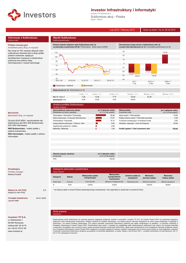 Investor Infrastruktury i Informatyki Investor IT & Infrastructure Subfundusz akcji - Polska Equity - Poland Luty 2012 / February 2012 Informacje o Subfunduszu Wyniki Subfunduszu Subfund data Subfund performance Polityka inwestycyjna Investment policy (Eng. on request) Zmiana wartości aktywów netto Subfunduszu (kat. A) na jednostkę uczestnictwa (PLN) / Performance - Share class A (PLN) Nie mniej niż 70% wartości aktywów netto subfunduszu lokowane jest w akcje spółek polskich emitentów, będących beneficjentami inwestycji w infrastrukturę publiczną oraz sektory usług informatycznych i nowych technologii. Dane na dzień / As of: 29.02.2012 Skumulowana stopa zwrotu z Subfunduszu (kat. A) za pełne lata kalendarzowe (w %) / Cumulative performance (in %) 30 115 22,38 20 100 10 85 0 70 -10 55 -20 40 -30 25 28.01.08 04.02.09 12.02.10 Subfundusz / Subfund 20.02.11 -17,62 -22,60 -25,68 -26,52 -40 28.02.12 2011 1 rok 2010-11 2 lata 2009-11 3 lata Benchmark Stopa zwrotu (w %) / Performance (in %) 1 msc / 1 m 3 msc / 3 m 36 msc / 36 m 60 msc / 60 m 7,28 12,99 6 msc / 6 m 5,18 12 msc / 12 m kat. A / class A -22,60 22,38 - benchmark / bm 6,34 12,02 4,45 -26,52 - - Analiza portfela Subfunduszu Portfolio Analysis Dywersyfikacja sektorowa (akcje) Breakdown by sector (equities) Benchmark Benchmark (Eng. on request) (w % aktywów netto) (in % of net assets) Skład portfela Investment ratio (w % aktywów netto) (in % of net assets) Informatyka / Information Technology 29,46 Akcje razem / Total equities Dobra luksusowe / Consumer Discretionary 17,57 Papiery dłużne razem / Total debt securities Od dnia 29.05.2009 r. benchmarkiem dla Subfunduszu jest 50% WIG Budownictwo, 50% WIG Informatyka Przemysłowy / Industrials 16,14 Fundusze inwestycyjne / Investment funds WIG Budownictwo - indeks spółek z sektora budownictwo Usługi telekomunikacyjne / Telecom. Serv. 5,65 Użyteczność publiczna / Utilities 2,59 Materiały / Materials 1,65 74,94 0,00 0,00 Gotówka i depozyty / Cash and Deposit 25,06 Portfel ogółem / Total investment ratio 100,00 WIG Informatyka - indeks spółek z sektora informatyka Otwarte pozycje walutowe Currencies (w % aktywów netto) (in % of net assets) PLN Kategorie jednostek uczestnictwa Zarządzający Portfolio manager Maciej Chudzik Share classes Kategoria Waluta Maksymalna opłata manipulacyjna Maksymalne wynagrodzenie Towarzystwa Zmienna opłata za zarządzanie Minimalna pierwsza wpłata Minimalna kolejna wpłata Share class Currency Front load fee Maximum management fee Performance fee Minimal investment Minimal subsequent PLN 5,00% 4,00% - 100,00* 50,00* A Aktywa (w mln PLN) Assets (in mln PLN) Początek działalności Launch date 100,00 3,0 * nie dotyczy wpłat w ramach Planów Systematycznego Inwestowania / Non applicable to Systematic Investments Plans 28.01.2008 Nota prawna Disclaimer Investors TFI S.A. ul. Mokotowska 1 00-640 Warszawa Infolinia 801 00 33 70 lub +48 22 378 91 99 www.investors.pl Dotychczasowe wyniki Subfunduszu nie stanowią gwarancji osiągnięcia podobnych wyników w przyszłości. Investors TFI S.A. ani Investor Parasol SFIO nie gwarantują osiągnięcia założonych celów inwestycyjnych Subfunduszu. Niniejszy materiał ma charakter informacyjny i nie zawiera pełnych informacji niezbędnych do oceny ryzyka związanego z inwestycją w Subfundusz i nie stanowi przekazu reklamowego. Przy nabyciu jednostek uczestnictwa Subfunduszu pobierana jest opłata manipulacyjna na zasadach i w wysokości określonej w Prospekcie Informacyjnym Investor Parasol SFIO. Prezentowane stopy zwrotu z inwestycji nie uwzględniają opłat manipulacyjnych pobieranych przy nabyciu lub konwersji jednostek uczestnictwa. Szczegółowy opis czynników ryzyka, zasady sprzedaży jednostek uczestnictwa Subfunduszu, tabela opłat manipulacyjnych oraz szczegółowe informacje podatkowe zawarte są w Prospekcie Informacyjnym Investor Parasol SFIO, dostępnym w punktach dystrybucji Funduszu, siedzibie Towarzystwa oraz na stronie www.investors.pl. Zyski osiągnięte z inwestycji w jednostki uczestnictwa Subfunduszu obciążone są podatkiem od dochodów kapitałowych, na podst. Ustawy z dnia 26 lipca 1991 r. o podatku dochodowym od osób fizycznych, (Dz. U. 00.14.176 z późniejszymi zmianami).