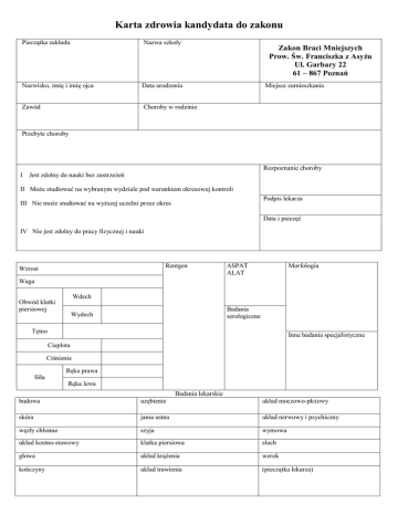 Karta zdrowia kandydata do zakonu Pieczątka zakładu Nazwa szkoły Nazwisko, imię i imię ojca Data urodzenia Zawód Choroby w rodzinie Zakon Braci Mniejszych Prow. Św. Franciszka z Asyżu Ul. Garbary 22 61 – 867 Poznań Miejsce zamieszkania Przebyte choroby Rozpoznanie choroby I Jest zdolny do nauki bez zastrzeżeń II Może studiować na wybranym wydziale pod warunkiem okresowej kontroli Podpis lekarza III Nie może studiować na wyższej uczelni przez okres Data i pieczęć IV Nie jest zdolny do pracy fizycznej i nauki Rentgen Wzrost ASPAT ALAT Morfologia Waga Wdech Obwód klatki piersiowej Badania serologiczne Wydech Tętno Inne badania specjalistyczne Ciepłota Ciśnienie Ręka prawa Siła Ręka lewa Badania lekarskie budowa uzębienie układ moczowo-płciowy skóra jama ustna układ nerwowy i psychiczny węzły chłonne szyja wymowa układ kostno-stawowy klatka piersiowa słuch głowa układ krążenia wzrok kończyny układ trawienia (pieczątka lekarza)