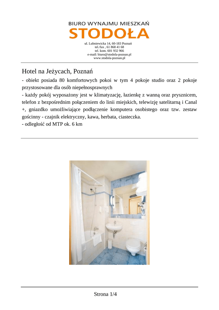 ul. Lubniewicka 14, 60-183 Poznań tel./fax , 61 868 41 68 tel. kom. 601 932 966 e-mail: [email protected] www.stodola-poznan.pl Hotel na Jeżycach, Poznań - obiekt posiada 80 komfortowych pokoi w tym 4 pokoje studio oraz 2 pokoje przystosowane dla osób niepełnosprawnych - każdy pokój wyposażony jest w klimatyzację, łazienkę z wanną oraz prysznicem, telefon z bezpośrednim połączeniem do linii miejskich, telewizję satelitarną i Canal +, gniazdko umożliwiające podłączenie komputera osobistego oraz tzw. zestaw gościnny - czajnik elektryczny, kawa, herbata, ciasteczka. - odległość od MTP ok. 6 km Strona 1/4 Hotel na Jeżycach, Poznań Strona 2/4 Hotel na Jeżycach, Poznań Strona 3/4 Hotel na Jeżycach, Poznań Strona 4/4