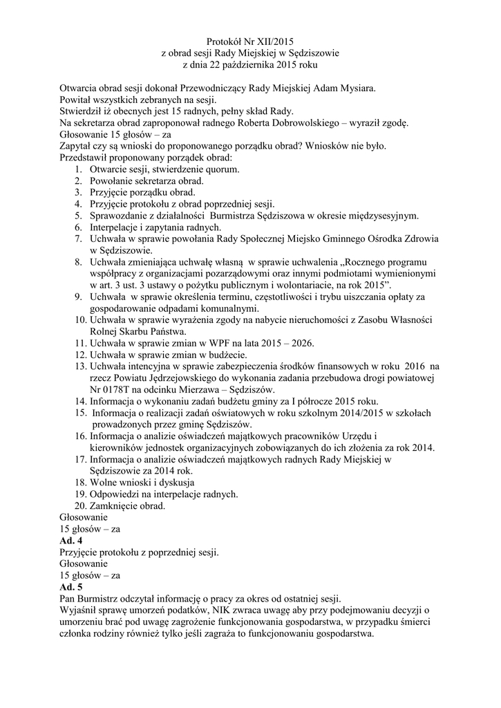 Protokół Nr XII/2015 z obrad sesji Rady Miejskiej w Sędziszowie z dnia 22 października 2015 roku Otwarcia obrad sesji dokonał Przewodniczący Rady Miejskiej Adam Mysiara. Powitał wszystkich zebranych na sesji. Stwierdził iż obecnych jest 15 radnych, pełny skład Rady. Na sekretarza obrad zaproponował radnego Roberta Dobrowolskiego – wyraził zgodę. Głosowanie 15 głosów – za Zapytał czy są wnioski do proponowanego porządku obrad? Wniosków nie było. Przedstawił proponowany porządek obrad: 1. Otwarcie sesji, stwierdzenie quorum. 2. Powołanie sekretarza obrad. 3. Przyjęcie porządku obrad. 4. Przyjęcie protokołu z obrad poprzedniej sesji. 5. Sprawozdanie z działalności Burmistrza Sędziszowa w okresie międzysesyjnym. 6. Interpelacje i zapytania radnych. 7. Uchwała w sprawie powołania Rady Społecznej Miejsko Gminnego Ośrodka Zdrowia w Sędziszowie. 8. Uchwała zmieniająca uchwałę własną w sprawie uchwalenia „Rocznego programu współpracy z organizacjami pozarządowymi oraz innymi podmiotami wymienionymi w art. 3 ust. 3 ustawy o pożytku publicznym i wolontariacie, na rok 2015”. 9. Uchwała w sprawie określenia terminu, częstotliwości i trybu uiszczania opłaty za gospodarowanie odpadami komunalnymi. 10. Uchwała w sprawie wyrażenia zgody na nabycie nieruchomości z Zasobu Własności Rolnej Skarbu Państwa. 11. Uchwała w sprawie zmian w WPF na lata 2015 – 2026. 12. Uchwała w sprawie zmian w budżecie. 13. Uchwała intencyjna w sprawie zabezpieczenia środków finansowych w roku 2016 na rzecz Powiatu Jędrzejowskiego do wykonania zadania przebudowa drogi powiatowej Nr 0178T na odcinku Mierzawa – Sędziszów. 14. Informacja o wykonaniu zadań budżetu gminy za I półrocze 2015 roku. 15. Informacja o realizacji zadań oświatowych w roku szkolnym 2014/2015 w szkołach prowadzonych przez gminę Sędziszów. 16. Informacja o analizie oświadczeń majątkowych pracowników Urzędu i kierowników jednostek organizacyjnych zobowiązanych do ich złożenia za rok 2014. 17. Informacja o analizie oświadczeń majątkowych radnych Rady Miejskiej w Sędziszowie za 2014 rok. 18. Wolne wnioski i dyskusja 19. Odpowiedzi na interpelacje radnych. 20. Zamknięcie obrad. Głosowanie 15 głosów – za Ad. 4 Przyjęcie protokołu z poprzedniej sesji. Głosowanie 15 głosów – za Ad. 5 Pan Burmistrz odczytał informację o pracy za okres od ostatniej sesji. Wyjaśnił sprawę umorzeń podatków, NIK zwraca uwagę aby przy podejmowaniu decyzji o umorzeniu brać pod uwagę zagrożenie funkcjonowania gospodarstwa, w przypadku śmierci członka rodziny również tylko jeśli zagraża to funkcjonowaniu gospodarstwa. Prawdopodobnie w tym zakresie będą prowadzone kontrole przez NIK. Jeśli chodzi o suszę my wysłaliśmy w teren Komisję aby później nie było zarzutów że czegoś nie dopełniliśmy. Pan Przewodniczący - poinformował że obrady sesji są nagrywane. Ad. 6 Radny N. Jawor - mieszkańcy Zielonek proszą o przystanek przy drodze powiatowej na początku do Sielca, - ponawiam prośbę o założenie po 3-4 dreny przy przystanku w Boleścicach k/przejazdu, ludzie stoją na poboczu, tam jest łuk ludzie jadący w kierunku Jędrzejowa czekający po prawej stronie nie mają gdzie uciec przed pędzącymi samochodami, to samo jest przy ostatnio zamontowanym przystanku, też konieczny montaż dren, dreny są potrzebna koparka do zamontowania, - proszę uporządkować znaki Grązów – Zapusta bo są połamane słupki, uzupełnić przed zimą aby nie było problemu przy odśnieżaniu, bo nie wiadomo jaka to droga, - prośba o tablicę z numerami domów na początku od Piołunki 28 – 23, Pogotowie ma problem ze znalezieniem. Radny W. Tabor - prośba o podcięcie drzew w Pile koło świetlicy w obrębie słupów oświetleniowych, - podciąć konary kasztana w pasie drogowym przy posesji 132 w Gniewięcinie, - na strzelnicy zamiast ubywać, przybywa konarów i gałęzi, - rozpocząć procedury o przejęcie gruntu pod drogę Piła kierunek p. Tasak. Radny M. Żelezik - kończy się rok 2015 w Swaryszowie przeznaczono fundusz sołecki na drogę część zrobiono (wytyczono, wykopano ale nie wyrównano i nie dowieziono kamienia), Rada Sołecka prosi o dokończenie prac przed zimą, - łuk drogi k/Koziński powstał drugi rów między drogą – poboczem a rowem głównym na długości ok. 50m, ludzie teraz mają samochody z niskim podwoziem, zasypać kamieniem bo można urwać podwozie, - na jakim etapie jest czyszczenie koryta rzeki od posesji Dłużniak kierunek Białowieża? Pan Przemyski opracował projekt akie prace mają być wykonane, najlepiej to robić gdy grunt jest zamarznięty, na jakim to jest etapie i czy te prace będą zakończone? - p. B. Wachowicz zgłasza że na drodze od sióstr kierunek Gródek kierowcy przekraczają dozwoloną prędkość stwarzając zagrożenie dla pieszych, przekazać Policji o zwrócenie uwagi na tym odcinku, taka sytuacja często się powtarza, już sama obecność Policji powoduje zmniejszenie prędkości przez kierowców, - analizując projekt budżetu na drogi w moim rejonie to jest urągające, pracownicy wstawiają tylko środki z funduszu sołeckiego a budżet zapomina o tym obwodzie Nr 4, - jwst taka sugestia droga w Czekaju długości 250m, od krzyżówki kierunek p. Rokicki lub p. Makowski zaplanować na 2016 rok, woda z lasu zalewa. Radna A. Konieczna - na przejeździe niestrzeżonym założono sygnalizację świetlną, a czy jest szansa aby również była na LHS, - był czyszczony rów w Krzcięcicach przy szkole ale prosimy go jeszcze pogłębić. Radny Z. Konieczny - odmulić i udrożnić przepust przy drodze powiatowej jak się Jeżów zaczyna a Podsadek kończy i droga nasza prowadzi w kierunku p. Ostrowskiego, - jadąc od Klimontowa kierunek Mstyczów jest znak teren zabudowany, jest skrzyżowanie i dalej też powinien być znak teren zabudowany, bo tak to Policja łapie pieszych bez odblasków. - fi