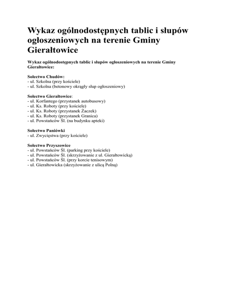 Wykaz ogólnodostępnych tablic i słupów ogłoszeniowych na terenie Gminy Gierałtowice Wykaz ogólnodostępnych tablic i słupów ogłoszeniowych na terenie Gminy Gierałtowice: Sołectwo Chudów: - ul. Szkolna (przy kościele) - ul. Szkolna (betonowy okrągły słup ogłoszeniowy) Sołectwo Gierałtowice: - ul. Korfantego (przystanek autobusowy) - ul. Ks. Roboty (przy kościele) - ul. Ks. Roboty (przystanek Żaczek) - ul. Ks. Roboty (przystanek Granica) - ul. Powstańców Śl. (na budynku apteki) Sołectwo Paniówki - ul. Zwycięstwa (przy kościele) Sołectwo Przyszowice - ul. Powstańców Śl. (parking przy kościele) - ul. Powstańców Śl. (skrzyżowanie z ul. Gierałtowicką) - ul. Powstańców Śl. (przy korcie tenisowym) - ul. Gierałtowicka (skrzyżowanie z ulicą Polną)