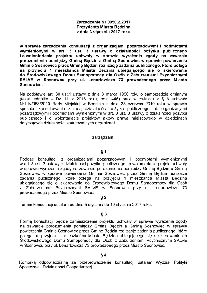 Zarządzenie Nr 0050.2.2017 Prezydenta Miasta Będzina z dnia 3 stycznia 2017 roku w sprawie zarządzenia konsultacji z organizacjami pozarządowymi i podmiotami wymienionymi w art. 3 ust. 3 ustawy o działalności pożytku publicznego i o wolontariacie projektu uchwały w sprawie wyrażenia zgody na zawarcie porozumienia pomiędzy Gminą Będzin a Gminą Sosnowiec w sprawie powierzenia Gminie Sosnowiec przez Gminę Będzin realizację zadania publicznego, które polega na przyjęciu 1 mieszkańca Miasta Będzina ubiegającego się o skierowanie do Środowiskowego Domu Samopomocy dla Osób z Zaburzeniami Psychicznymi SALVE w Sosnowcu przy ul. Lenartowicza 73 prowadzonego przez Miasto Sosnowiec. Na podstawie art. 30 ust.1 ustawy z dnia 8 marca 1990 roku o samorządzie gminnym (tekst jednolity – Dz. U. z 2016 roku, poz. 446) oraz w związku z § 6 uchwały Nr LIV/958/2010 Rady Miejskiej w Będzinie z dnia 28 czerwca 2010 roku w sprawie sposobu konsultowania z radą działalności pożytku publicznego lub organizacjami pozarządowymi i podmiotami wymienionymi w art. 3 ust. 3 ustawy o działalności pożytku publicznego i o wolontariacie projektów aktów prawa miejscowego w dziedzinach dotyczących działalności statutowej tych organizacji zarządzam: §1 Poddać konsultacji z organizacjami pozarządowymi i podmiotami wymienionymi w art. 3 ust. 3 ustawy o działalności pożytku publicznego i o wolontariacie projekt uchwały w sprawie wyrażenia zgody na zawarcie porozumienia pomiędzy Gminą Będzin a Gminą Sosnowiec w sprawie powierzenia Gminie Sosnowiec przez Gminę Będzin realizację zadania publicznego, które polega na przyjęciu 1 mieszkańca Miasta Będzina ubiegającego się o skierowanie do Środowiskowego Domu Samopomocy dla Osób z Zaburzeniami Psychicznymi SALVE w Sosnowcu przy ul. Lenartowicza 73 prowadzonego przez Miasto Sosnowiec. §2 Termin konsultacji ustalam od dnia 5 stycznia do 19 stycznia 2017 roku. §3 Formą konsultacji będzie zamieszczenie projektu uchwały w sprawie wyrażenia zgody na zawarcie porozumienia pomiędzy Gminą Będzin a Gminą Sosnowiec w sprawie powierzenia Gminie Sosnowiec przez Gminę Będzin realizację zadania publicznego, które polega na przyjęciu 1 mieszkańca Miasta Będzina ubiegającego się o skierowanie do Środowiskowego Domu Samopomocy dla Osób z Zaburzeniami Psychicznymi SALVE w Sosnowcu przy ul. Lenartowicza 73 prowadzonego przez Miasto Sosnowiec. §4 Komórką odpowiedzialną za przeprowadzenie konsultacji ustalam Wydział Polityki Społecznej i Działalności Gospodarczej. §5 Wykonanie zarządzenia powierza się Zastępcy Naczelnika Wydziału Polityki Społecznej i Działalności Gospodarczej Urzędu Miejskiego w Będzinie. §6 Zarządzenie wchodzi w życie z dniem podpisania. Sporządziła: Magdalena Małkowska Zatwierdziła: