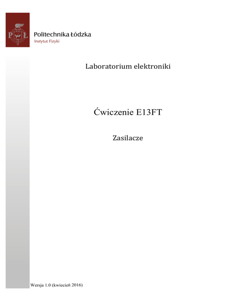 Laboratorium elektroniki Ćwiczenie E13FT Zasilacze Wersja 1.0 (kwiecień 2016) Ćwiczenie E13FT – Zasilacze Spis treści: 1. Cel ćwiczenia........................................................................................................................ 3 2. ZagroŜenia ............................................................................................................................ 3 3. Wprowadzenie ...................................................................................................................... 3 4. Dostępna aparatura ............................................................................................................... 9 4.1. Moduły doświadczalne badanego zasilacza .................................................................... 9 4.2. Multimetry..................................................................................................................... 11 4.3. Oscyloskopy .................................................................................................................. 11 5. Przebieg doświadczenia...................................................................................................... 12 5.1. Część podstawowa ........................................................................................................ 13 5.2. Część rozszerzona ......................................................................................................... 15 6. Wskazówki do raportu........................................................................................................ 15 7. Literatura ............................................................................................................................ 16 7.1. Literatura podstawowa .................................................................................................. 16 7.2. Literatura uzupełniająca ................................................................................................ 16 8. Aneksy ................................................................................................................................ 16 A1. Tabela wartości elementów biernych ............................................................................ 16 -2- Ćwiczenie E13FT – Zasilacze Przed zapoznaniem się z instrukcją i przystąpieniem do wykonywania ćwiczenia naleŜy opanować następujący materiał teoretyczny: 1. Półprzewodnikowe diody prostownicze. [1], [2]. 2. Prostownik jednofazowy półfalowy (jednopołówkowy). [1]. 3. Prostownik jednofazowy całofalowy (dwupołówkowy). [1]. 1. Cel ćwiczenia Celem ćwiczenia jest poznanie zasady działania i właściwości półprzewodnikowych układów prostowniczych. Zakres ćwiczenia obejmuje układ prostownika jednofazowego (jedno- i dwupołówkowego) bez filtrów oraz z dolnoprzepustowymi filtrami wyjściowymi. 2. Zagrożenia Rodzaj zagroŜenie elektryczne zagroŜenie optyczne zagroŜenie mechaniczne (w tym akustyczne, hałas) zagroŜenie polem elektro-magnetycznym (poza widmem optycznym) zagroŜenie biologiczne zagroŜenie radioaktywne (jonizujące) zagroŜenie chemiczne zagroŜenie termiczne (w tym wybuch i poŜar) Brak Małe Średnie DuŜe + + + + + + + + Przewody z wtykami bananowymi są przeznaczone wyłącznie do uŜytku w obwodach niskiego napięcia – nie wolno podłączać ich do gniazda sieci zasilającej 230 V. 3. Wprowadzenie Większość układów elektronicznych, aby właściwie spełniać swoją funkcję, wymaga odpowiedniego zasilania. Nie zawsze moŜna zastosować źródło jakim jest bateria czy teŜ akumulator. Wszędzie tam gdzie jest wymagana większa moc stosuje się zasilacze sieciowe o parametrach wyjściowych dostosowanych do wymagań zasilanego urządzenia. Klasyczny zasilacz sieciowy napięcia stałego składa się z bloku obniŜającego napięcie sieci 230V, czyli po prostu z transformatora oraz z układu zamieniającego obniŜone napięcie przemienne na stałe, czyli układu prostownika z filtrem. Układy prostownicze są podstawowymi podzespołami zasilającymi układy elektroniczne. Jednym z najczęstszych i najprostszych zastosowań diody jest wykorzystanie jej jako prostownika. Prostownik zamienia prąd przemienny na prąd jednokierunkowy. Często o diodach mówi się „prostownik”, mając na myśli takie właśnie zastosowanie. Z analizy statycznej charakterystyki prądowo-napięciowej półprzewodnikowej diody prostowniczej wynika, Ŝe dioda zaczyna przewodzić prąd dopiero po przekroczeniu pewnego napięcia progowego (Ćwiczenie E02: Diody). Wartość tego napięcia zaleŜy od rodzaju półprzewodnika z jakiego zbudowana jest dioda. Dla krzemu przyjmuje ono wartość ∼0,7V. Diody prostownicze są najczęściej diodami krzemowymi. Cechuje je duŜe nachylenie -3- Ćwiczenie E13FT – Zasilacze charakterystyki prądowo-napięciowej powyŜej napięcia progowego oraz znaczna dopuszczalna temperatura pracy złącza krzemowego osiągająca wartość ∼150°C. Najprostszym układem prostowniczym jest układ, którego schemat przedstawiono na rys. 1. Ug jest źródłem napięcia przemiennego (przebieg zielony), a RL jest rezystancją reprezentującą obciąŜenie prostownika. Ug moŜe być napięciem zmiennym (takim jak na przykład w sieci energetycznej 230V / 50Hz), które jest obniŜane na transformatorze sieciowym i podawane na diodę D. Tak więc dla wejściowego napięcia sinusoidalnego o amplitudzie zdecydowanie większej od napięcia przewodzenia diody (∼0,7V) przebieg napięcia na obciąŜeniu UL wygląda tak jak na rys. 1 (przebieg czerwony). Napięcie UL ≠ 0 występuje więc jedynie przez połowę okresu sinusoidalnego napięcia wejściowego Ug. Jak widać przez diodę przedostają się tylko dodatnie połówki sinusoidy (oczywiście wtedy gdy Ug>0,7V), gdyŜ wówczas dioda jest spolaryzowana w kierunku przewodzenia. MoŜna więc powiedzieć, Ŝe jest to prostownik jednopołówkowy. Rys. 1. Schemat układu
