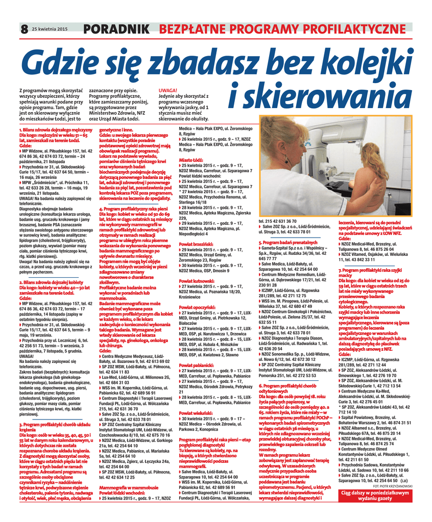 8 25 kwietnia 2015 PORADNIK BEZPŁATNE PROGRAMY PROFILAKTYCZNE Gdzie się zbadasz bez kolejki i skierowania Z programów mogą skorzystać wszyscy ubezpieczeni, którzy spełniają warunki podane przy opisie programu. Tam, gdzie jest on skierowany wyłącznie do mieszkańców Łodzi, jest to zaznaczone przy opisie. Programy prolaktyczne, które zamieszczamy poniżej, są przygotowane przez Ministerstwo Zdrowia, NFZ oraz Urząd Miasta Łodzi. 1. Bilans zdrowia dojrzałego mężczyzny Dla kogo: mężczyźni w wieku 51 – 65 lat, zamieszkali na terenie Łodzi. Gdzie: l MP Widzew, al. Piłsudskiego 157, tel. 42 674 86 36, 42 674 03 72, termin – 24 października, 21 listopada l Przychodnia nr 31, ul. SkłodowskiejCurie 15/17, tel. 42 637 64 50, termin – 16 maja, 26 września l MPW „Śródmieście”, ul. Próchnika 11, tel. 42 633 26 28, termin – 16 maja, 19 września, 21 listopada. UWAGA! Na badania należy zapisywać się telefonicznie. Diagnostyka obejmuje badania urologiczne (konsultacja lekarza urologa, badanie usg. gruczołu krokowego i jamy brzusznej, badanie PSA (oznaczanie stężenia swoistego antygenu sterczowego w surowicy krwi), badania analityczne: lipidogram (cholesterol, trójglicerydy), poziom glukozy, wywiad (pomiar masy ciała, pomiar ciśnienia tętniczego krwi, rtg. klatki piersiowej). Uwaga! Na badania należy zgłosić się na czczo, a przed usg. gruczołu krokowego z pełnym pęcherzem. 2. Bilans zdrowia dojrzałej kobiety Dla kogo: kobiety w wieku 40 – 50 lat zamieszkałe na terenie Łodzi. Gdzie: l MP Widzew, al. Piłsudskiego 157, tel. 42 674 86 36, 42 674 03 72, termin – 17 października, 14 listopada (zapisy w ostatnim tygodniu sierpnia). l Przychodnia nr 31, ul. SkłodowskiejCurie 15/17, tel. 42 637 64 5, termin – 9 maja, 19 września. l Przychodnia przy ul. Leczniczej 6, tel. 42 256 51 73, termin – 5 września, 3 października, 7 listopada, 5 grudnia. UWAGA! Na badania należy zapisywać się telefonicznie. Zakres badań (bezpłatnych): konsultacja lekarza ginekologa (lub ginekologaendokrynologa), badania ginekologiczne, badanie usg. dopochwowe, usg. piersi, badania analityczne: lipidogram (cholesterol, trójglicerydy), poziom glukozy, pomiar masy ciała, pomiar ciśnienia tętniczego krwi, rtg. klatki piersiowej. 3. Program profilaktyki chorób układu krążenia Dla kogo: osób w wieku 35, 40, 45, 50 i 55 lat w danym roku kalendarzowym, u których dotychczas nie została rozpoznana choroba układu krążenia. Z diagnostyki mogą skorzystać osoby, które w ciągu ostatnich pięciu lat nie korzystały z tych badań w ramach programu. Adresatami programu są szczególnie osoby obciążone czynnikami ryzyka – nadciśnienie tętnicze krwi, podwyższone stężenie cholesterolu, palenie tytoniu, nadwaga i otyłość, wiek, płeć męska, obciążenia UWAGA! Jedynie aby skorzystać z programu wczesnego wykrywania jaskry, od 1 stycznia musisz mieć skierowanie do okulisty. genetyczne i inne. Gdzie: u swojego lekarza pierwszego kontaktu (wszystkie poradnie podstawowej opieki zdrowotnej mają obowiązek realizacji programu). Lekarz na podstawie wywiadu, pomiarów ciśnienia tętniczego krwi oraz wykonanych badań biochemicznych podejmuje decyzję dotyczącą ponownego badania za pięć lat, edukacji zdrowotnej i ponownego badania za pięć lat, pozostawienia pod kontrolą lekarza POZ poza programem, skierowania na leczenie do specjalisty. 4. Program profilaktyczny raka piersi Dla kogo: kobiet w wieku od 50 do 69 lat, które w ciągu ostatnich 24 miesięcy nie wykonywały mammografii w ramach profilaktyki zdrowotnej lub otrzymały w ramach realizacji programu w ubiegłym roku pisemne wskazania do wykonania ponownego badania mammograficznego po upływie dwunastu miesięcy. Programem nie mogą być objęte kobiety, u których wcześniej w piersi zdiagnozowano zmiany nowotworowe o charakterze złośliwym. Profilaktyczne badanie można wykonać w poradniach lub mammobusie. Badanie mammograficzne może również być wykonane poza programem profilaktycznym dla kobiet w każdym wieku, o ile lekarz zadecyduje o konieczności wykonania takiego badania. Wymagane jest wtedy skierowanie od lekarza specjalisty, np. ginekologa, onkologa lub chirurga. Gdzie: l Centra Medyczne Medyceusz, ŁódźBałuty, ul. Bazarowa 9, tel. 42 613 69 02 l SP ZOZ MSW, Łódź-Bałuty, ul. Północna, tel. 42 634 11 83 l Lux-Med, Łódź-Górna, ul. Milionowa 2G, tel. 42 684 31 03 l WSS im. M. Kopernika, Łódź-Górna, ul. Pabianicka 62, tel. 42 689 56 91 l Centrum Diagnostyki i Terapii Laserowej Fundacji PŁ, Łódź-Górna, ul. Wólczańska 215, tel. 42 631 36 70 l Salve ZOZ Sp. z o.o., Łódź-Śródmieście, ul. Struga 3, tel. 42 633 78 01 l SP ZOZ Centralny Szpital Kliniczny Instytut Stomatologii UM, Łódź-Widzew, ul. Czechosłowacka 8/10, tel. 42 675 70 16 l NZOZ Medica, Łódź-Widzew, ul. Gorkiego 21a, tel. 42 254 64 10 l NZOZ Medica, Pabianice, ul. Mariańska 5a, tel. 42 254 64 10 l NZOZ Medica, Zgierz, ul. Łęczycka 24a, tel. 42 254 64 00 l SP ZOZ MSW, Łódź-Bałuty, ul. Północna, tel. 42 42 634 12 25 Mammografia w mammobusie Powiat łódzki wschodni: l 25 kwietnia 2015 r., godz. 9 – 17, NZOZ Medica – Hala Ptak EXPO, ul. Żeromskiego 8, Rzgów l 26 kwietnia 2015 r., godz. 9 – 17, NZOZ Medica – Hala Ptak EXPO, ul. Żeromskiego 8, Rzgów Miasto Łódź: l 25 kwietnia 2015 r. – godz. 9 – 17, NZOZ Medica, Carrefour, ul. Szparagowa 7 Powiat łódzki wschodni: l 25 kwietnia 2015 r. – godz. 9 – 17, NZOZ Medica, Carrefour, ul. Szparagowa 7 * 27 kwietnia 2015 r. – godz. 9 – 17, NZOZ Medica, Przychodnia Renoma, ul. Sterlinga 16/18 l 28 kwietnia 2015 r. – godz. 9 – 17, NZOZ Medica, Apteka Magiczna, Zgierska 229, l 29 kwietnia 2015 r. – godz. 9 – 17, NZOZ Medica, Apteka Magiczna, pl. Niepodległości 4 Powiat brzeziński: l 29 kwietnia 2015 r. – godz. 9 – 17, NZOZ Medica, Urząd Gminy, ul. Żeromskiego 23, Rogów l 30 kwietnia 2015 r. – godz. 9 