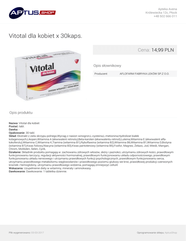 Apteka Avena Królewiecka 12c, Płock +48 502 666 011 Vitotal dla kobiet x 30kaps. Cena: 14,99 PLN Opis słownikowy Producent AFLOFARM FABRYKA LEKÓW SP.Z O.O. Opis produktu Nazwa: Vitotal dla kobiet Postać: tabl. Dawka: Opakowanie: 30 tabl. Skład: Ekstrakt z ziela skrzypu polnego,Wyciąg z nasion winogron,L-cysteina,L-metionina,Hydrolizat białek kolagenowych,Likopen,Witamina A (ekwiwalent retinolu),Beta-karoten (ekwiwalentu retinol),Luteina,Witamina E (ekwiwalent alfatokoferolu),Witamina C,Witamina K,Tiamina (witamina B1),Ryboflawina (witamina B2),Witamina B6,Witamina B1,Witamina D,Biotyna (witamina B7),Kwas foliowy,Niacyna (witamina B3),Kwas pantotenowy (witamina B5),Fosfor, Magnez, Żelazo, Jod, Miedź, Mangan, Chrom, Molibden, Selen, Cynk, Działanie: Składniki produktu pomagają w: zachowaniu zdrowych włosów, skóry i paznokci, utrzymaniu zdrowych kości, prawidłowym funkcjonowaniu tarczycy, regulacji aktywności hormonalnej, prawidłowym funkcjonowaniu układu odpornościowego, prawidłowym funkcjonowaniu układu nerwowego i utrzymaniu prawidłowych funkcji psychologicznych, prawidłowym funkcjonowaniu serca, utrzymaniu prawidłowego metabolizmu węglowodanów i prawidłowego poziomu glukozy we krwi, prawidłowej produkcji czerwonych krwinek i hemoglobiny, utrzymaniu prawidłowego widzenia, pomagają zmniejszyć cellulit Wskazania: Uzupełnienie diety w witaminy, minerały i aminokwasy. Dawkowanie: Dawkowanie: 1 tabletka dziennie. Plik wygenerowano: 03-03-2017 Powered by TCPDF (www.tcpdf.org) Oprogramowanie sklepu: AptusShop