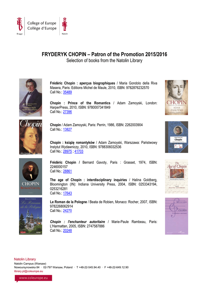 FRYDERYK CHOPIN – Patron of the Promotion 2015/2016 Selection of books from the Natolin Library Frédéric Chopin : aperçus biographiques / Maria Gondolo della Riva Masera, Paris: Editions Michel de Maule, 2010, ISBN: 9782876232570 Call No.: 35489 Chopin : Prince of the Romantics / Adam Zamoyski, London: HarperPress, 2010, ISBN: 9780007341849 Call No.: 27396 Chopin / Adam Zamoyski, Paris: Perrin, 1986, ISBN: 2262003904 Call No.: 13827 Chopin : książę romantyków / Adam Zamoyski, Warszawa: Państwowy Instytut Wydawniczy, 2010, ISBN: 9788306032536 Call No.: 28975 ; 41703 Frédéric Chopin / Bernard Gavoty, Paris : Grasset, 1974, ISBN: 2246000157 Call No.: 28861 The age of Chopin : interdisciplinary inquiries / Halina Goldberg, Bloomington (IN): Indiana University Press, 2004, ISBN: 0253343194, 0253216281 Call No.: 17643 Le Roman de la Pologne / Beata de Robien, Monaco: Rocher, 2007, ISBN: 9782268062914 Call No.: 24270 Chopin : l'enchanteur autoritaire / Marie-Paule Rambeau, Paris: L'Harmattan, 2005, ISBN: 2747587886 Call No.: 20248 Natolin Library Natolin Campus (Warsaw) Nowoursynowska 84 · 02-797 Warsaw, Poland · T +48-22-545.94.40 · F +48-22-649.12.90 [email protected] Chopin: Żelazowa Wola: The House of Birth - Yesterday and Today / Paweł Jaroszewski, Krzysztof Burek, Warszawa: Nobilis, 2010, ISBN: 9788360297407 Call No.: 41702 Żelazowa Wola : The history of Chopin's birthplace / Mariola Wojtkiewicz, Warsaw: The Fryderyk Chopin Institute, 2012, ISBN: 9788361142737 Call No.: 41704 Chopin's Poland: a guidebook to places associated with the composer / Marita Albán Juárez, Ewa Sławińska-Dahlig, Warsaw: Narodowy Instytut Fryderyka Chopina, 2010, ISBN: 9788361142560 Call No.: 41705 Fryderyk Chopin: the origins / Piotr Mysłakowski, Andrzej Sikorski, Warsaw: The Fryderyk Chopin Institute, 2010, ISBN: 9788361142331 Call No.: 41706 Fryderyk Chopin : An illustrated biography / Janusz Ekiert, Warszawa: Muza, 2009, ISBN: 9788374957434 Call No.: 41707 Chopin's Europe / Hanna Komarnicka, Juliusz Komarnicki, Pamela Załuski, Iwo Załuski, Warszawa: Wydawnictwo Sport i Turystyka - Muza, 2010, ISBN: 9788374957441 Call No.: 41708 Fryderyk Chopin : człowiek i jego muzyka = Fryderyk Chopin : the man and his music 1810-2010 / Irena Poniatowska, Warszawa: MULTICO Oficyna Wydawnicza, 2009, ISBN: 9788370738969, 9788370737757 Call No.: 41709 Semper Polonia : l'art en Pologne des lumières au romantisme (17641849) / Musée des beaux-arts de Dijon, Zamek Królewski (Warsaw, Poland), Paris, Somogy, Dijon, Musée des beaux-arts de Dijon, 2004, ISBN: 2850568007 Call No.: 21786 Compiled on 09.09.2015.