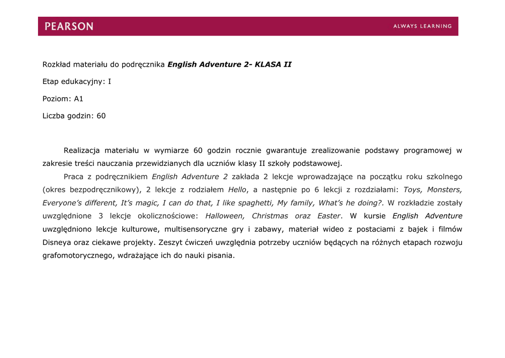 Rozkład materiału do podręcznika English Adventure 2- KLASA II Etap edukacyjny: I Poziom: A1 Liczba godzin: 60 Realizacja materiału w wymiarze 60 godzin rocznie gwarantuje zrealizowanie podstawy programowej w zakresie treści nauczania przewidzianych dla uczniów klasy II szkoły podstawowej. Praca z podręcznikiem English Adventure 2 zakłada 2 lekcje wprowadzające na początku roku szkolnego (okres bezpodręcznikowy), 2 lekcje z rodziałem Hello, a następnie po 6 lekcji z rozdziałami: Toys, Monsters, Everyone’s different, It’s magic, I can do that, I like spaghetti, My family, What’s he doing?. W rozkładzie zostały uwzględnione 3 lekcje okolicznościowe: Halloween, Christmas oraz Easter. W kursie English Adventure uwzględniono lekcje kulturowe, multisensoryczne gry i zabawy, materiał wideo z postaciami z bajek i filmów Disneya oraz ciekawe projekty. Zeszyt ćwiczeń uwzględnia potrzeby uczniów będących na różnych etapach rozwoju grafomotorycznego, wdrażające ich do nauki pisania. Lp. 1 Temat rozdziału Okres bezpodręcznikowy Temat lekcji Liczby 1-15, części ciała, kolory. Znajomość środków językowych Słownictwo Gramatyka/Fonetyka Liczby 1-15. Części ciała. Kolory. Polecenia. Zwroty: I'm happy. And you?, Number (four) is (happy/sad), I've got... Zgodność z Nową podstawą programową Umiejętności Punkt podstawy Materiał podręcznika i ćwiczeń Rozumienie wypowiedzi: Uczeń rozumie i rozróżnia liczby, polecenia, części ciała i kolory. SB: - 1, 2 WB: - Tworzenie wypowiedzi: Uczeń liczy do 15, nazywa części ciała i kolory. Uczeń pyta o samopoczucie. Uczeń opisuje części ciała. 2 3 Okres bezpodręcznikowy Hello! Zwierzęta, zabawki. Ćwiczenia językowe. Hello, goodbye. Formy powitań i pożegnań. Zwierzęta. Zabawki. Kształty. Formy powitań i pożegnań. Kolory. Pytania: What have you got?, How many?, What colour is it? What's this? What's number one? Zwroty: This is…, I've got... Pytania: What's your name?, Who is it? What colour is it?, zwroty: This is…, Point to…, Ask... Reagowanie na wypowiedzi: Uczeń reaguje na pytanie o samopoczucie, polecenia, nazwy kolorów, części ciała oraz kolory. Rozumienie wypowiedzi: Uczeń rozumie i rozróżnia nazwy zwierząt, zabawek i kształtów. TB: 28, 29 1, 2 WB: - Tworzenie wypowiedzi: Uczeń nazywa zwierzęta, zabawki i kształty. Uczeń opisuje zwierzęta i zabawki. Reagowanie na wypowiedzi: Uczeń reaguje na pytania dotyczące zwierząt, zabawek i kształtów. Rozumienie wypowiedzi: Uczeń rozumie i rozróżnia formy powitań, pożegnań i kolory. Uczeń rozumie teksty nagrań. Tworzenie wypowiedzi: Uczeń przedstawia się. Uczeń pyta o imię i wiek. SB: - TB: 30, 31 1, 2 SB: 1/2, 2/2, 3/3, 4/3 WB: 1/74, 2/74, 4/75 TB: 32, 33 4 5 Hello! Toys Przybory szkolne. Dni tygodnia. Story time. Słuchanie historyjki. Przybory szkolne. Dni tygodnia. Zabawki. Kolory. Liczba mnoga rzeczowników. Zaimek my, Pytania:: How many?, What is it?,What colour is…? Zwrot: It's (Thursday) Zwrot: It's…, Touch, Draw, Look. Pytanie: What's your favourite (day/colour)? Reagowanie na wypowiedzi: Uczeń reaguje na pytania dotyczące imienia, wieku i kolorów. Rozumienie wypowiedzi: Uczeń rozumie i rozróżnia przybory szkolne i dni tygodnia. Uczeń rozumie teksty nagrań. 1, 2 WB: 5/76, 6/76, 7/77 Tworzenie wypowiedzi: Uczeń nazywa przedmioty szkolne, wymienia dni tygodnia i liczy. Reagowanie na wypowiedzi: Uczeń reaguje na pytania dotyczące przedmiotów szkolnych, imienia, wieku, ulubionego koloru oraz dnia. Rozumienie wypowiedzi: Uczeń rozumie i rozróżnia zabawki. Uczeń rozumie tekst historyjki. TB: 34, 35 1, 2, 4 6 Toys My toys! Nauka piosenki. Zabawki. Zwrot: Point to… Pytania: Is it ...?, What's this? Tworzenie wypowiedzi: Uczeń nazywa zabawki. Uczeń śpiewa piosenkę. Reagowanie na wypowiedzi: Uczeń reaguje na polecenia SB: 1/6 WB: 1/78, 2/78 Tworzenie wypowiedzi: Uczeń nazywa zabawki i zadaje pytania z nimi związane. Uczeń czyta tekst historyjki. Reagowanie na wypowiedzi: Uczeń reaguje na pytania dotyczące zabawek. Rozumienie wypowiedzi: Uczeń rozumie i rozróżnia zabawki. Uczeń rozumie tekst piosenki. SB: 5/4, 6/4, 7/5, 8/5, 9/5 TB: 36 1, 2, 3 SB: 2/7, 3/7 WB: 3/79, 4/79 TB: 37 7 Toys Opisywanie zabawek. Zabawki. Przybory szkolne. Zwroty: No, it's…, It isn't…, Point to… Pytania: Is it…?, What is it? dotyczące zabawek. Rozumienie wypowiedzi: Uczeń rozumie i rozróżnia nazwy zabawek i przyborów szkolnych oraz ich opisy. Uczeń rozumie teksty nagrań. 1, 2 WB: 5/80, 6/80 TB: 38 Tworzenie wypowiedzi: Uczeń nazywa opisane wcześniej zabawki. 8 Toys Pytania o nazwę zabawki. Zabawki. Pytania: Is it…?, What is it? Reagowanie na wypowiedzi: Uczeń reaguje na pytania dotyczące zabawek. Rozumienie wypowiedzi: Uczeń rozumie pytania oraz opisy zabawek. Uczeń rozumie tekst nagrania. 1, 2 9 Toys Rozmowa o ulubionych zabawkach. Zabawki. Kolory. Zwrot: This is…, Pytania: Is it…?, What is it?, What's your favourite toy?. Zaimek „my” TB: 39 1, 2, 4 10 Toys Opisywanie zabawek. Zabawki. Kolory. Zwrot: It isn't…, My favourite toy is… Pytania: What is it?, Is it…? SB: 8/10, 9/10 WB: 9/82, 10/82 Tworzenie wypowiedzi: Uczeń zadaje pytania dotyczące nazw zabawek. Uczeń czyta tekst historyjki. Reagowanie na wypowiedzi: Uczeń reaguje na pytania dotyczące zabawek. Rozumienie wypowiedzi: Uczeń rozumie pytania dotyczące zabawek. Uczeń SB: 6/9, 7/9 WB: 7/81, 8/81 Tworzenie wypowiedzi: Uczeń tworzy pytania dotyczące zabawek. Uczeń nazywa zabawki, po ich opisaniu. Reagowanie na wypowiedzi: Uczeń reaguje na opisy i pytania dotyczące zabawek. Rozumienie wypowiedzi: Uczeń rozumie pytania dotyczące zabawek. Uczeń rozumie tekst historyjki. SB: 4/8, 5/8 TB: 40 1, 2 SB: 10/11, 11/11 rozumie tekst nagrania. WB: 11/83, 12/83 Tworzenie wypowiedzi: Uczeń opisuje zabawki. TB: 41 Reagowanie na wypowiedzi: Uczeń reaguje na pytania dotyczące zabawek. 11 Toys 12 Monster
