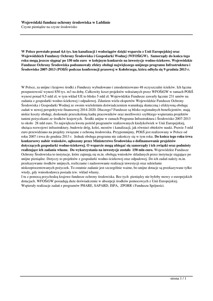 Wojewódzki fundusz ochrony środowiska w Lublinie Czyste pieniądze na czyste środowisko W Polsce powstało ponad 4,6 tys. km kanalizacji i wodociągów dzięki wsparciu z Unii Europejskiej oraz Wojewódzkich Funduszy Ochrony Środowiska i Gospodarki Wodnej (WFOŚiGW). Samorządy do końca tego roku mogą jeszcze sięgnąć po 150 mln euro w kolejnym konkursie na inwestycje wodno-ściekowe. Wojewódzkie Fundusze Ochrony Środowiska podsumowały efekty obsługi największego unijnego programu Infrastruktura i Środowisko 2007-2013 (POIiŚ) podczas konferencji prasowej w Kołobrzegu, która odbyła się 9 grudnia 2013 r. W Polsce, za unijne i krajowe środki z Funduszy wybudowano i zmodernizowano 48 oczyszczalni ścieków. Ich łączna przepustowość wynosi 850 tys. m3 na dobę. Całkowity koszt projektów wdrażanych przez WFOŚiGW w ramach POIiŚ wynosi ponad 9,5 mld zł, w tym wkład UE to blisko 5 mld zł. Wojewódzkie Fundusze zawarły łącznie 231 umów na zadania z gospodarki wodno-ściekowej i odpadowej. Zdaniem wielu ekspertów Wojewódzkie Fundusze Ochrony Środowiska i Gospodarki Wodnej ze swoim wieloletnim doświadczeniem warunkują skuteczną i efektywną obsługę zadań w nowej perspektywie finansowej 2014-2020. Dlaczego? Fundusze są blisko regionalnych beneficjentów, mają niskie koszty obsługi, doskonale przeszkoloną kadrę pracowników oraz możliwości szybkiego wspierania projektów tanimi pożyczkami ze środków krajowych. Środki unijne w ramach Programu Infrastruktura i Środowisko 2007-2013 to około 28 mld euro. To największa kwota pośród programów realizowanych kiedykolwiek w Unii Europejskiej, służąca rozwojowi infrastruktury, budowie dróg, kolei, mostów i kanalizacji, jak również obiektów nauki. Prawie 5 mld euro przewidziano na projekty związane z ochroną środowiska. Przypomnijmy, POIiŚ jest realizowany w Polsce od roku 2007 i trwa do grudnia 2013 r. Jednak obsługa programu nie zakończy się w tym roku. Do końca tego roku trwa konkursowy nabór wniosków, ogłoszony przez Ministerstwo Środowiska o dofinansowanie projektów dotyczących gospodarki wodno-ściekowej. O wsparcie mogą ubiegać się samorządy i ich związki oraz podmioty realizujące ich zadania własne. Do wykorzystania na inwestycje zostało 150 mln euro. Wojewódzkie Fundusze Ochrony Środowiska to instytucje, które zajmują się m.in. obsługą wniosków składanych przez instytucje sięgające po unijne pieniądze. Dotyczy to projektów z gospodarki wodno-ściekowej oraz odpadowej. Do ich zadań należy m.in. przekazywanie środków unijnych, rozliczanie i nadzorowanie realizacji inwestycji oraz udzielanie niskooprocentowanych pożyczek. To ostatnie zadanie jest szczególnie ważne, bo unijne dotacje są przekazywane tylko wtedy, gdy wnioskodawca posiada tzw. wkład własny. I tu z pomocą przychodzą krajowe fundusze ochrony środowiska. Bez tych pieniędzy nie byłoby mowy o europejskich dotacjach. WFOŚiGW posiadają duże doświadczenie w absorpcji środków pomocowych z Unii Europejskiej. Wspierały realizacje zadań z programów PHARE, SAPARD, ISPA, ZPORR i Funduszu Spójności. strona 1 / 1