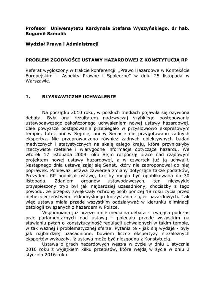 Profesor Uniwersytetu Kardynała Stefana Wyszyńskiego, dr hab. Bogumił Szmulik Wydział Prawa i Administracji PROBLEM ZGODNOŚCI USTAWY HAZARDOWEJ Z KONSTYTUCJĄ RP Referat wygłoszony w trakcie konferencji „Prawo Hazardowe w Kontekście Europejskim – Aspekty Prawne i Społeczne” w dniu 25 listopada w Warszawie. 1. BŁYSKAWICZNE UCHWALENIE Na początku 2010 roku, w polskich mediach pojawiła się oŜywiona debata. Była ona rezultatem nadzwyczaj szybkiego postępowania ustawodawczego zakończonego uchwaleniem nowej ustawy hazardowej. Całe powyŜsze postępowanie przebiegało w przysłowiowo ekspresowym tempie, toteŜ ani w Sejmie, ani w Senacie nie przygotowano Ŝadnych ekspertyz. Nie przeprowadzono równieŜ Ŝadnych obiektywnych badań medycznych i statystycznych na skalę całego kraju, które przyniosłyby rzeczywiste rzetelne i wiarygodne informacje dotyczące hazardu. We wtorek 17 listopada 2009 roku Sejm rozpoczął prace nad rządowym projektem nowej ustawy hazardowej, a w czwartek juŜ ją uchwalił. Następnego dnia ustawą zajął się Senat, który nie zaproponował do niej poprawek. PoniewaŜ ustawa zawierała zmiany dotyczące takŜe podatków, Prezydent RP podpisał ustawę, tak by mogła być opublikowana do 30 listopada. Zdaniem organów ustawodawczych, ten niezwykle przyspieszony tryb był jak najbardziej uzasadniony, chociaŜby z tego powodu, Ŝe przepisy zwiększały ochronę osób poniŜej 18 roku Ŝycia przed niebezpieczeństwem lekkomyślnego korzystania z gier hazardowych. Tak więc ustawa miała przede wszystkim oddziaływać w kierunku eliminacji patologii związanych z hazardem w Polsce. Wspomniana juŜ przeze mnie medialna debata - trwająca podczas prac parlamentarnych nad ustawą - polegała przede wszystkim na stawianiu pytań o konstytucyjność regulacji uchwalonych w takim tempie, w tak waŜnej i problematycznej sferze. Pytania te - jak się wydaje - były jak najbardziej uzasadnione, bowiem liczne ekspertyzy niezaleŜnych ekspertów wykazały, iŜ ustawa moŜe być niezgodna z Konstytucją. Ustawa o grach hazardowych weszła w Ŝycie w dniu 1 stycznia 2010 roku z wyjątkiem kilku przepisów, które wejdą w Ŝycie w dniu 2 stycznia 2016 roku. 2. HAZARD BEZ WYGRANEJ? Problem jawi się juŜ na samym początku ustawy, bowiem art. 2 ustawy zawiera zbiór dość wątpliwych definicji legalnych. Tak więc, zgodnie z definicją, grami na automatach są gry na urządzeniach mechanicznych, elektromechanicznych lub elektronicznych, w tym komputerowych, o wygrane pienięŜne lub rzeczowe, w których gra zawiera element losowości. Za wygraną rzeczową w grach na automatach uznaje się wygrane polegające na moŜliwości przedłuŜenia gry bez konieczności wpłaty stawki za udział w grze, a takŜe moŜliwość rozpoczęcia nowej gry poprzez wykorzystanie wygranej w poprzedniej grze. Ustawodawca w tym przypadku zakwalifikował efekt w postaci przedłuŜenia gry jako swoistą korzyść majątkową, którą moŜe uzyskać gracz w skutek rozpoczęcia gry na automacie. Powoduje to konieczność uznania np. popularnych symulatorów samochodowych, flipperów albo innych gier zręcznościowych, takich jak np. pump it up (urządzenie do trafiania stopami w podświetlane kwadraty w rytm muzyki, uzaleŜnionego od zręczności i szybkości) za podlegające ustawie, a to juŜ wydaje się być daleką nadinterpretacją. Działalność w zakresie gier na automatach moŜe być prowadzona tylko na podstawie udzielonej koncesji na prowadzenie kasyna gry. Konsekwentnie zatem, prowadzenie gier na automatach, na których gracz moŜe tylko uzyskać bezpłatne przedłuŜenie lub nową grę bez konieczności zapłaty stawki i w których nie gra się o Ŝadne inne wygrane powinno odbywać się na podstawie uzyskanej uprzednio koncesji i wyłącznie w kasynach. Koncesja jest przejawem reglamentacji działalności gospodarczej dokonywanej przez państwo. Jest ona formą najbardziej restrykcyjnego oddziaływania na przedsiębiorców i wolny rynek. Wprowadza się ją w przypadku działalności, które mają szczególne znaczenie ze względu na bezpieczeństwo państwa lub obywateli albo teŜ ze względu na inny waŜny interes publiczny. Ponadto reglamentacja działalności gospodarczej moŜe mieć na celu zapewnienie ochrony innych niŜ państwo podmiotów uczestniczących w obrocie gospodarczym, w szczególności konsumentów. Konstytucja RP stanowi, Ŝe ograniczenie wolności działalności gospodarczej jest dopuszczalne tylko w drodze ustawy i tylko ze względu na waŜny interes publiczny. Ustawodawca za pomocą ustawy o grach hazardowych wprowadził bardzo powaŜne ograniczenie w zakresie wolności wykonywania działalności gospodarczej. Na podstawie przyjętego rozwiązania, prowadzenie salonu gier na automatach bez wygranych pienięŜnych i rzeczowych z moŜliwością przedłuŜenia gry lub rozpoczęcia nowej za udział w grze, moŜe odbywać się wyłącznie w formie kasyna i na podstawie koncesji. Zgodnie z postanowieniami Konstytucji taka reglamentacja jest dopuszczalna w sytuacji spełnienia dwóch przesłanek: przesłanki formalnej - (tu) ograniczenie wolności działalności gospodarczej dopuszczalne jest tylko w drodze ustawy; oraz przesłanki materialnej (tu) ograniczenie wolności działalności gospodarczej dopuszczalne jest tylko ze względu na waŜny interes publiczny. W przypadku ustawy o grach hazardowych spełniona została jedynie przesłanka formalna. Normy ograniczające swobodę działalności gospodarczej wynikają z przepisów o randze ustawy. W przedmiotowej sprawie nie sposób dopatrzeć się "waŜnego interesu publicznego", który uzasadniłby ograniczenie wolności działalności gospodarczej. Nie sposób dopatrzeć się waŜkich korzyści, jakie zostaną uzyskane przez społeczeństwo. Podczas prac legislacyjnych nad ustawą nie wskazano interesu publicznego, który byłby urzeczywistniany przez ten przepis. Gra na automatach, która nie ma na celu 