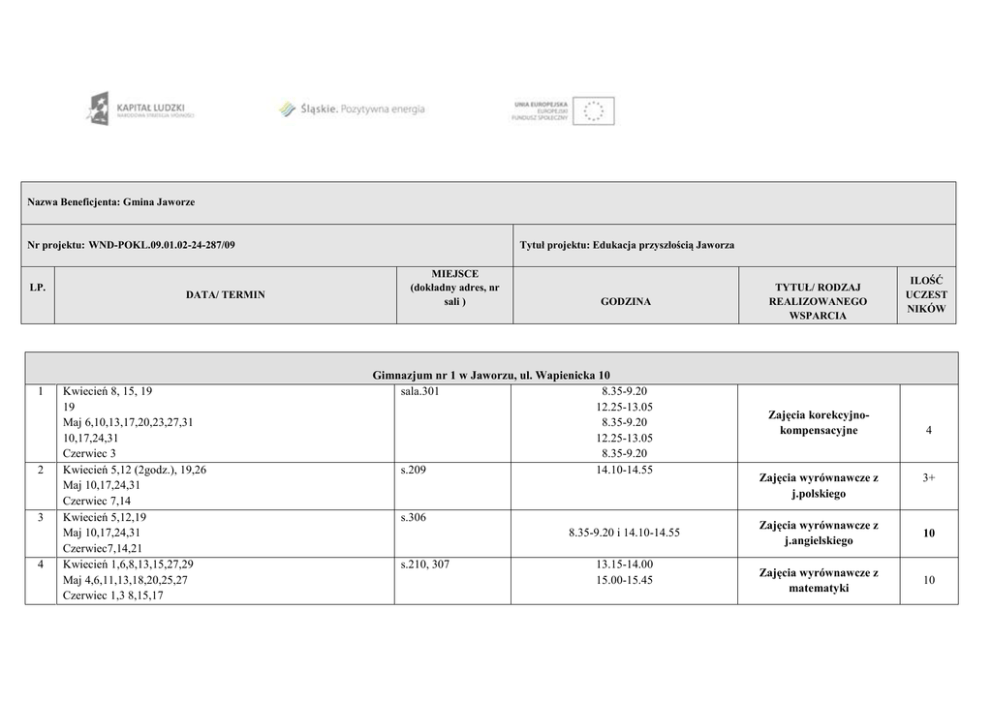 Nazwa Beneficjenta: Gmina Jaworze Tytuł projektu: Edukacja przyszłością Jaworza Nr projektu: WND-POKL.09.01.02-24-287/09 LP. 1 2 3 4 DATA/ TERMIN Kwiecień 8, 15, 19 19 Maj 6,10,13,17,20,23,27,31 10,17,24,31 Czerwiec 3 Kwiecień 5,12 (2godz.), 19,26 Maj 10,17,24,31 Czerwiec 7,14 Kwiecień 5,12,19 Maj 10,17,24,31 Czerwiec7,14,21 Kwiecień 1,6,8,13,15,27,29 Maj 4,6,11,13,18,20,25,27 Czerwiec 1,3 8,15,17 MIEJSCE (dokładny adres, nr sali ) GODZINA TYTUŁ/ RODZAJ REALIZOWANEGO WSPARCIA Gimnazjum nr 1 w Jaworzu, ul. Wapienicka 10 sala.301 8.35-9.20 12.25-13.05 8.35-9.20 12.25-13.05 8.35-9.20 s.209 14.10-14.55 Zajęcia korekcyjnokompensacyjne s.306 8.35-9.20 i 14.10-14.55 s.210, 307 13.15-14.00 15.00-15.45 Zajęcia wyrównawcze z j.polskiego ILOŚĆ UCZEST NIKÓW 4 3+ Zajęcia wyrównawcze z j.angielskiego 10 Zajęcia wyrównawcze z matematyki 10 5 6 7 8 9. 10. 11. 12. 13 14. Kwiecień 1,15 Maj 6,20 Czerwiec 3,7 Kwiecień biologia 12,19 Maj biologia 16,23 Czerwiec chemia 11 Kwiecień 5,11,18,27 Maj 4,9,16,23,30 Czerwiec 6,13,20 Kwiecień 4,13,20,27 Maj 4,11,18,25 Czerwiec 1,8,15 Kwiecień 5,30 19,26 Maj 10,17 24 czerwiec Kwiecień 11,18,22,29 Maj 9,16,23,30 Czerwiec 6,13,17,20 Kwiecień 13,20,27 Maj 4,11,18,25 Czerwiec 1,8,15 Kwiecień Maj czerwiec Kwiecień 1,8,29 14 Maj 6,20,27 12 Czerwiec 3,10,17 16 Kwiecień 7,28 s.305 chemia 16,30 chemia 28 s.212 12.25-14.05 Zajęcia wyrównawcze z informatyki 4 14.05-14.55 / 9.00-14.00 14.05-14.55 / 9.00-14.00 9.00-14.00 Zajęcia wyrównawcze z biologii i chemii 30 14.10-15.45 Zajęcia wyrównawcze z geografii 7 14.05-15.35 Zajęcia wyrównawcze z j.niemieckiego 13 Dam radę 30 koło wokalno-instrumentalne 18 koło plastyczne 10 Kurs szybkiego czytania ze zrozumieniem 15 Koło filmowe 8 Koło dziennikarskie 8 s.209 s.209 Kamesznica s.102,114 12.30-20.00 16.30-17.00 15.00-18.00 s.208 s.208 15.00-16.30 15.00-15.45 SP1 s.305/308 kinoplex Bielsko-B. s.305/308 kinoplex Bielsko-B. s.305/308 kinoplex Bielsko-B. s.305/308 7.40-9.20 12.30 – 17.00 7.40-9.20 12.30 – 17.00 7.40-9.20 12.30 – 17.00 14.10-14.55 15. 14. 15. 16. 17. 19. 14 Maj 5,17,19,24,26,31 12 Czerwiec 2,7,9 16 Kwiecień 4, 7(2godz.),11,10(2godz.),16(6godz.),18(2godz.) Maj 5(2godz.),8(2godz.),9,16,19(2godz.),23,30 Czerwiec 2(2godz.),3(4godz.),6,8(2godz.),13 Kwiecień 7,27 4,18 14,28 Maj 5,15,19 9,16 Czerwiec 2,18 6,13 Kwiecień 1,4,6,8,15,29 Maj 2 (7godz.),6,9,11,16,18,23,25,30 Czerwiec 13 Kwiecień 28 (Wajda-Parzyk) 1,8,11,15,18,19,29(Wróbel) 20,27(Bozek) Maj 12,26(Wajda-Parzyk) 6,9,10,13, 16,17,20,23,24,27,30,31(Wróbel) 4,11,18,25(Bozek) Czerwiec 9(Wajda-Parzyk) 3,6,7,10,13,14,17,20,21(Wróbel) 1,8,15(Bozek) Kwiecień 4,11,14,19 Maj 9,10,16,17,23,24,31 Czerwiec 6,7,13 Kwiecień 7,14 Wajda-Parzyk 5,20 Spodzieja ,27 kinoplex Bielsko-B s.305/308 kinoplex Bielsko-B s.305/308 kinoplex Bielsko-B s.304 Sala gimn. basen w Skoczowie hala sport.Jasienica hala sport.Jasienica basen w Skoczowie hala sport.Jasienica basen w Skoczowie sala gimnast./boisko szkolne s.308 s.305 s.305 s.305 s.306 s.212,307 12.30 – 17.00 14.10-14.55 12.30 – 17.00 14.10-14.55 12.30 – 17.00 14.05-14.55 (pon.) / 13.20-14.05 (czw.) Koło „Moja mała ojczyzna” 13 Zajęcia rekreacyjnosportowe 40 koło łucznicze 10 13.20-14.55 7.40-8.25/7.40-9.20/14.10-14.55 7.40-8.25 13.20-14.55 7.40-8.25/7.40-9.20/14.10-14.55 7.40-8.25 13.20-14.55 7.40-8.25/7.40-9.20/14.10-14.55 7.40-8.25 Koło informatyczne 10 14.10-15.45 Kurs j.angielskiego 15 13.20-14.05 15.00-16.30 15.00-15.45 Zajęcia matematycznoprzyrodnicze 10 14.55-16.25 14.45-17.00 15.30-18.30 15.30-18.30 14.45-17.00 15.30-18.30 14.45-17.00 16.00-17.30 20. 21. 22. Maj 5,19 Wajda-Parzyk 4,11,18,25 Spodzieja Czerwiec 2,16 Wajda-Parzyk 1,8,15 Spodzieja Kwiecień 7,21,28 11,18 Maj 5,12,19,26 9,16,23,30 Czerwiec 2,9,16 6,20 Kwiecień Maj 14 czerwiec Maj 27,28 s.308/306 Kopalnia Guido w Rudzie Śląskiej Rytro 13.20-14.05 15.00-15.45 13.20-14.05 15.00-15.45 12.25-14.55 8.35-9.20 12.25-14.55 8.35-9.20 12.25-14.55 8.35-9.20 Doradztwo zawodowe 63 9.00-14.00 Chemia inaczej 23 8.00-18.00 Warsztaty ekologiczne 40