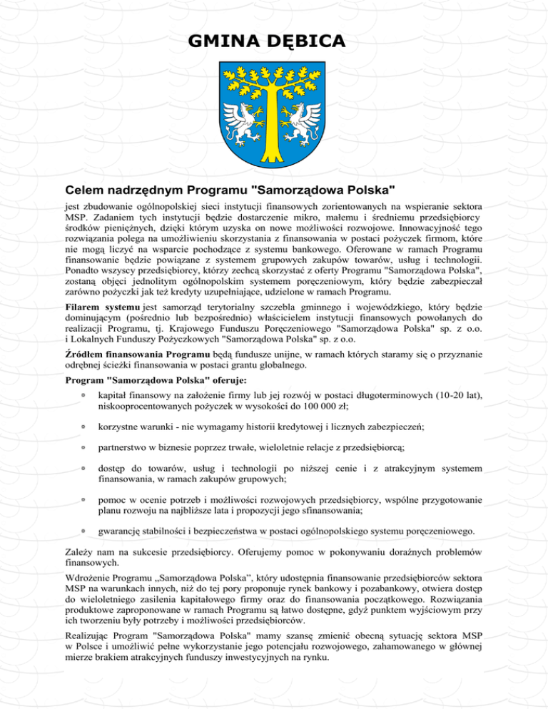GMINA DĘBICA Celem nadrzędnym Programu "Samorządowa Polska" jest zbudowanie ogólnopolskiej sieci instytucji finansowych zorientowanych na wspieranie sektora MSP. Zadaniem tych instytucji będzie dostarczenie mikro, małemu i średniemu przedsiębiorcy środków pieniężnych, dzięki którym uzyska on nowe możliwości rozwojowe. Innowacyjność tego rozwiązania polega na umożliwieniu skorzystania z finansowania w postaci pożyczek firmom, które nie mogą liczyć na wsparcie pochodzące z systemu bankowego. Oferowane w ramach Programu finansowanie będzie powiązane z systemem grupowych zakupów towarów, usług i technologii. Ponadto wszyscy przedsiębiorcy, którzy zechcą skorzystać z oferty Programu "Samorządowa Polska", zostaną objęci jednolitym ogólnopolskim systemem poręczeniowym, który będzie zabezpieczał zarówno pożyczki jak też kredyty uzupełniające, udzielone w ramach Programu. Filarem systemu jest samorząd terytorialny szczebla gminnego i wojewódzkiego, który będzie dominującym (pośrednio lub bezpośrednio) właścicielem instytucji finansowych powołanych do realizacji Programu, tj. Krajowego Funduszu Poręczeniowego "Samorządowa Polska" sp. z o.o. i Lokalnych Funduszy Pożyczkowych "Samorządowa Polska" sp. z o.o. Źródłem finansowania Programu będą fundusze unijne, w ramach których staramy się o przyznanie odrębnej ścieżki finansowania w postaci grantu globalnego. Program "Samorządowa Polska" oferuje: kapitał finansowy na założenie firmy lub jej rozwój w postaci długoterminowych (10-20 lat), niskooprocentowanych pożyczek w wysokości do 100 000 zł; korzystne warunki - nie wymagamy historii kredytowej i licznych zabezpieczeń; partnerstwo w biznesie poprzez trwałe, wieloletnie relacje z przedsiębiorcą; dostęp do towarów, usług i technologii po niższej cenie i z atrakcyjnym systemem finansowania, w ramach zakupów grupowych; pomoc w ocenie potrzeb i możliwości rozwojowych przedsiębiorcy, wspólne przygotowanie planu rozwoju na najbliższe lata i propozycji jego sfinansowania; gwarancję stabilności i bezpieczeństwa w postaci ogólnopolskiego systemu poręczeniowego. Zależy nam na sukcesie przedsiębiorcy. Oferujemy pomoc w pokonywaniu doraźnych problemów finansowych. Wdrożenie Programu „Samorządowa Polska”, który udostępnia finansowanie przedsiębiorców sektora MSP na warunkach innych, niż do tej pory proponuje rynek bankowy i pozabankowy, otwiera dostęp do wieloletniego zasilenia kapitałowego firmy oraz do finansowania początkowego. Rozwiązania produktowe zaproponowane w ramach Programu są łatwo dostępne, gdyż punktem wyjściowym przy ich tworzeniu były potrzeby i możliwości przedsiębiorców. Realizując Program "Samorządowa Polska" mamy szansę zmienić obecną sytuację sektora MSP w Polsce i umożliwić pełne wykorzystanie jego potencjału rozwojowego, zahamowanego w głównej mierze brakiem atrakcyjnych funduszy inwestycyjnych na rynku. Spójny system zarządzania i kontroli W odróżnieniu od zasad funkcjonowania aktualnie działających funduszy pożyczkowych w Polsce, Program „Samorządowa Polska” posiada sieciowy i ogólnopolski charakter. Zgodnie z założeniami w zainteresowanych gminach na terenie Polski powstają lokalne fundusze pożyczkowe, które prowadzą działalność na podstawie jednolitych zasad i procedur, są objęte wspólnym mechanizmem poręczeniowym oraz jednolitym ogólnopolskim systemem zarządzania i kontroli. Nadzór nad nimi sprawuje Krajowy Fundusz Poręczeniowy „Samorządowa Polska”, który jednocześnie pełni funkcję organu poręczającego dla całego systemu. Mocne strony Programu "Samorządowa Polska" POWSZECHNOŚĆ – obecność na terenie całej Polski. DOSTĘPNOŚĆ - przyjazna dla przedsiębiorcy procedura weryfikacyjna ułatwiająca dostęp do pieniądza, korzystne warunki finansowania dostosowane do możliwości MSP, atrakcyjne formy zabezpieczeń. TRANSPARENTNOŚĆ - klarowne, zrozumiałe i przejrzyste zasady udzielania pożyczek. Efektywnej realizacji Programu "Samorządowa Polska" sprzyja także: znajomość procesów gospodarczych, zarówno w Polsce jak i w Unii Europejskiej; wiedza ekspercka na każdym poziomie realizacji Programu; szerokie wsparcie i pomoc ze strony samorządu gospodarczego i organizacji pracodawców. Potencjał Programu "Samorządowa Polska" Elitarne grono znamienitych osobistości, ekspertów w dziedzinie ekonomii, w tym finansów, bankowości oraz praktycznego biznesu, jak również administracji rządowej i samorządowej, funduszy unijnych itp. Zaplecze instytucjonalne, tworzone przez wiele podmiotów - partnerów Programu, odpowiedzialnych za społeczno-gospodarczy rozwój kraju. Filarem przedsięwzięcia jest gminny samorząd terytorialny. Mechanizm finansowania oparty o fundusze europejskie, który przy aktywności instytucji samorządowych pozwoli na wsparcie ok. 490 tys. mikro, małych i średnich przedsiębiorców w okresie 2014-2020.