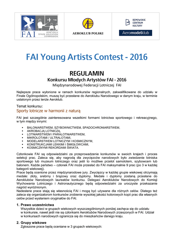 AEROKLUB POLSKI FAI Young Artists Contest - 2016 REGULAMIN Konkursu Młodych Artystów FAI - 2016 Międzynarodowej Federacji Lotniczej FAI Najlepsze prace wyłonione w ramach konkursów regionalnych, zakwalifikowane do udziału w Finale Ogólnopolskim, muszą być przesłane do Aeroklubu Narodowego w danym kraju, w terminie ustalonym przez tenże Aeroklub. Temat konkursu: Sporty lotnicze w harmonii z naturą FAI jest szczególnie zainteresowana wszelkimi formami lotnictwa sportowego i rekreacyjnego, w tym między innymi: BALONIARSTWEM, SZYBOWNICTWEM, SPADOCHRONIARSTWEM, AKROBACJĄ LOTNICZĄ, LOTNIARSTWEM I PARALOTNIARSTWEM, MIKROLOTAMI / ULTRALOTAMI, MODELARSTWEM LOTNICZYM I KOSMICZNYM, KONSTRUKCJAMI LEKKIMI I ŚMIGŁOWCAMI, KOSMICZNYMI REKORDAMI ŚWIATA. Członkowie FAI są odpowiedzialni za przeprowadzenie konkursów w swoich krajach i proces selekcji prac. Zaleca się, aby nagrodą dla zwycięzców narodowych było zwiedzenie lotniska sportowego lub muzeum lotniczego oraz jeśli to możliwe przelot samolotem, szybowcem lub balonem. Każde państwo – członek FAI może przesłać do FAI maksymalnie 9 prac (po 3 w każdej kategorii wiekowej). Prace będą ocenione przez międzynarodowe jury. Zwycięzcy w każdej grupie wiekowej otrzymają medale: złoty, srebrny i brązowy oraz dyplomy. Medale i dyplomy zostaną przesłane do Aeroklubów Narodowych laureatów konkursu. Delegaci Aeroklubów Narodowych do Komisji Wychowania Lotniczego i Astronautycznego będą odpowiedzialni za uroczyste przekazanie nagród wyróżnionym. Nadesłane prace stają się własnością FAI i mogą być używane dla różnych celów. Dlatego też zaleca się organizatorom konkursów zrobienie wysokiej jakości kolorowych kopii prac dla własnych celów przed wysłaniem oryginałów do FAI. 1. Prawo uczestnictwa Wszystkie dzieci w grupach wiekowych wyszczególnionych poniżej zachęca się do udziału w konkursie, nawet jeśli nie są członkami Aeroklubów Narodowych zrzeszonych w FAI. Udział w konkursach narodowych ogranicza się do mieszkańców danego kraju. 2. Grupy wiekowe Zgłoszone prace będą oceniane w 3 grupach wiekowych: Grupa I. - kategoria młodzików (urodzeni między 1.01.2006 a 31.12.2009), Grupa II. - kategoria juniorów młodszych (urodzeni między 1.01.2002 a 31.12.2005), Grupa III. - kategoria juniorów (urodzeni między 1.01.1998 a 31.12.2001). 3. Format Wymagany jest format A3 (297 x 420 mm lub 11,75 x 16,5 cali) lub, jeżeli wyżej wymieniony format jest nieosiągalny w Waszym kraju, format najbardziej zbliżony do podanego. Praca nie może być oprawiona w ramę lub otoczona marginesem (krawędziami, brzegiem, obwódką, lamówką). 4. Wykonanie Cała praca musi być wykonana ręcznie (lub w przypadku osób niepełnosprawnych - stopą lub ustami). Pracę można wykonać: farbami wodnymi, farbami akrylowymi, farbami olejnymi, ołówkami nieścieralnymi, flamastrami lub markerami, piórami kulkowymi, tuszem lub trwałym atramentem, pastelami, kredkami lub innymi podobnymi, trwałymi technikami plastycznymi. Praca nie może być wykonana: ołówkiem, węglem do rysowania lub innym nietrwałym środkiem przy użyciu technik komputerowych nie może być to "kolaż" z wykorzystaniem zdjęć i fotokopii 5. Oznakowanie Należy wypełnić I cz. „Certyfikatu”, wpisując dane uczestnika. Formularz certyfikatu załączony jest do Pisma Organizacyjnego Aeroklubu Polskiego. 6. Oświadczenie autentyczności Należy wypełnić i podpisać II cz. „Certyfikatu”, tzw. poświadczenie autentyczności. Poświadczenie musi być podpisane (imię, nazwisko, podpis) przez nauczyciela, rodzica lub opiekuna, albo inną właściwą osobę. PRAWIDŁOWO WYPEŁNIONY I PODPISANY CERTYFIKAT należy trwale przykleić na odwrocie pracy plastycznej 7. Adres nadsyłania prac Prace mają być nadsyłane do organizatora konkursu w danym kraju, a nie bezpośrednio do FAI. Prace będą oceniane przez Międzynarodowe Jury pod warunkiem, że zostaną przesłane przez członków FAI na adres biura FAI w Lozannie, w wyznaczonym terminie. Interpretacja tematu na rok 2016 SPORTY LOTNICZE W HARMONII Z NATURĄ Piękno ziemi w całej swej okazałości zobaczyć można jedynie z wysokości. Każdego dnia tysiące może doświadczać takich widoków patrząc na ziemię z pokładów pasażerskich samolotów. Jednak są również osoby, dziewczęta i chłopcy oraz kobiety i mężczyźni, które zajmują się różnymi dyscyplinami sportu lotniczego. Oni mają tą możliwość podziwiać piękne widoki z zupełnie innej perspektywy, czy to z kabiny szybowca, czy też z gondoli balonu. Jeszcze inni pasjonaci przestrzeni skaczą ze spadochronem czując pęd powietrza aby potem wylądować pośrodku malowniczego pola. Niektórzy przemieszczają się po niebie na pokładzie samolotów ultralekkich lub śmigłowców. Z góry pełnia przyrody jest widoczna w sposób nieosiągalny z powierzchni Ziemi. Śmigłowce dają możliwość oglądania niedostępnych rzek i kanionów, a balony unoszą się nad domami miast. Takie spojrzenie z innej perspektywy daje możliwość obserwacji wzajemnego współistnienia ziemi, wody, zwierząt i ludzi – wszystkich elementów, które wchodzą w skład naszej planety. Z powietrza, jesteśmy w stanie robić niesamowite zdjęcia i filmy, które nigdy nie oddały by w taki sposób piękna Ziemi gdyby były wykonywane z poziomu lądu. Samolotom i śmigłowcom do pokonywania przestrzeni nie są potrzebne żadne drogi. Pilotowi wystarczy jedynie lotnisko lub otwarte pole aby wznieść się w powietrze na swej maszynie. Korzystając z tej wolności, lotnicy muszą jednak pamiętać aby być w harmonii z otaczającą ich nieograniczoną przyrodą, być przyjacielem zwierząt i środowiska naturalnego, być dobrym sąsiadem dla wszystkich ludzi. Szczególnie należy to mieć na uwadze podczas startów i lądowań. Entuzjaści sportu lotniczego są szczęśliwi z tego co robią, ponieważ piękno ziemi jest jedn