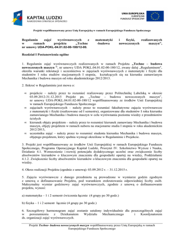 Projekt współfinansowany przez Unię Europejską w ramach Europejskiego Funduszu Społecznego Regulamin zajęć wyrównawczych z w ramach projektu „Techne nr umowy UDA-POKL-04.01.02-00-180/12-00. matematyki -budowa i fizyki, realizowanych nowoczesnych maszyn”, Rozdział I Postanowienia ogólne 1. Regulamin zajęć wyrównawczych realizowanych w ramach Projektu „Techne – budowa nowoczesnych maszyn ”, nr umowy UDA POKL.04.01.02-00-180/12, zwany dalej „Regulaminem", określa warunki rekrutacji i uczestnictwa w zajęciach wyrównawczych z matematyki i fizyki dla studentów I roku studiów stacjonarnych I stopnia, kształcących się na kierunku zamawianym Mechanika i budowa maszyn od roku akademickiego 2012/2013. 2. Ilekroć w Regulaminie jest mowa o: • • • • projekcie – naleŜy przez to rozumieć realizowany przez Politechnikę Lubelską w okresie 03.09.2012-31.12.2015 Projekt pn. „Techne - budowa nowoczesnych maszyn”, nr umowy UDA-POKL.04.01.02-00-180/12 współfinansowany ze środków Unii Europejskiej w ramach Europejskiego Funduszu Społecznego zajęciach wyrównawczych – naleŜy przez to rozumieć fakultatywne zajęcia wyrównawcze z matematyki i fizyki (realizowane od I semestru), organizowane dla studentów I roku kierunku zamawianego Mechanika i budowa maszyn w celu wyrównania poziomu wiedzy z przedmiotów ścisłych kierunek objęty projektem – naleŜy przez to rozumieć kierunek zamawiany Mechanika i budowa maszyn, objęty projektem w ramach naboru na stacjonarne studia I stopnia w roku akademickim 2012/2013, uczestniku zajęć – naleŜy przez to rozumieć studenta kierunku Mechanika i budowa maszyn, objętego projektem, który spełnia wymogi określone w Regulaminie i Projekcie. 3. Projekt jest współfinansowany ze środków Unii Europejskiej w ramach Europejskiego Funduszu Społecznego, Programu Operacyjnego Kapitał Ludzki, Priorytet IV. Szkolnictwo WyŜsze i Nauka, Działanie 4.1. Wzmocnienie i rozwój potencjału dydaktycznego uczelni oraz zwiększenie liczby absolwentów kierunków o kluczowym znaczeniu dla gospodarki opartej na wiedzy, Poddziałanie 4.1.2. Zwiększenie liczby absolwentów kierunków o kluczowym znaczeniu dla gospodarki opartej na wiedzy. 4. Okres realizacji Projektu (zgodnie z umową): 03.09.2012 r. – 31.12.2015 r. 5. Zajęcia wyrównawcze z danego przedmiotu są prowadzone w wymiarze godzin zgodnym z umową o dofinansowanie Projektu, pod warunkiem zrekrutowania odpowiedniej liczby osób. Maksymalny wymiar godzinowy zajęć wyrównawczych, zgodnie z umową o dofinansowanie projektu, wynosi: a) matematyka – 1 i 2 semestr ćwiczenia łącznie (4 grupy po 30 godz.) b) fizyka – 1 i 2 semestr łącznie (4 grupy po 30 godz.) 6. Szczegółowy harmonogram zajęć zostanie ustalony indywidualnie dla poszczególnych zajęć w porozumieniu z Dziekanatem Wydziału Mechanicznego i Koordynatorem ds. organizacji zajęć wyrównawczych. Projekt Techne- budowa nowoczesnych maszyn współfinansowany przez Unię Europejską w ramach Europejskiego Funduszu Społecznego Projekt współfinansowany przez Unię Europejską w ramach Europejskiego Funduszu Społecznego 7. Liczba grup ćwiczeniowych jest uzaleŜniona od zrekrutowanej liczby osób. Grupa powinna wynosić min. 30osób. Rozdział II Uczestnicy zajęć Uczestnikami zajęć wyrównawczych mogą być studenci I roku studiów, podejmujący studia stacjonarne I stopnia na kierunku zamawianym Mechanika i budowa Maszyn w roku akademickim 2012/2013, w ramach projektu „Techne- budowa nowoczesnych maszyn”. Rozdział III Zasady rekrutacji 1. Do celów rekrutacji powołuje się Komisję Rekrutacyjną, która dokonuje kwalifikacji na zajęcia wyrównawcze. W skład Komisji wchodzą: Kierownik projektu, Asystent Kierownika projektu, Koordynator ds. organizacji zajęć wyrównawczych. 2. Prace Komisji Rekrutacyjnej są udokumentowane protokołem i kończą się sporządzeniem oraz podpisaniem listy osób zakwalifikowanych. 3. O terminie rekrutacji i przyjmowania zgłoszeń oraz o wynikach rekrutacji informuje studentów Koordynator ds. organizacji zajęć wyrównawczych w ramach kierunku, zamieszczając informację na tablicy Dziekanatu oraz na stronie internetowej projektu. 4. Liczba uczestników zajęć wyrównawczych jest określona w umowie o dofinansowanie Projektu i moŜe być zwiększona decyzją komisji rekrutacyjnej, w przypadku duŜego zainteresowania studentów danym typem zajęć, wynikającym z ilości złoŜonych wniosków, o ile jest moŜliwe zapewnienie odpowiednich warunków ich realizacji. 5. Podstawą kwalifikacji studentów do udziału w zajęciach wyrównawczych z matematyki i fizyki jest zgłoszenie chęci uczestnictwa u Koordynatora ds. organizacji zajęć wyrównawczych w ramach kierunku Mechanika i budowa Maszyn, poprzez wypełnienie Wniosku o udział w zajęciach wyrównawczych – stanowiącego Załącznik nr 1 do Regulaminu, a następnie przystąpienie do testu kompetencji, określającego poziom wiedzy studenta w zakresie przedmiotów ścisłych tj. matematyki i fizyki. 6. Test kompetencji jest przeprowadzany przez nauczycieli akademickich na początku roku akademickiego, wśród osób, które zgłosiły chęć uczestnictwa poprzez wypełnienie wniosku o udział w zajęciach wyrównawczych. 7. Na zajęcia wyrównawcze będą kwalifikowane osoby, które na teście kompetencji z danego przedmiotu osiągnęły wynik mniejszy, bądź równy 50% maksymalnej liczby punktów do zdobycia. Rozdział IV Realizacja zajęć wyrównawczych 1. Udział w zajęciach wyrównawczych jest bezpłatny. 2. Warunkiem uczestnictwa w zajęciach wyrównawczych jest wypełnienie i podpisanie przez studenta: 1) kwestionariusza uczestnika projektu – zawierającego zgodę na przetwarzanie danych osobowych 2) deklaracji uczestnictwa w Projekcie Projekt Techne- budowa nowoczesnych maszyn współfinansowany przez Unię Europejską w ramach Europejskiego Funduszu Społecznego Projekt współ