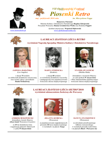 VII Ogólnopolski Festiwal Piosenki Retro maj - październik 2010 roku im. Mieczysława Fogga Honorowy Patronat: Minister Kultury i Dziedzictwa Narodowego Bogdan Zdrojewski Prezydent Warszawy Hanna Gronkiewicz-Waltz oraz Rodzina Foggów dyrektor artystyczny: Wojciech Dąbrowski www.spotkaniazpiosenka.org www.festiwalretro.pl LAUREACI ZŁOTEGO LIŚCIA RETRO wyróżnieni Nagrodą Specjalną Ministra Kultury i Dziedzictwa Narodowego JADWIGA BARAŃSKA (Los Angeles) MARTA STEBNICKA (Kraków) STANISŁAW JANICKI (Bielsko Biała) z okazji 75 urodzin za całokształt działalności artystycznej oraz recital i płytę z piosenkami Hanki Ordonówny z okazji 85 urodzin za wieloletnią działalność reżyserską i pedagogiczną oraz popularyzowanie twórczości okresu międzywojennego dziennikarz i recenzent filmowy za cykl spotkań W starym kinie i filmy dokumentalne popularyzujące twórczość okresu międzywojennego LAUREACI ZŁOTEGO LIŚCIA RETRO’2010 wyróżnieni odznaczeniem Zasłużony dla Warszawy ANDRZEJ BUKOWIECKI dziennikarz, krytyk filmowy (Dom Sztuki Warszawa-Ursynów) za 25-lat działalności kina i organizację pokazów filmowych z cyklu W Starym Kinie JOLANTA KUBICKA (Warszawa) DANUTA STANKIEWICZ (Warszawa) za popularyzowanie najpiękniejszych piosenek 20-lecia międzywojennego w recitalach i na płycie Tango za utrwalanie przedwojennego folkloru warszawskiego w recitalach piosenki żydowskiej i na płytach Blask i Warszawo ma HONOROWE WYRÓŻNIENIA ZŁOTE LIŚCIE RETRO’2010 WYRÓŻNIENIA INDYWIDUALNE GRAŻYNA BRODZIŃSKA (Warszawa) EWA DAŁKOWSKA (Warszawa) ARTUR HOFMAN (Teatr Żydowski, Warszawa) za cykl koncertów za recital za scenariusz i reżyserię spektaklu Nie zapomnisz mnie Piosenki Hanki Ordonówny ze szlagierami filmowymi lat 30. Obrachunek z Bogiem popularyzującego twórczość Władysława Szlengla KASIA MACIEJCZYK (Ośrodek Kultury, Piaseczno) EWA MAKOMASKA (Teatr Polski, Warszawa) za programy kabaretowe za recital piosenek retro Anatomia rozrywki Powróćmy jak za dawnych lat Kabaret 20-lecia w humorze i piosence (najlepszy debiut 2010 roku) za programy muzyczne poświęcone Eugeniuszowi Bodo i Andrzejowi Włastowi JUDYTA PARADZIŃSKA (Teatr EKO Studio, Opole) BARBARA RYBAŁTOWSKA (Warszawa) za spektakl z piosenkami Hanki Ordonówny za program muzyczny wg własnego scenariusza Takie małe nic Próba u Poli Negri MIROSŁAW KOWALCZYK (Warszawa) MARLENA WOJTOWICZ aranżacje i akompaniament: Dominik Kwaśniewski (Loch Camelot, Kraków) za recital Piosenki Wiery Gran HONOROWE WYRÓŻNIENIA ZŁOTE LIŚCIE RETRO’2010 za najciekawsze wydarzenia artystyczne w sezonie 2009/2010 AGATA PILITOWSKA i MARIA NOWOTARSKA (Teatr Polski Toronto) MARTA BAUM (Lublin) za spektakl z zespołem muzycznym: Emilia Zamiejska (skrzypce), Michał Iwanek (piano) za projekt muzyczny Lata 20. lata 30. Opowieści Poli Negri scenariusz i reżyseria: Kazimierz Braun TEATR ŻYDOWSKI im. ESTERY RACHEL i IDY KAMIŃSKIEJ (Warszawa) AGENCJA ARTYSTYCZNA STAGE PRODUCTION (Warszawa) za widowiska muzyczne oparte na przedwojennych tekstach mistrzów kabaretu Tuwima, Hemara, Jurandota Ada Gostkowska, Ewa Kuklińska Anita Steciuk, Maciej Damięcki, Maciej Wilk Retro Band Tomasza Bielskiego za widowisko muzyczne Żyć nie umierać i Pół żartem, pół serio Piosenki w starym kinie reżyseria: Szymon Szurmiej reżyseria: Andrzej Rozhin WROCŁAWSKI TEATR PIOSENKI TEATR WILLIAM-ES (Zamek Książ, Wałbrzych) Bogusław Klimsa Anna Bajer, Jolanta Chełmicka, Jan Węglowski Tomasz Kwietko-Bębnowski, Krzysztof Tysnarzewski za spektakle Tylko we Lwowie i Szlagiery szampańskiej ery Robert Delegiewicz, Danuta Gołdon, Stella Wesołowska za program sceny muzycznej z piosenkami lat 20. i 30. Kabaretro ANITA CHLEBIK i MARIUSZ KWIATKOWSKI (Lublin) akompaniament: Anna Bielecka za Wieczory Retro w kawiarni Czarna Inez z cyklu Lata 20., lata 30. HONOROWE WYRÓŻNIENIA ZŁOTE LIŚCIE RETRO’2010 za wydawnictwa książkowe Łódź JERZY S. MAJEWSKI RYSZARD MĄCZEWSKI za cykl książek i artykułów wspomnieniowych za album Warszawa nieodbudowana Warszawa między wojnami publikowanych na łamach Gazety Stołecznej (Wydawnictwo Veda, Warszawa) opowieść o życiu stolicy 1918-1939 (Dom Wydawniczy Księży Młyn, Łódź) Warszawa WITOLD SADOWY WYDAWNICTWO RM aktor, dziennikarz i kronikarz teatru, z okazji 90 urodzin za cykl artykułów i książek poświęconych artystom teatru za serię wydawnictw albumowych z cyklu Najpiękniejsze fotografie Czas, który minął, Teatr, plotki, aktorzy Za kulisami i na scenie Ludzie teatru – mijają lata, zostają wspomnienia Przedwojenna Ochota (autor: Joanna Rolińska) Przedwojenny Żoliborz (autor: Tomasz Pawłowski) Przedwojenne Kresy (Marta Dobrowolska-Kierył) (Oficyna Wydawnicza Rytm, Warszawa) Warszawa AGATA TUSZYŃSKA RYSZARD WOLAŃSKI za książkę biograficzną za opowieść o Henryku Warsie Oskarżona Wiera Gran Już nie zapomnisz mnie i film dokumentalny TVP Bo wszystko w nim grało HONOROWE WYRÓŻNIENIA ZŁOTE LIŚCIE RETRO’2010 za wydawnictwa fonograficzne i audiowizualne TOMASZ GOMOŁA, STUDIO ANIMACJI NEWBORN (Warszawa) za realizację filmu animowanego 3D odtwarzającego wygląd i atmosferę dawnej Warszawy Warszawa 1935 MICHAŁ BAUER (MoreBauer) AGENCJA ARTYSTYCZNA MTJ/EUROMUZYKA (Warszawa) TADEUSZ STOLARSKI wytwórnia fonograficzna Teddy Records Końskie-Dyszów (woj. świętokrzyskie) za płyty z archiwalnymi nagraniami za remastering i upowszechnianie archiwalnych nagrań piosenek 20-lecia międzywojennego Hanki Ordonówny i Eugeniusza Bodo (dodatek do Gazety Wyborczej) HONOROWE WYRÓŻNIENIA ZŁOTE LIŚCIE RETRO’2010 za działalność organizatorską i popularyzatorską KAPELA PODWÓRKOWA Z TARGÓWKA Chłopaki ze starej paki Paweł Pasztaleniec (banjo, klarnet, kier. zespołu), Darek Pasztaleniec i Wiesław Leśniewski (akordeony) Agnieszka Wojakowska (skrzypce) Ryszard Chomicki (gitara) Waldemar Wolski (kontrabas) z okazji 15-lecia istnienia zespołu za utrwal