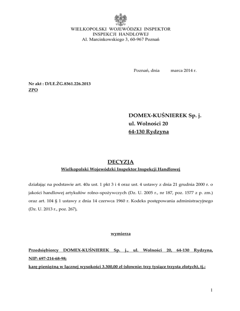 WIELKOPOLSKI WOJEWÓDZKI INSPEKTOR INSPEKCJI HANDLOWEJ Al. Marcinkowskiego 3, 60-967 Poznań Poznań, dnia marca 2014 r. Nr akt : D/LE.ŻG.8361.226.2013 ZPO DOMEX-KUŚNIEREK Sp. j. ul. Wolności 20 64-130 Rydzyna DECYZJA Wielkopolski Wojewódzki Inspektor Inspekcji Handlowej działając na podstawie art. 40a ust. 1 pkt 3 i 4 oraz ust. 4 ustawy z dnia 21 grudnia 2000 r. o jakości handlowej artykułów rolno–spożywczych (Dz. U. 2005 r., nr 187, poz. 1577 z p. zm.) oraz art. 104 § 1 ustawy z dnia 14 czerwca 1960 r. Kodeks postępowania administracyjnego (Dz. U. 2013 r., poz. 267), wymierza Przedsiębiorcy DOMEX-KUŚNIEREK Sp. j., ul. Wolności 20, 64-130 Rydzyna, NIP: 697-214-68-98; karę pieniężną w łącznej wysokości 3.300,00 zł (słownie: trzy tysiące trzysta złotych), tj.: 1 karę pieniężną w wysokości 1.800,00 zł (słownie: jeden tysiąc osiemset złotych), wynikającą z art. 40a ust. 1 pkt 3 ustawy z dnia 21 grudnia 2000 r. o jakości handlowej artykułów rolno-spożywczych (Dz. U. 2005 r., nr 187, poz. 1577 z p. zm.), tj. niewłaściwe oznakowanie artykułów rolno-spożywczych; karę pieniężną w wysokości 1.500 zł (słownie: jeden tysiąc pięćset złotych) wynikającą z art. 40a ust. 1 pkt 4 ustawy z dnia 21 grudnia 2000 r. o jakości handlowej artykułów rolno-spożywczych (Dz. U. 2005 r., nr 187, poz. 1577 z p. zm.), tj. zafałszowanie artykułów rolno-spożywczych; z tytułu wprowadzenia do obrotu handlowego w dniu kontroli, tj. w dniu 15 listopada 2013 r. w markecie DINO w Osiecznie, ul. Śmigielska 1b, 64-113 Osieczna, przedsiębiorca: DOMEX-KUŚNIEREK Sp. j., ul. Wolności 20, 64-130 Rydzyna, artykułów rolnospożywczych nieodpowiadających jakości handlowej określonej w przepisach o jakości handlowej oraz artykułów rolno-spożywczych zafałszowanych to jest: partia 20 op. a 10 szt. „10 świeżych jaj klasa A, w rozmiarze M z chowu klatkowego”, w cenie 3,85 zł/op., producent: P.P.H.U. KABAD, Dąbrowa Rusiecka 135, 97-438 Rusiec, wartości: 77,00 zł; z uwagi na: obecność w przeważonej partii 9% (18 szt.) jaj granicznej klasy wagowej niższej, co stanowi naruszenie art. 27 ust. 1 i 2 rozporządzenia Komisji (WE) nr 589/2008 z dnia 23 czerwca 2008 r. ustanawiającego szczegółowe zasady wykonywania rozporządzenia Rady (WE) nr 1234/2007 w sprawie norm handlowych w odniesieniu do jaj. Powyższe wprowadzało konsumentów w błąd co do masy netto nabywanego środka spożywczego, a tym samym w istotny sposób naruszało interesy konsumentów i uniemożliwiało dokonanie właściwego wyboru. ponadto 2 zastosowanie szaty graficznej w formie krajobrazu wiejskiego (zielona łąka, domek z zagrodą, kura i jaja), która sugeruje, iż oferowane jaja pochodzą od kur z chowu na wolnym wybiegu, co stanowi naruszenie art. 16 rozporządzenia Parlamentu i Rady (WE) nr 178/2002 z dnia 28 czerwca 2002 r. ustanawiającego ogólne zasady i wymagania prawa żywnościowego, powołującego Europejski Urząd ds. Bezpieczeństwa Żywności oraz ustanawiającego procedury w zakresie bezpieczeństwa żywności (Dz. Urz. L 31 z 1.02.2002 r. z p. zm.). Użyta szata graficzna wprowadzała konsumentów w błąd, co do pochodzenia środka spożywczego sugerując, iż artykuł został pozyskany w sposób bardziej tradycyjny. partia 12 op. a 30 szt. „świeżych jaj 30 szt. klasa A, w rozmiarze M z chowu klatkowego”, w cenie 11,49 zł/op., producent: j. w., wartości 137,88 zł; z uwagi na: brak oznaczenia kodu producenta na zewnętrznej lub wewnętrznej powierzchni opakowania, co stanowi naruszenie art. 12 rozporządzenia Komisji (WE) nr 589/2008 z dnia 23 czerwca 2008 r. ustanawiającego szczegółowe zasady wykonywania rozporządzenia Rady (WE) nr 1234/2007 w sprawie norm handlowych w odniesieniu do jaj (Dz. Urz. UE L 163 z 24.06.2008 r.). Powyższe wprowadzało konsumentów, co do pochodzenia jaj- metody ich pozyskiwania, kraju pochodzenia producenta oraz uniemożliwiało konsumentowi potwierdzenie nadzoru weterynaryjnego nad określoną fermą kur nieśnych. partia 27 op. a 10 szt. „10 świeżych jaj klasa A, w rozmiarze M z chowu klatkowego”, w cenie 3,85 zł/op., producent: Przedsiębiorstwo Wielobranżowe GALLUS Sp. z o.o., ul. Wybickiego 10, Manieczki, 63-112 Brodnica, wartości 103,95 zł; z uwagi na: podanie nieprawidłowego zakresu wagowego obok deklarowanej klasy wagowej „M- średnie”, tj. podano zakres „53 g > masa > 63 g” zamiast zakresu „63 g > masa ≥ 53 g”, co stanowi naruszenie art. 4 rozporządzenia Komisji (WE) nr 589/2008 z dnia 23 czerwca 2008 r. ustanawiającego szczegółowe zasady wykonywania rozporządzenia Rady (WE) nr 1234/2007 w sprawie norm handlowych w odniesieniu do jaj (Dz. Urz. UE L 163 z 24.06.2008 r.). Powyższe wprowadzało konsumentów w błąd, co do masy netto nabywanego środka spożywczego, a tym samym uniemożliwiało dokonanie właściwego wyboru. 3 partia 18 op. a 10 szt. „10 świeżych jaj klasa A, w rozmiarze M z chowu klatkowego”, w cenie 3,85 zł/op., producent: j. w., wartości 69,30 zł; z uwagi na: podanie nieprawidłowego zakresu wagowego obok deklarowanej klasy wagowej „M- średnie”, tj. podano zakres „53 g > masa > 63 g” zamiast zakresu „63 g > masa ≥ 53 g”, co stanowi naruszenie art. 4 rozporządzenia Komisji (WE) nr 589/2008 z dnia 23 czerwca 2008 r. ustanawiającego szczegółowe zasady wykonywania rozporządzenia Rady (WE) nr 1234/2007 w sprawie norm handlowych w odniesieniu do jaj (Dz. Urz. UE L 163 z 24.06.2008 r.). Powyższe wprowadzało konsumentów w błąd, co do masy netto nabywanego środka spożywczego, a tym samym uniemożliwiało dokonanie właściwego wyboru. ponadto brak na opakowaniu daty minimalnej trwałości, co stanowi naruszenie § 2 ust. 1 pkt 3 rozporządzenia Ministra Rolnictwa i Rozwoju Wsi z dnia 10 lipca 2007 r. w sprawie znakowania środków spożywczych (Dz. U. nr 137, poz. 966 z p. zm.). Powyższa nieprawidłowość uniemożliwiała konsument