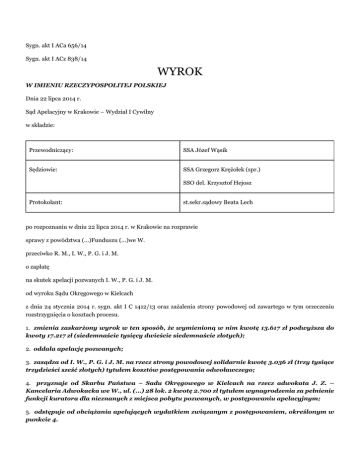 Sygn. akt I ACa 656/14 Sygn. akt I ACz 838/14 WYROK W IMIENIU RZECZYPOSPOLITEJ POLSKIEJ Dnia 22 lipca 2014 r. Sąd Apelacyjny w Krakowie – Wydział I Cywilny w składzie: Przewodniczący: SSA Józef Wąsik Sędziowie: SSA Grzegorz Krężołek (spr.) SSO del. Krzysztof Hejosz Protokolant: st.sekr.sądowy Beata Lech po rozpoznaniu w dniu 22 lipca 2014 r. w Krakowie na rozprawie sprawy z powództwa (...)Funduszu (...)we W. przeciwko R. M., I. W., P. G. i J. M. o zapłatę na skutek apelacji pozwanych I. W., P. G. i J. M. od wyroku Sądu Okręgowego w Kielcach z dnia 24 stycznia 2014 r. sygn. akt I C 1412/13 oraz zażalenia strony powodowej od zawartego w tym orzeczeniu rozstrzygnięcia o kosztach procesu. 1. zmienia zaskarżony wyrok w ten sposób, że wymienioną w nim kwotę 13.617 zł podwyższa do kwoty 17.217 zł (siedemnaście tysięcy dwieście siedemnaście złotych); 2. oddala apelację pozwanych; 3. zasądza od I. W., P. G. i J. M. na rzecz strony powodowej solidarnie kwotę 3.036 zł (trzy tysiące trzydzieści sześć złotych) tytułem kosztów postępowania odwoławczego; 4. przyznaje od Skarbu Państwa – Sadu Okręgowego w Kielcach na rzecz adwokata J. Z. – Kancelaria Adwokacka we W., ul. (...) 28 lok. 2 kwotę 2.700 zł tytułem wynagrodzenia za pełnienie funkcji kuratora dla nieznanych z miejsca pobytu pozwanych, w postępowaniu apelacyjnym; 5. odstępuje od obciążania apelujących wydatkiem związanym z postępowaniem, określonym w punkcie 4. Sygn. akt I ACa 656/14 I ACz 838/ 14 UZASADNIENIE Wyrokiem z dnia 24 stycznia 2014r Sąd Okręgowy w Kielcach , uwzględniając żądanie (...)Funduszu (...)we W. , zasądził na jego rzecz od pozwanych R. M. , I. W., P. G. i J. M. , solidnie kwotę 200 000 złotych z ustawowymi odsetkami od dnia 10 maja 2010r do dnia zapłaty , a ponadto obciążył pozwanych sumą 13 617 złotych tytułem zwrotu kosztów procesu. Rozstrzygnięcie to poprzedziło ustalenie następujących okoliczności faktycznych : W dniu 14 stycznia 2005r R. M. i jej mąż S. zawarli z bankiem (...) SA umowę pożyczki hipotecznej na sumę 113 290 franków szwajcarskich , którą mogli przeznaczyć na dowolny cel , a której jednym z zabezpieczeń spłaty, były hipoteki zwykła i łączna kaucyjną ,na rzecz pożyczkodawcy , wpisane na pozycjach pierwszej i drugiej na nieruchomości , położonej w S. przy ul. (...) , zabudowanej budynkiem mieszkalnym , objętej księgą wieczystą nr (...). Termin spłaty świadczenia umownego został określony na 1 stycznia 2020 r. W dniu 21 lutego 2006 n małżonkowie zaciągnęli w tym samym Banku kolejna pożyczkę hipoteczną na kwotę 120 000 złotych , który to kapitał mogli także przeznaczyć na wybrany przez siebie cel. Podobnie jak poprzednio spłatę zobowiązania zabezpieczały m. in. , ustanowione na rzecz banku , hipoteki zwykła i kaucyjna , w pozycjach pierwszej i drugiej , na nieruchomości objętej księgą wieczystą KW (...)/ (...). Termin końcowy , w którym mieli zwrócic w całości pożyczone pieniądze został określony na 1 lutego 2021r Z uwagi na nie dokonywanie w terminach umownych spłat zaciągniętych zobowiązań bank wypowiedział obydwie umowy i nie spłacone dotąd zadłużenie stało się wymagalne. S. M. (1) zmarł 10 listopada 2007r , a Sąd Rejonowy w Kazimierzy Wielkiej stwierdził , że spadek po nim nabyli w częściach równych żona oraz dzieci - pozwani - w częściach równych , każdy po ¼ części. Na podstawie umowy cesji zawartej w dniu 22 września 2011r pomiędzy bankiem (...) SA i stroną powodową Fundusz (...)nabył wierzytelności wynikające z obu umów pożyczek hipotecznych , dotąd przysługujące cesjonariuszowi wobec R. M. i dzieci zmarłego drugiego z pożyczkobiorców . Wyciągi z ksiąg rachunkowych Funduszu wystawione perze stronę powodową określały wysokość tych wierzytelności , na datę ich przygotowania i wynosiły one odpowiednio : z umowy z dnia 14 stycznia 2005r na sumę należności głównej – 233, 939, 76 złotego i odsetek 165 635, 95 złotego oraz wynikająca z umowy z 21 lutego 2006r z tytułu należności głównej 116 493,68 złotego i odsetek – 92 227, 74 złotego. Rozważania prawne rozpoczął Sąd I instancji od oceny samej umowy cesji wierzytelności zawartej w dniu 22 września 2011r pomiędzy bankiem , a stroną powodową, wobec podważania jej ważności przez pozwanych , których , poza R. M. , reprezentował w sporze kurator procesowy ustanowiony dla osób nieznanych miejsca pobytu. Sąd Okręgowy uznał ją za ważną zwracając w szczególności uwagę i odpierając jako niezasadny zarzut pozwanych , iż na jej zawarcie dłużnicy nie musieli wyrażać zgody. Wskazał , że taka zgoda nie była potrzebna jako że w czasie jej zawierania nie obowiązywał już art. 92 c ustawy Prawo bankowe , który jej , po stronie zobowiązanych z przelewnej wierzytelności wymagał. Został on uchylony przed jej zawarciem , bo z dniem 13 stycznia 2009r. Następnie , odnosząc się do kolejnego zarzutu pozwanych, a to braku w wystawionych przez Fundusz i zahaczonych do pozwu wyciągach z jego ksiąg rachunkowych, mających obejmować wierzytelności , których są dłużnikami , tych wszystkich elementów ,których wymaga tego rodzaju dokument po myśli art. 194 ustawy z dnia 27 maja 1994r O funduszach inwestycyjnych oraz ustawy o rachunkowości uznał , że także i ten zarzut jest chybiony jako że dokumenty te wymaganiom tym , stawianym wyciągowi odpowiadają. W szczególności wskazują na obydwie wierzytelności , potwierdzają fakt ich nie spłacenia wobec banku oraz to , że wierzyciel przelał ją na rzecz Funduszu w oparciu o umowę oraz jaki zakres miał dokonany w ten sposób przelew. Zwrócił Sąd także uwagę , że poza samymi wyciągami powodowy Fundusz przedłożył także dokumenty z których wynika źródło tych wierzytelności oraz samą umowę przelewu. Treść tych dokumentów nie była przy tym przedmio