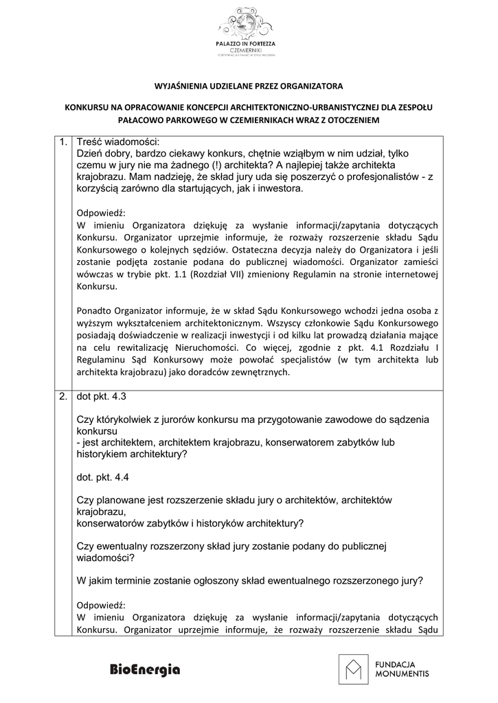 WYJAŚNIENIA UDZIELANE PRZEZ ORGANIZATORA KONKURSU NA OPRACOWANIE KONCEPCJI ARCHITEKTONICZNO-URBANISTYCZNEJ DLA ZESPOŁU PAŁACOWO PARKOWEGO W CZEMIERNIKACH WRAZ Z OTOCZENIEM 1. Treść wiadomości: Dzień dobry, bardzo ciekawy konkurs, chętnie wziąłbym w nim udział, tylko czemu w jury nie ma żadnego (!) architekta? A najlepiej także architekta krajobrazu. Mam nadzieję, że skład jury uda się poszerzyć o profesjonalistów - z korzyścią zarówno dla startujących, jak i inwestora. Odpowiedź: W imieniu Organizatora dziękuję za wysłanie informacji/zapytania dotyczących Konkursu. Organizator uprzejmie informuje, że rozważy rozszerzenie składu Sądu Konkursowego o kolejnych sędziów. Ostateczna decyzja należy do Organizatora i jeśli zostanie podjęta zostanie podana do publicznej wiadomości. Organizator zamieści wówczas w trybie pkt. 1.1 (Rozdział VII) zmieniony Regulamin na stronie internetowej Konkursu. Ponadto Organizator informuje, że w skład Sądu Konkursowego wchodzi jedna osoba z wyższym wykształceniem architektonicznym. Wszyscy członkowie Sądu Konkursowego posiadają doświadczenie w realizacji inwestycji i od kilku lat prowadzą działania mające na celu rewitalizację Nieruchomości. Co więcej, zgodnie z pkt. 4.1 Rozdziału I Regulaminu Sąd Konkursowy może powołać specjalistów (w tym architekta lub architekta krajobrazu) jako doradców zewnętrznych. 2. dot pkt. 4.3 Czy którykolwiek z jurorów konkursu ma przygotowanie zawodowe do sądzenia konkursu - jest architektem, architektem krajobrazu, konserwatorem zabytków lub historykiem architektury? dot. pkt. 4.4 Czy planowane jest rozszerzenie składu jury o architektów, architektów krajobrazu, konserwatorów zabytków i historyków architektury? Czy ewentualny rozszerzony skład jury zostanie podany do publicznej wiadomości? W jakim terminie zostanie ogłoszony skład ewentualnego rozszerzonego jury? Odpowiedź: W imieniu Organizatora dziękuję za wysłanie informacji/zapytania dotyczących Konkursu. Organizator uprzejmie informuje, że rozważy rozszerzenie składu Sądu Konkursowego o kolejnych sędziów. Ostateczna decyzja należy do Organizatora i jeśli zostanie podjęta zostanie podana do publicznej wiadomości. Organizator zamieści wówczas w trybie pkt. 1.1 (Rozdział VII) zmieniony Regulamin na stronie internetowej Konkursu. Ponadto Organizator informuje, że w skład Sądu Konkursowego wchodzi jedna osoba z wyższym wykształceniem architektonicznym. Wszyscy członkowie Sądu Konkursowego posiadają doświadczenie w realizacji inwestycji i od kilku lat prowadzą działania mające na celu rewitalizację Nieruchomości. Co więcej, zgodnie z pkt. 4.1 Rozdziału I Regulaminu Sąd Konkursowy może powołać specjalistów (w tym architekta lub architekta krajobrazu) jako doradców zewnętrznych. 3. Witam Pana Ciekawy konkurs ale dlaczego sąd jest pozbawiony profesjonalistów? Architektów , historyków sztuki, konserwatorów? Moze warto rozbudować skład Sądu? W imieniu Organizatora dziękuję za wysłanie informacji/zapytania dotyczących Konkursu. Organizator uprzejmie informuje, że rozważy rozszerzenie składu Sądu Konkursowego o kolejnych sędziów. Ostateczna decyzja należy do Organizatora i jeśli zostanie podjęta zostanie podana do publicznej wiadomości. Organizator zamieści wówczas w trybie pkt. 1.1 (Rozdział VII) zmieniony Regulamin na stronie internetowej Konkursu. Ponadto Organizator informuje, że w skład Sądu Konkursowego wchodzi jedna osoba z wyższym wykształceniem architektonicznym. Wszyscy członkowie Sądu Konkursowego posiadają doświadczenie w realizacji inwestycji i od kilku lat prowadzą działania mające na celu rewitalizację Nieruchomości. Co więcej, zgodnie z pkt. 4.1 Rozdziału I Regulaminu Sąd Konkursowy może powołać specjalistów (w tym architekta lub architekta krajobrazu) jako doradców zewnętrznych.