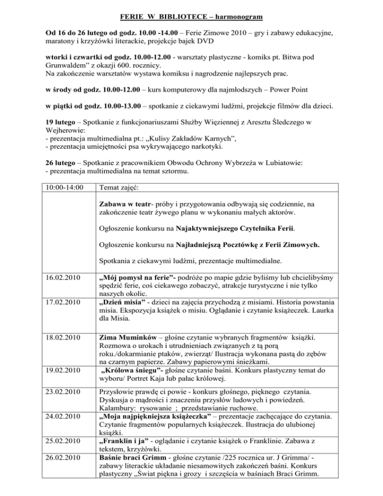 FERIE W BIBLIOTECE – harmonogram Od 16 do 26 lutego od godz. 10.00 -14.00 – Ferie Zimowe 2010 – gry i zabawy edukacyjne, maratony i krzyŜówki literackie, projekcje bajek DVD wtorki i czwartki od godz. 10.00-12.00 - warsztaty plastyczne - komiks pt. Bitwa pod Grunwaldem” z okazji 600. rocznicy. Na zakończenie warsztatów wystawa komiksu i nagrodzenie najlepszych prac. w środy od godz. 10.00-12.00 – kurs komputerowy dla najmłodszych – Power Point w piątki od godz. 10.00-13.00 – spotkanie z ciekawymi ludźmi, projekcje filmów dla dzieci. 19 lutego – Spotkanie z funkcjonariuszami SłuŜby Więziennej z Aresztu Śledczego w Wejherowie: - prezentacja multimedialna pt.: „Kulisy Zakładów Karnych”, - prezentacja umiejętności psa wykrywającego narkotyki. 26 lutego – Spotkanie z pracownikiem Obwodu Ochrony WybrzeŜa w Lubiatowie: - prezentacja multimedialna na temat sztormu. 10:00-14:00 Temat zajęć: Zabawa w teatr- próby i przygotowania odbywają się codziennie, na zakończenie teatr Ŝywego planu w wykonaniu małych aktorów. Ogłoszenie konkursu na Najaktywniejszego Czytelnika Ferii. Ogłoszenie konkursu na Najładniejszą Pocztówkę z Ferii Zimowych. Spotkania z ciekawymi ludźmi, prezentacje multimedialne. 16.02.2010 17.02.2010 18.02.2010 19.02.2010 23.02.2010 24.02.2010 25.02.2010 26.02.2010 „Mój pomysł na ferie”- podróŜe po mapie gdzie byliśmy lub chcielibyśmy spędzić ferie, coś ciekawego zobaczyć, atrakcje turystyczne i nie tylko naszych okolic. „Dzień misia” - dzieci na zajęcia przychodzą z misiami. Historia powstania misia. Ekspozycja ksiąŜek o misiu. Oglądanie i czytanie ksiąŜeczek. Laurka dla Misia. Zima Muminków – głośne czytanie wybranych fragmentów ksiąŜki. Rozmowa o urokach i utrudnieniach związanych z tą porą roku./dokarmianie ptaków, zwierząt/ Ilustracja wykonana pastą do zębów na czarnym papierze. Zabawy papierowymi śnieŜkami. „Królowa śniegu”- głośne czytanie baśni. Konkurs plastyczny temat do wyboru/ Portret Kaja lub pałac królowej. Przysłowie prawdę ci powie - konkurs głośnego, pięknego czytania. Dyskusja o mądrości i znaczeniu przysłów ludowych i powiedzeń. Kalambury: rysowanie ; przedstawianie ruchowe. „Moja najpiękniejsza ksiąŜeczka” – prezentacje zachęcające do czytania. Czytanie fragmentów popularnych ksiąŜeczek. Ilustracja do ulubionej ksiąŜki. „Franklin i ja” - oglądanie i czytanie ksiąŜek o Franklinie. Zabawa z tekstem, krzyŜówki. Baśnie braci Grimm - głośne czytanie /225 rocznica ur. J Grimma/ zabawy literackie układanie niesamowitych zakończeń baśni. Konkurs plastyczny „Świat piękna i grozy i szczęścia w baśniach Braci Grimm.