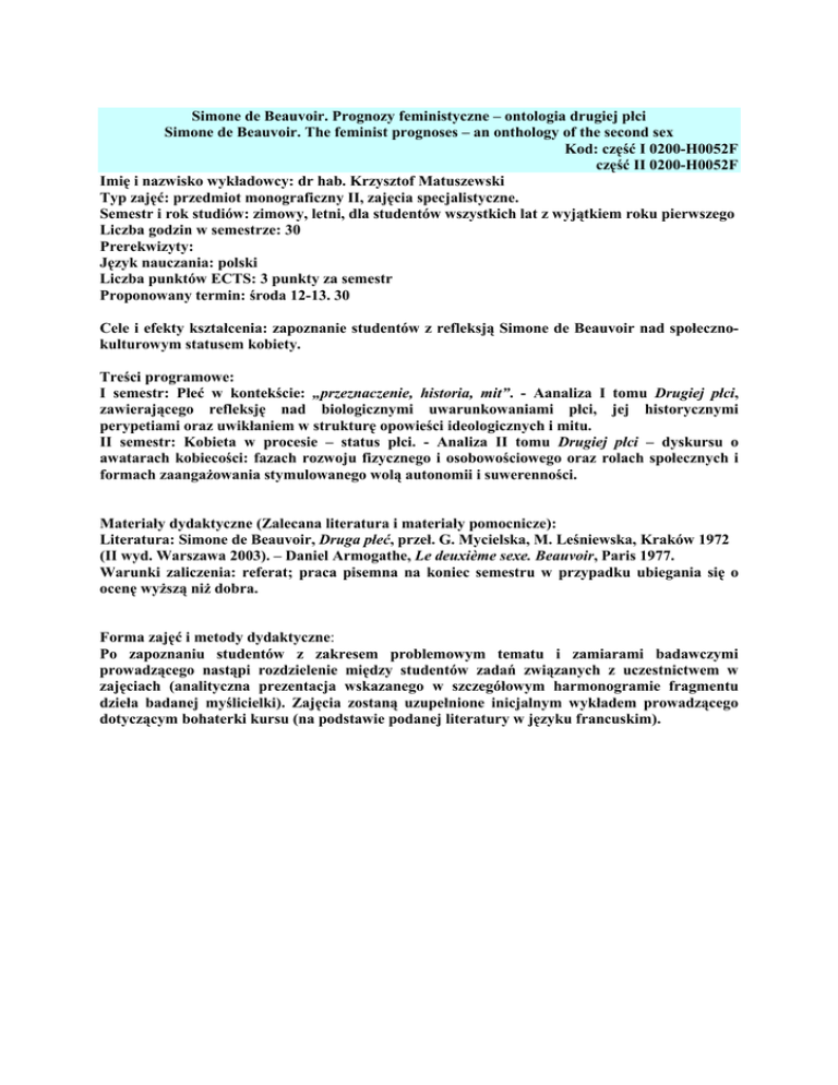 Simone de Beauvoir. Prognozy feministyczne – ontologia drugiej płci Simone de Beauvoir. The feminist prognoses – an onthology of the second sex Kod: część I 0200-H0052F część II 0200-H0052F Imię i nazwisko wykładowcy: dr hab. Krzysztof Matuszewski Typ zajęć: przedmiot monograficzny II, zajęcia specjalistyczne. Semestr i rok studiów: zimowy, letni, dla studentów wszystkich lat z wyjątkiem roku pierwszego Liczba godzin w semestrze: 30 Prerekwizyty: Język nauczania: polski Liczba punktów ECTS: 3 punkty za semestr Proponowany termin: środa 12-13. 30 Cele i efekty kształcenia: zapoznanie studentów z refleksją Simone de Beauvoir nad społecznokulturowym statusem kobiety. Treści programowe: I semestr: Płeć w kontekście: „przeznaczenie, historia, mit”. - Aanaliza I tomu Drugiej płci, zawierającego refleksję nad biologicznymi uwarunkowaniami płci, jej historycznymi perypetiami oraz uwikłaniem w strukturę opowieści ideologicznych i mitu. II semestr: Kobieta w procesie – status płci. - Analiza II tomu Drugiej płci – dyskursu o awatarach kobiecości: fazach rozwoju fizycznego i osobowościowego oraz rolach społecznych i formach zaangażowania stymulowanego wolą autonomii i suwerenności. Materiały dydaktyczne (Zalecana literatura i materiały pomocnicze): Literatura: Simone de Beauvoir, Druga płeć, przeł. G. Mycielska, M. Leśniewska, Kraków 1972 (II wyd. Warszawa 2003). – Daniel Armogathe, Le deuxième sexe. Beauvoir, Paris 1977. Warunki zaliczenia: referat; praca pisemna na koniec semestru w przypadku ubiegania się o ocenę wyższą niż dobra. Forma zajęć i metody dydaktyczne: Po zapoznaniu studentów z zakresem problemowym tematu i zamiarami badawczymi prowadzącego nastąpi rozdzielenie między studentów zadań związanych z uczestnictwem w zajęciach (analityczna prezentacja wskazanego w szczegółowym harmonogramie fragmentu dzieła badanej myślicielki). Zajęcia zostaną uzupełnione inicjalnym wykładem prowadzącego dotyczącym bohaterki kursu (na podstawie podanej literatury w języku francuskim).