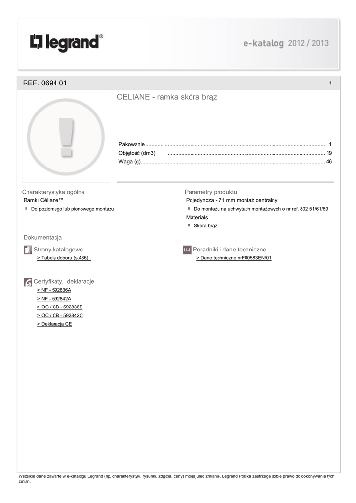 REF. 0694 01 1 CELIANE - ramka skóra brąz Pakowanie .......................................................................................................................................... 1 Objętość (dm3) .......................................................................................................................................... 19 Waga (g) .......................................................................................................................................... 46 Charakterystyka ogólna Parametry produktu Ramki Céliane™ Pojedyncza - 71 mm montaż centralny Do poziomego lub pionowego montażu Do montażu na uchwytach montażowych o nr ref. 802 51/61/69 Materials Skóra brąz Dokumentacja Strony katalogowe > Tabela doboru (s.486) Poradniki i dane techniczne > Dane techniczne nrF00583EN/01 Certyfikaty, deklaracje > NF - 592836A > NF - 592842A > OC / CB - 592836B > OC / CB - 592842C > Deklaracja CE Wszelkie dane zawarte w e-katalogu Legrand (np. charakterystyki, rysunki, zdjęcia, ceny) mogą ulec zmianie. Legrand Polska zastrzega sobie prawo do dokonywania tych zmian.