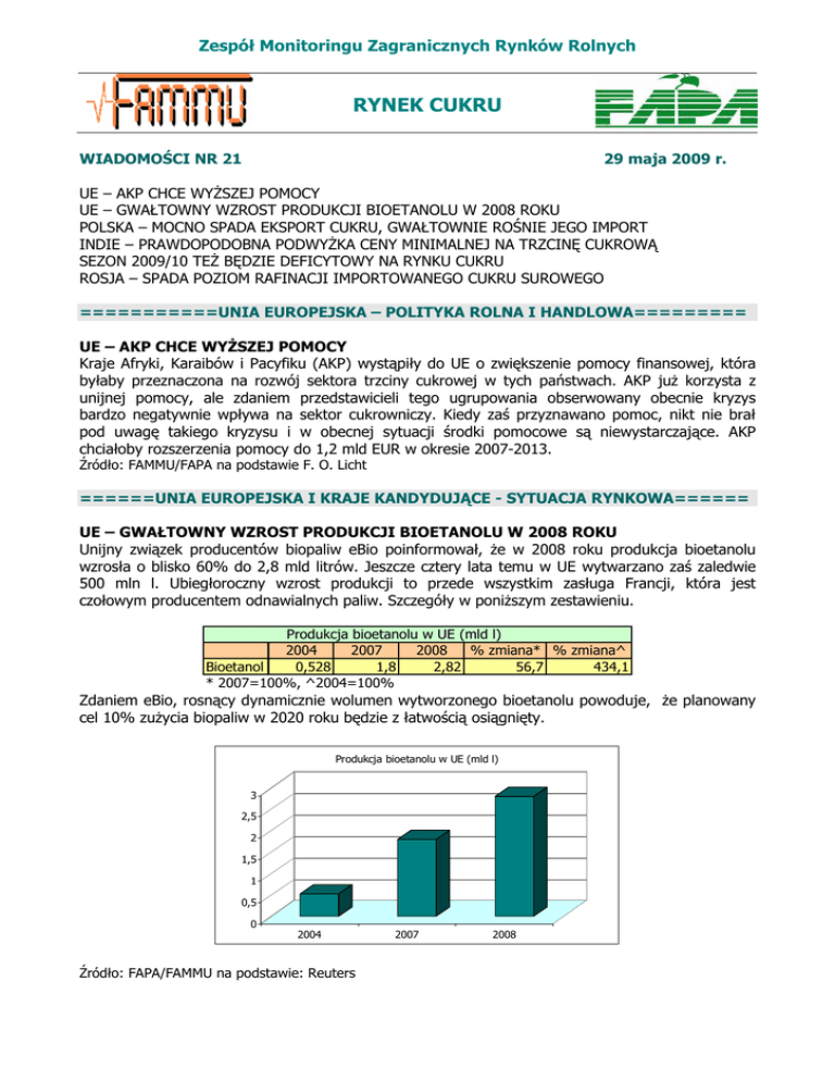 Zespół Monitoringu Zagranicznych Rynków Rolnych RYNEK CUKRU WIADOMOŚCI NR 21 29 maja 2009 r. UE – AKP CHCE WYśSZEJ POMOCY UE – GWAŁTOWNY WZROST PRODUKCJI BIOETANOLU W 2008 ROKU POLSKA – MOCNO SPADA EKSPORT CUKRU, GWAŁTOWNIE ROŚNIE JEGO IMPORT INDIE – PRAWDOPODOBNA PODWYśKA CENY MINIMALNEJ NA TRZCINĘ CUKROWĄ SEZON 2009/10 TEś BĘDZIE DEFICYTOWY NA RYNKU CUKRU ROSJA – SPADA POZIOM RAFINACJI IMPORTOWANEGO CUKRU SUROWEGO ===========UNIA EUROPEJSKA – POLITYKA ROLNA I HANDLOWA========= UE – AKP CHCE WYśSZEJ POMOCY Kraje Afryki, Karaibów i Pacyfiku (AKP) wystąpiły do UE o zwiększenie pomocy finansowej, która byłaby przeznaczona na rozwój sektora trzciny cukrowej w tych państwach. AKP juŜ korzysta z unijnej pomocy, ale zdaniem przedstawicieli tego ugrupowania obserwowany obecnie kryzys bardzo negatywnie wpływa na sektor cukrowniczy. Kiedy zaś przyznawano pomoc, nikt nie brał pod uwagę takiego kryzysu i w obecnej sytuacji środki pomocowe są niewystarczające. AKP chciałoby rozszerzenia pomocy do 1,2 mld EUR w okresie 2007-2013. Źródło: FAMMU/FAPA na podstawie F. O. Licht ======UNIA EUROPEJSKA I KRAJE KANDYDUJĄCE - SYTUACJA RYNKOWA====== UE – GWAŁTOWNY WZROST PRODUKCJI BIOETANOLU W 2008 ROKU Unijny związek producentów biopaliw eBio poinformował, Ŝe w 2008 roku produkcja bioetanolu wzrosła o blisko 60% do 2,8 mld litrów. Jeszcze cztery lata temu w UE wytwarzano zaś zaledwie 500 mln l. Ubiegłoroczny wzrost produkcji to przede wszystkim zasługa Francji, która jest czołowym producentem odnawialnych paliw. Szczegóły w poniŜszym zestawieniu. Produkcja bioetanolu w UE (mld l) 2004 2007 2008 % zmiana* % zmiana^ Bioetanol 0,528 1,8 2,82 56,7 434,1 * 2007=100%, ^2004=100% Zdaniem eBio, rosnący dynamicznie wolumen wytworzonego bioetanolu powoduje, Ŝe planowany cel 10% zuŜycia biopaliw w 2020 roku będzie z łatwością osiągnięty. Produkcja bioetanolu w UE (mld l) 3 2,5 2 1,5 1 0,5 0 2004 Źródło: FAPA/FAMMU na podstawie: Reuters 2007 2008 Zespół Monitoringu Zagranicznych Rynków Rolnych POLSKA – MOCNO SPADA EKSPORT CUKRU, GWAŁTOWNIE ROŚNIE JEGO IMPORT W pierwszym kwartale 2009 roku odnotowano gwałtowny spadek dodatniego salda w obrotach handlu zagranicznego cukrem. Pod względem wartości saldo spadło aŜ o 90% z 20,6 do zaledwie 2,3 mln EUR. W przypadku wolumenu redukcja była jeszcze większa i saldo zamknęło się ujemnym wynikiem, spadając z +64,7 do -0,7 tys. ton. Głównymi przyczynami tak diametralnej zmiany obrazu polskiego handlu zagranicznego były: 1) sprzedaŜ kwot produkcyjnych od sezonu 2008/09 (październik/wrzesień) do 1,4 mln ton, czyli o około 250 tys. ton poniŜej poziomu konsumpcji w Polsce; 2) spadek produkcji cukru w sezonie 2008/09 do zaledwie 1,33 mln ton (jeszcze poniŜej poziomu limitu produkcyjnego). Polski handel zagraniczny cukrem w pierwszych kwartałach lat 2007-09 w ujęciu wartościowym mln EUR 35 eksport import saldo 30 Polski handel zagraniczny cukrem w pierwszych kwartałach lat 2007-09 w ujęciu ilościowym tys. t eksport import saldo 100 80 25 20 60 15 40 10 20 5 0 0 1 kw. 2007 1 kw. 2008 1 kw. 2009 1 kw. 2007 -20 1 kw. 2008 1 kw. 2009 W pierwszym kwartale 2009 roku polscy eksporterzy sprzedali na zagraniczne rynki ponad 36,8 tys. ton cukru, za które otrzymali 22,1 mln EUR. Oznacza to redukcję o odpowiednio 57 i 31%. W tym samym czasie import wzrósł gwałtownie z 20,6 do 37,5 tys. ton (+82%), a jego wartość zwiększyła się z 11,6 do 19,8 mln EUR (+71%). Po raz pierwszy od lat odnotowano teŜ ujemny bilans w handlu pod względem wolumenu. Głównymi rynkami zbytu dla polskiego cukru były kraje unijne, gdzie w pierwszym kwartale 2009 roku trafiło ponad 90% eksportu cukru. UE była jednocześnie największym dostawcą cukru do Polski, skąd polscy importerzy zakupili 95% cukru. O 90% spadł eksport do WNP (w tym Rosji). Pnad pięciokrotnie wzrósł zaś import z UE-12 i blisko trzykrotnie z UE-15. Praktycznie ustały zakupy z Chorwacji. Blisko 36% sprowadzonego do Polski cukru pochodziło z Niemiec, 25% z Czech i 13% z Wielkiej Brytanii. Natomiast największym odbiorcami cukru były zaś tradycyjnie Niemcy, do których trafiło 30% eksportu cukru, i po 80% wzroście Litwa (21% udział). Geografia eksportu polskiego cukru w pierwszym kwartale 2009 roku w ujęciu wartościowym Słowacja Austria 4% 6% Pozostałe 8% Niemcy 33% Geografia importu cukru do Polski w pierwszym kwartale 2009 roku w ujęciu wartościowym Pozostałe 5% Czechy Niemcy 19% 38% Słowacja 4% Litwa 22% Szwecja 7% Czechy 7% Estonia 8% Rosja 5% Francja 5% Dania 11% Wlk. Bryt. 16% Chorwacja 2% Źródło: FAMMU/FAPA na podstawie FAMMU ================RYNKI POZA UNIĄ EUROPEJSKĄ================= INDIE – PRAWDOPODOBNA PODWYśKA CENY MINIMALNEJ NA TRZCINĘ CUKROWĄ Hinduskie władze rozwaŜają moŜliwość zwiększenia o 32% ceny minimalnej na trzcinę cukrową, by zachęcić rolników do uprawy tej rośliny i zwiększenia produkcji cukru, która spadła w sezonie 2008/09 o 10 mln ton. Cena minimalna miałaby wzrosnąć od października br. z 81,18 do 107 rupii za 100 kg trzciny. (1INR=~0,07PLN) Źródło: FAMMU/FAPA na podstawie Reuters Zespół Monitoringu Zagranicznych Rynków Rolnych SEZON 2009/10 TEś BĘDZIE DEFICYTOWY NA RYNKU CUKRU Międzynarodowa Organizacja Cukru Światowy deficyt cukru w sezonach 2008/09 i 2009/10 ISO szacuje, Ŝe w sezonie 2009/10 (mln t w przeliczeniu na surowy cukier) (październik/wrzesień) światowy bilans cukru równieŜ zamknie się nadwyŜką Kingsman SA; 14 konsumpcji nad produkcją. Deficyt jest 11,56 12 prognozowany na 4,9 mln ton wobec 10 7,8 mln ton w sezonie 2008/09. 8 Kingsman SA; Zdaniem organizacji taka sytuacja 2,5 6 ISO; 7,8 będzie owocować dalszym wzrostem 4 ISO; 4,9 cen cukru. ISO nie podało ani 2 szacunków produkcji, ani konsumpcji. 0 Firma konsultingowa Kingsman SA oszacowała zaś światowy deficyt cukru w sezonie 2009/10 (kwiecień/maj) na 2,5 mln ton. Dane w pr