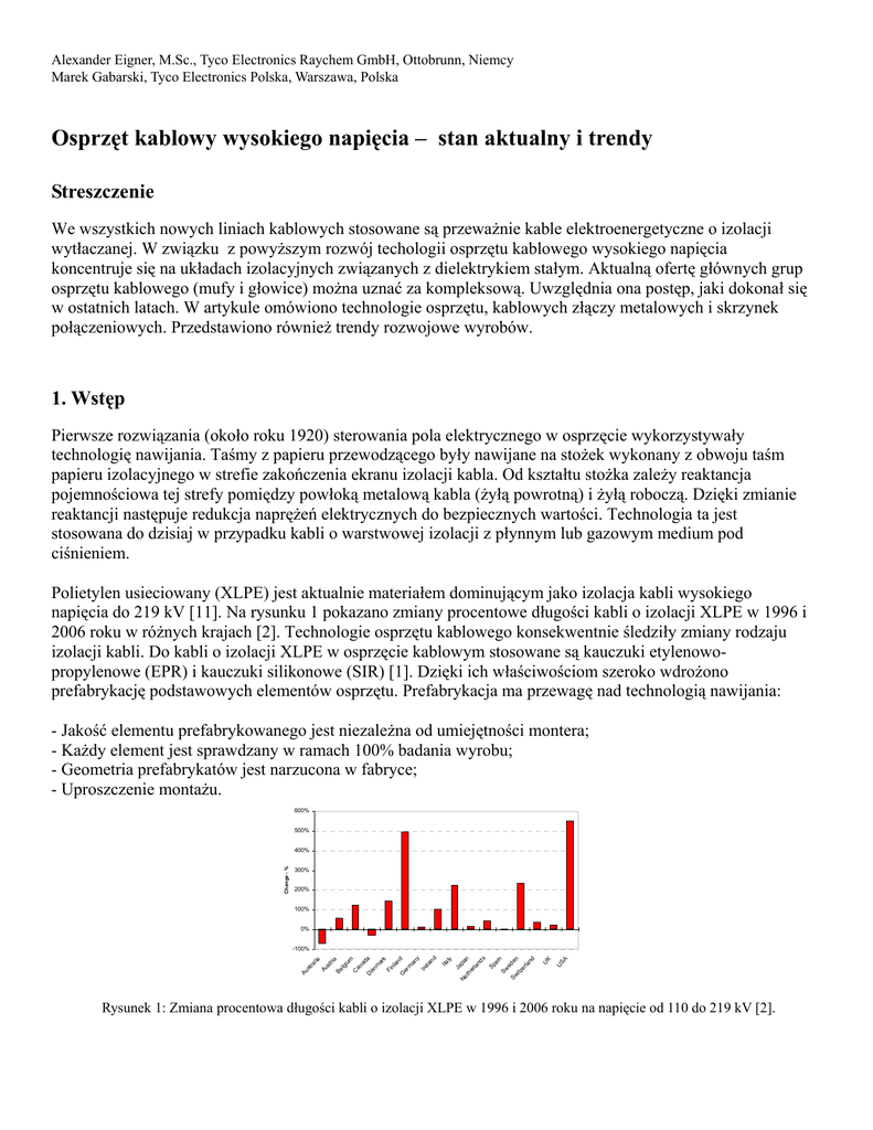 Alexander Eigner, M.Sc., Tyco Electronics Raychem GmbH, Ottobrunn, Niemcy Marek Gabarski, Tyco Electronics Polska, Warszawa, Polska Osprzęt kablowy wysokiego napięcia – stan aktualny i trendy Streszczenie We wszystkich nowych liniach kablowych stosowane są przeważnie kable elektroenergetyczne o izolacji wytłaczanej. W związku z powyższym rozwój techologii osprzętu kablowego wysokiego napięcia koncentruje się na układach izolacyjnych związanych z dielektrykiem stałym. Aktualną ofertę głównych grup osprzętu kablowego (mufy i głowice) można uznać za kompleksową. Uwzględnia ona postęp, jaki dokonał się w ostatnich latach. W artykule omówiono technologie osprzętu, kablowych złączy metalowych i skrzynek połączeniowych. Przedstawiono również trendy rozwojowe wyrobów. 1. Wstęp Pierwsze rozwiązania (około roku 1920) sterowania pola elektrycznego w osprzęcie wykorzystywały technologię nawijania. Taśmy z papieru przewodzącego były nawijane na stożek wykonany z obwoju taśm papieru izolacyjnego w strefie zakończenia ekranu izolacji kabla. Od kształtu stożka zależy reaktancja pojemnościowa tej strefy pomiędzy powłoką metalową kabla (żyłą powrotną) i żyłą roboczą. Dzięki zmianie reaktancji następuje redukcja naprężeń elektrycznych do bezpiecznych wartości. Technologia ta jest stosowana do dzisiaj w przypadku kabli o warstwowej izolacji z płynnym lub gazowym medium pod ciśnieniem. Polietylen usieciowany (XLPE) jest aktualnie materiałem dominującym jako izolacja kabli wysokiego napięcia do 219 kV [11]. Na rysunku 1 pokazano zmiany procentowe długości kabli o izolacji XLPE w 1996 i 2006 roku w różnych krajach [2]. Technologie osprzętu kablowego konsekwentnie śledziły zmiany rodzaju izolacji kabli. Do kabli o izolacji XLPE w osprzęcie kablowym stosowane są kauczuki etylenowopropylenowe (EPR) i kauczuki silikonowe (SIR) [1]. Dzięki ich właściwościom szeroko wdrożono prefabrykację podstawowych elementów osprzętu. Prefabrykacja ma przewagę nad technologią nawijania: - Jakość elementu prefabrykowanego jest niezależna od umiejętności montera; - Każdy element jest sprawdzany w ramach 100% badania wyrobu; - Geometria prefabrykatów jest narzucona w fabryce; - Uproszczenie montażu. 600% 500% Change - % 400% 300% 200% 100% 0% UK US A Sp ai n Sw e Sw d e n itz er la nd Ne th er la nd s Ita ly Ja pa n a Be lg iu m Ca na da Da nm ar k Fi nl an d G er m an y Ire la nd us tri A Au st ra lia -100% Rysunek 1: Zmiana procentowa długości kabli o izolacji XLPE w 1996 i 2006 roku na napięcie od 110 do 219 kV [2]. 2. Aktualne rozwiązania osprzętu Osprzęt dzielimy na trzy główne grupy: - Głowice - Głowice wtykowe do rozdzielnic GIS i transformatorów - Mufy Głowice kablowe pełnią funkcję zakończenia kabla i wyprowadzenia jego żyły roboczej. Ich otoczeniem jest zawsze powietrze lecz miejscem ich zainstalowania może być otwarta przestrzeń lub pomieszczenie wewnętrzne. Dlatego można je podzielić na wnętrzowe i zewnętrzne. Jeśli głowica znajduje się wewnątrz transformatora lub rozdzielnicy to nazywamy ją głowicą aparatową lub wtykową. Mufa, oprócz podstawowej funkcji łączenia dwóch kabli, może służyć również do zmiany konfiguracji układu elektrycznego linii kablowej. Jedną z najważniejszych części osprzętu jest element sterujący pole elektryczne. Dla napięć maksymalnych powyżej 72 kVmożliwe jest stosowanie wyłącznie techniki sterowania geometrycznego za pomocą stożka [3]. Ten element zapewnia utrzymanie poziomu naprężeń elektrycznych poniżej dopuszczalnych wartości nie tylko przy napięciach roboczych, lecz również zakłóceniowych i probierczych w tym udarowych. E l e c tr i c fi e l d s tr e n g th - k V / m m 100 10 1 10 100 1000 Rated voltage - kV Rysunek 2: Naprężenia elektryczne w izolacji Na rysunku 2 pokazano wartości naprężeń elektrycznych w izolacji, z jakimi należy liczyć sie przy projektowaniu układu sterującego. Podano wartości na powierzchni ekranu żyły roboczej i na powierzchni izolacji. Czerwone punkty odpowiadają napięciom o częstotliwości sieciowej, zaś niebieskie napięciom udarowym. Wartościami krytycznymi w osprzęcie kablowym są naprężenia elektryczne na powierzchni izolacji przy napięciach udarowych. Ich poziom służy do projektowania stożka sterującego. Należy również uwzględnić trend zmniejszania grubości izolacji kabli elektroenergetycznych przez ich producentów. Dotyczy to w szczególności tak zwanych kabli „high stress”. W kablach tych w zakresie napięć maksymalnych 123 – 170 kV występują naprężenia typowe dla „klasycznych” kabli 500 kV. Oczywiście osprzęt kablowy musi pasować do konstrukcji kabli, zależnej od konkretnej aplikacji w zakresie żył roboczych, ekranów przewodzących, materiałów izolacyjnych, budowy powłok metalowych, żył powrotnych, pancerzy i osłon zewnętrznych. Konstrukcje kabli nie są standaryzowane. Osprzęt dobierany jest indywidualnie na podstawie danych technologicznych producenta kabla. Jednocześnie można zaobserwować zerwanie ze zwyczajem zamawiania kabli i osprzętu u tego samego producenta. Od producenta osprzętu wymaga to projektowania coraz bardziej uniwersalnych konstrukcji. 2.1. Głowice W większości przypadków głowice instalowane są na zewnątrz budynków. Warunki otoczenia muszą być uwzględniane przy ich doborze. Izolatory głowic różnią się materiałem osłony, drogą upływu, drogą przeskoku itd... Drogę upływu dobiera się w zależności od warunków zabrudzeniowych i możliwości samoczyszczenia [5]. Zasady doboru izolatorów kompozytowych uległy modyfikacji w 2008 roku. Klasyfikacja stref od „ I-IV” została zastąpiona klasyfikacją „a-e” (od strefy bardzo lekkiej do strefy bardzo ciężkiej). Oczywiście parametry osłony zastosowanego izolatora zależą również od wymaganego udarowego poziomu izolacji (BIL) 
