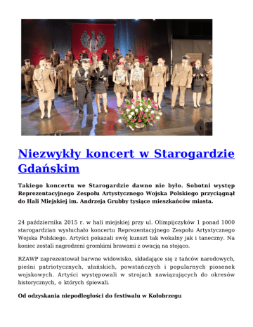 Niezwykły koncert w Starogardzie Gdańskim Takiego koncertu we Starogardzie dawno nie było. Sobotni występ Reprezentacyjnego Zespołu Artystycznego Wojska Polskiego przyciągnął do Hali Miejskiej im. Andrzeja Grubby tysiące mieszkańców miasta. 24 października 2015 r. w hali miejskiej przy ul. Olimpijczyków 1 ponad 1000 starogardzian wysłuchało koncertu Reprezentacyjnego Zespołu Artystycznego Wojska Polskiego. Artyści pokazali swój kunszt tak wokalny jak i taneczny. Na koniec zostali nagrodzeni gromkimi brawami z owacją na stojąco. RZAWP zaprezentował barwne widowisko, składające się z tańców narodowych, pieśni patriotycznych, ułańskich, powstańczych i popularnych piosenek wojskowych. Artyści występowali w strojach nawiązujących do okresów historycznych, o których śpiewali. Od odzyskania niepodległości do festiwalu w Kołobrzegu Program podzielony był na cztery części. Pierwsza nawiązywała do czasu odzyskania przez Polskę niepodległości, kiedy powstało najwięcej piosenek o losach żołnierzy. Mieszkańcy Starogardu usłyszeli m.in. pieść „Komendancie nasz”, „Marsz pierwszej brygady” czy „Wiązankę legionową”. Kolejny okres poświęcony został marszałkowi Józefowi Piłsudskiemu i ułanom. W pieśniach legionowych usłyszeć można było zachwyt nad ułanem – „malowanym chłopcem”, jego koniem i mundurem, za którym – jak śpiewano – panny szły sznurem. Ten okres to też czas wielkiego szacunku dla marszałka, dlatego „Pieśń o Wodzu miły” wywołała wzruszenie, a piosenki „Ułani ułani” czy „Przybyli ułani..” niezmiernie bawiły publiczność. Kolejnym przystankiem w tej muzycznej podróży był okres II wojny światowej i Powstania Warszawskiego. Piosenka żołnierska towarzyszyła walczącym praktycznie na wszystkich frontach. Żołnierze w ten sposób dodawali sobie otuchy i jednoczyli się, śpiewając o swych radościach, nadziejach, tęsknotach i smutkach. Starogardzianie usłyszeli: „Serce w plecaku”, „Marsz Mokotowa” i „Pieśń o mojej Warszawie”. Na zakończenie tej muzycznej uczty w myśl marszałka Piłsudskiego, który zalecał dbałość o duchową strawę żołnierskiego życia, jaką była rozrywka, artyści zaprosili mieszkańców do Kołobrzegu. Publiczność bardzo żywo zareagowała na takie utwory jak „Marszowy szlagier”, „W wojsku nie jest źle” czy „Stewardesa i marynarz”. Wszyscy się fantastycznie bawili, przypominając sobie czasy żołnierskiego festiwalu. Jako ostatni utwór wybrzmiała pieśń „Jak orły białe” Wszyscy wykonawcy zaśpiewali „Leć orle biały nad polskie łany, które uprawia nasz lud kochany. Leć ponad Wisłę, leć ponad Wartę, skrzydła twe białe trzymaj rozwarte”. Owacja na stojąco, kwiaty i tysiące uśmiechów Orkiestra i soliści bawili starogardzką publiczność przez ponad godzinę. Przeboje piosenki żołnierskiej, narodowe tańce, „Mazur” z opery Halka Stanisława Moniuszki w wykonaniu baletu oraz szlagiery muzyki rozrywkowej porwały widownię, która śpiewała razem z artystami, dodając im energii oklaskami. Czuć było powszechne zadowolenie i radość z przeżywanych chwil. Nic więc dziwnego, że koncert zakończyła owacja na stojąco. Organizatorem tego wspaniałego widowiska był 2 Pułk Szwoleżerów Rokitniańskich w imieniu, którego gości przywitał rtm.Krzysztof Landowski. Patronat nad imprezą objął prezydent miasta Janusz Stankowiak, który z kolei na koniec podziękował Zespołowi wręczając im piękny kosz kwiatów.