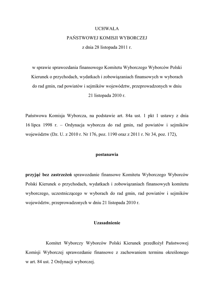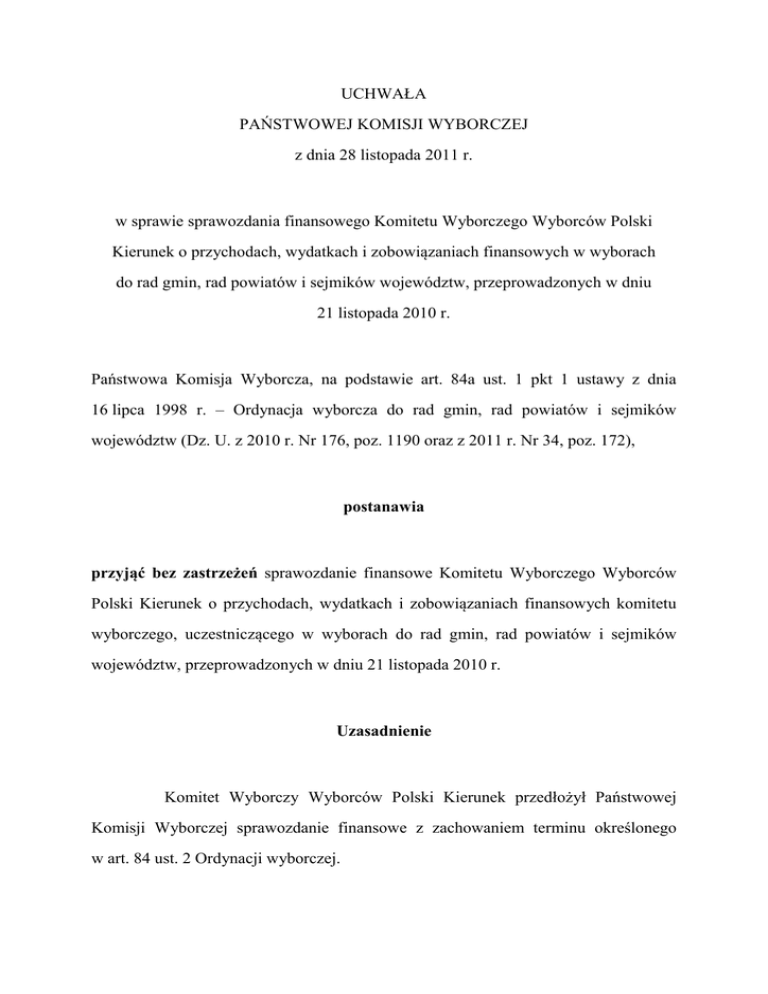 UCHWAŁA PAŃSTWOWEJ KOMISJI WYBORCZEJ z dnia 28 listopada 2011 r. w sprawie sprawozdania finansowego Komitetu Wyborczego Wyborców Polski Kierunek o przychodach, wydatkach i zobowiązaniach finansowych w wyborach do rad gmin, rad powiatów i sejmików województw, przeprowadzonych w dniu 21 listopada 2010 r. Państwowa Komisja Wyborcza, na podstawie art. 84a ust. 1 pkt 1 ustawy z dnia 16 lipca 1998 r. – Ordynacja wyborcza do rad gmin, rad powiatów i sejmików województw (Dz. U. z 2010 r. Nr 176, poz. 1190 oraz z 2011 r. Nr 34, poz. 172), postanawia przyjąć bez zastrzeżeń sprawozdanie finansowe Komitetu Wyborczego Wyborców Polski Kierunek o przychodach, wydatkach i zobowiązaniach finansowych komitetu wyborczego, uczestniczącego w wyborach do rad gmin, rad powiatów i sejmików województw, przeprowadzonych w dniu 21 listopada 2010 r. Uzasadnienie Komitet Wyborczy Wyborców Polski Kierunek przedłożył Państwowej Komisji Wyborczej sprawozdanie finansowe z zachowaniem terminu określonego w art. 84 ust. 2 Ordynacji wyborczej. 2 Sprawozdanie zostało sporządzone według wzoru określonego w załączniku nr 1 do rozporządzenia Ministra Finansów z dnia 23 listopada 2006 r., zmieniającego rozporządzenie w sprawie sprawozdań finansowych o przychodach, wydatkach i zobowiązaniach finansowych komitetów wyborczych uczestniczących w wyborach do rad gmin, rad powiatów i sejmików województw (Dz. U. Nr 212, poz. 1560). Żaden z uprawnionych podmiotów określonych w art. 84b Ordynacji wyborczej nie zgłosił Państwowej Komisji Wyborczej zastrzeżeń do sprawozdania Komitetu. Komitet Wyborczy Wyborców Polski Kierunek po uzyskaniu postanowienia potwierdzającego jego utworzenie zarejestrował 94 kandydatów na radnych sejmików województw, 11 kandydatów na radnych miast na prawach powiatu oraz 7 kandydatów na radnych gmin. Państwowa Komisja Wyborcza na podstawie przedłożonych dokumentów stwierdziła, co następuje. Komitet Wyborczy Wyborców Polski Kierunek pozyskał na cele wyborcze kwotę 884,00 zł, którą gromadził na rachunku bankowym o nr 7110 2313 0000 3402 0383 2342 w PKO BP SA O. II w Katowicach. Składały się na nią wyłącznie wpłaty od osób fizycznych w łącznej kwocie 884,00 zł. Wpłaty dokonywane były zgodnie z art. 83d ust. 3 Ordynacji wyborczej, w formie bezgotówkowej. Jak wynika z załączonych do sprawozdania dokumentów bankowych wydatki Komitetu wyniosły 844,76 zł, w tym bezpośrednio związane z udziałem w wyborach 819,43 zł, a 25,33 zł zostało wydatkowane na pokrycie kosztów prowizji bankowych. Koszty kampanii wyborczej nie przekroczyły limitu obliczonego na podstawie art. 83e ust. 2 i 3 Ordynacji wyborczej, wynoszącego 546 000,00 zł. 3 Pozyskiwanie i wydatkowanie środków finansowych przez Komitet odbywało się w terminach określonych w art. 83 ust. 2 i 4 Ordynacji. Państwowa Komisja Wyborcza, po zapoznaniu się ze sprawozdaniem finansowym Komitetu Wyborczego Wyborców Polski Kierunek i załączonymi do niego dokumentami, postanowiła jak w sentencji. Od niniejszego postanowienia nie przysługuje środek prawny. Przewodniczący Państwowej Komisji Wyborczej: Stefan J. Jaworski Zastępcy Przewodniczącego Państwowej Komisji Wyborczej: Andrzej Kisielewicz, Stanisław Kosmal Członkowie Państwowej Komisji Wyborczej: Bogusław Dauter, Maria Grzelka, Janusz Niemcewicz, Włodzimierz Ryms, Stanisław Zabłocki