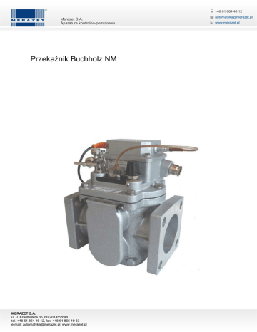 +48 61 864 46 12 Merazet S.A. Aparatura kontrolno-pomiarowa Przekaźnik Buchholz NM MERAZET S.A. ul. J. Krauthofera 36, 60-203 Poznań tel. +48 61 864 46 12, fax: +48 61 865 19 33 e-mail: [email protected], www.merazet.pl [email protected] www.merazet.pl +48 61 864 46 12 [email protected] Merazet S.A. Aparatura kontrolno-pomiarowa 1. www.merazet.pl Wprowadzenie Przekaźnik Buchholza jest urządzeniem ochronnym zgodnym z normą EN 50 216, nadzorującym pracę urządzeń energetycznych izolowanych olejem, takich jak transformatory z konserwatorem i dławiki ziemnozwarciowe. Funkcja ochronna przekaźnika Buchholza polega na sygnalizowaniu: Gromadzenie się w oleju nierozpuszszonych gazów - wyłącznik górny Utrata oleju - wyłącznik dolny Niedopuszczalnie szybka cyrkulacja oleju - wyłącznik dolny / klapa piętrząca Przekaźnik Buchholza w swojej znanej powszechnie formie wykrywa gromadzenie się gazów zawartych w oleju transformatora i w przypadku osiągnięcia przez nie określonej objętości sygnalizuje ich obecność, co oznacza że do czasu osiągnięcia ustawionej wartości progowej nie jest generowany żaden sygnał informacyjny. Nie jest możliwe także wygenerowanie żadnej relacji o czasowym przebiegu zjawiska gromadzenia się gazu. Przebieg czasowy zjawiska powstawania gazów w oleju jest ważnym kryterium przy ocenie uszkodzenia transformatora, ponieważ ilość i skład gazów powstających przy awarii są ściśle związane z rodzajem uszkodzenia i stopniem zaistniałych zniszczeń. Nagła silna awaria powoduje powstawanie dużych ilości gazu w krótkim czasie, podczas gdy długotrwałemu lecz nieznacznemu pogarszaniu się parametrów transformatora towarzyszy powolne i znikome gromadzenie się gazów w oleju. Przekaźniki Buchholza typu NM mierzą nieprzerwanie objętość gromadzących się w nich gazów, przez co osoby obsługujące sieć otrzymują odpowiednio wcześnie pełne informacje o aktualnej objętości gazów i o dynamice jej przyrostu. Te dane stanowią podstawię do oceny rozwoju sytuacji awaryjnej. 2. Budowa przekaźnika Buchholz typu NM Konstrukcja przekaźnika Buchholz w zasadniczej formie z układem pływaków i klapą piętrzącą została zachowana. Przekaźniki Buchholz NM są dodatkowo wyposażone w sondę pojemnościową (1). Sonda ta zamocowana jest w pokrywie przekaźnika. W komorze przyłączeniowej pokrywy zainstalowany został wzmacniacz sygnału pomiarowego. Sonda ze wzmacniaczem połączona jest kablem (2). Sygnał analogowy z pomiaru przesyłany jest kablem ekranowanym metodą trzyprzewodową. MERAZET S.A. ul. J. Krauthofera 36, 60-203 Poznań tel. +48 61 864 46 12, fax: +48 61 865 19 33 e-mail: [email protected], www.merazet.pl +48 61 864 46 12 Merazet S.A. Aparatura kontrolno-pomiarowa 3. [email protected] www.merazet.pl Wymiary Na rysunku 2 przedstawiono przykład przekaźnika Buchholz NM z kołnierzem kwadratowym. Jak pokazuje rysunek, podwyższenie pokrywy skrzynki przyłączeniowej o 17mm nie zmieniło wymiarów przyłączeniowych urządzenia w stosunku do standardowego wykonania. Montaż z analogicznego przekaźnika z układem pomiarowym jest możliwy bez wprowadzania zmian w instalacji. Rys.2. 4. Zakres pomiarowy przekaźnika Buchholz NM. Analogowy układ pomiarowy przekaźnika mierzy objętość gazów w zakresie 50 cm2 – 300 cm2. objętości mniejszej niż 50 cm2 nie można jednoznacznie zmierzyć z powodu zbyt dużych niedokładności. Poza tym pomiar objętości poza tym zakresem nie jest konieczny ze względu na działanie górnego układu pływakowego, a także z uwagi na konstrukcję samego przekaźnika (większe ilości gazu odpływają w kierunku konserwatora) punkt zadziałania górnego systemu pływakowego leży w przedziale 200 cm2-300 cm2 gazu. Rys. 3. MERAZET S.A. ul. J. Krauthofera 36, 60-203 Poznań tel. +48 61 864 46 12, fax: +48 61 865 19 33 e-mail: [email protected], www.merazet.pl +48 61 864 46 12 [email protected] Merazet S.A. Aparatura kontrolno-pomiarowa 5. www.merazet.pl Sposób działania 5.1. Górny i dolny układ stykowy (funkcje standardowa) Działanie przekaźnika Buchholza zostanie opisane na przykładzie wykonania dwupływakowego. Przekaźnik zamontowany jest na rurociągu konserwatorem a kadzią transformatora. Podczas niezakłóconej pracy wypełniony jest on całkowicie olejem. Przekaźniki reaguje na wystąpienie usterek w transformatorze w następujący sposób: Usterka: w cieczy izolacyjnej znajduje się swobodny gaz. Reakcja : gaz wędruje wraz z olejem ku górze i kumuluje się częściowo pod pokrywą przekaźnika, wypierając z niego olej. Wraz z obniżającym się poziomem oleju opada górny pływak. Powoduje to załączenie styku kontaktronu i podanie sygnału ostrzegawczego do sterowania. Dolny pływak pozostaje w pozycji pierwotnej, ponieważ po obniżeniu się poziomu do określonego poziomu gaz może przedostać się do konserwatora za pośrednictwem przewodu rurowego. Gromadzenie się gazu Usterka: wyciek oleju w wyniku nieszczelności kadzi Reakcja: wraz z opadaniem poziomu oleju obniża się górny pływak, zostaje wygenerowany sygnał ostrzegawczy. Przy dalszym wypływie oleju opróżnia się konserwator, przewód rurowy i przekaźnik Buchholza. Z opadającym poziomem oleju obniża się dolny pływak generując za pośrednictwem magnesu trwałego i kontaktronu sygnał alarmowy odłączający transformator. Usterka: W wyniku nagłego zakłócenia powstaje w kadzi transformatora duże ciśnienie oleju wypychające go z dużą prędkością w kierunku konserwatora. Reakcja: fala oleju trafia w przekaźniku na zamontowaną klapę piętrzącą. Gdy przepływ oleju przekracza określoną wartość graniczną klapa uchyla się uruchamiając mechanizm magnesu trwałego i kontaktronu. Powoduje to natychmiastowe odłączenie transformatora. Utrata oleju Silny strumień oleju MERAZET S.A. ul. J. Krauthofera 36, 60-203 Poznań tel. +48 61 864 46 12, fax: +48 61 865 19 33 e-mail: [email pro