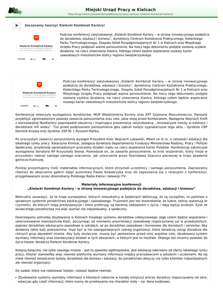 Miejski Urząd Pracy w Kielcach http://mup.kielce.pl/wydarzenie/460/zaczynamy-tworzyc-kielecki-kombinat-kariery! Zaczynamy tworzyć Kielecki Kombinat Kariery! Podczas konferencji zatytułowanej „Kielecki Kombinat Kariery – w stronę innowacyjnego podejścia do doradztwa, edukacji i biznesu”, dyrektorzy Centrum Kształcenia Praktycznego, Kieleckiego Parku Technologicznego, Zespołu Szkół Ponadgimnazjalnych Nr 1 w Kielcach oraz Miejskiego Urzędu Pracy podpisali ważne porozumienie. Na mocy tego dokumentu podjęte zostaną szybkie działania, na rzecz utworzenia klastra, którego celem będzie wspieranie rozwoju karier zawodowych mieszkańców stolicy regionu świętokrzyskiego. Podczas konferencji zatytułowanej „Kielecki Kombinat Kariery – w stronę innowacyjnego podejścia do doradztwa, edukacji i biznesu”, dyrektorzy Centrum Kształcenia Praktycznego, Kieleckiego Parku Technologicznego, Zespołu Szkół Ponadgimnazjalnych Nr 1 w Kielcach oraz Miejskiego Urzędu Pracy podpisali ważne porozumienie. Na mocy tego dokumentu podjęte zostaną szybkie działania, na rzecz utworzenia klastra, którego celem będzie wspieranie rozwoju karier zawodowych mieszkańców stolicy regionu świętokrzyskiego. Konferencję otworzyły wystąpienia dyrektorów: MUP Włodzimierza Korony oraz KPT Szymona Mazurkiewicza. Panowie przybliżyli zgromadzonym powody zawarcia porozumienia oraz cele, jakie stoją przed Kombinatem. Następnie Wojciech Kreft z warszawskiej NeoKariery poprowadził obszerną i inspirująca prezentację zatytułowaną: „Innowacyjne trendy w edukacji i doradztwie XXI wieku”. Tuż przed podpisaniem porozumienia głos zabrali kolejni sygnatariusze tego aktu – dyrektor CKP Dominik Kraska oraz dyrektor ZSP Nr 1 Ryszard Mańko. Po uroczystym zawarciu porozumienia wystąpił Prezydent Kielc Wojciech Lubawski. Mówił on m.in. o celowości edukacji dla lokalnego rynku pracy. Katarzyna Klimiuk, zastępca dyrektora Departamentu Funduszy Ministerstwa Rodziny, Pracy i Polityki Społecznej, przybliżyła zgromadzonym priorytety działań rządu na rzecz wspierania karier Polaków. Konferencję zakończyło wystąpienia Senatora RP Krzysztofa Słonia. Powiedział on, że zawarte porozumienie, to krok wizjonerski, który może w przyszłości nabrać takiego samego znaczenia, jak utworzenie przez Stanisława Staszica pierwszej w kraju akademii górniczo-hutniczej. Poniżej prezentujemy treść materiałów informacyjnych, które otrzymali uczestnicy i samego porozumienia. Zapraszamy również do obejrzenia galerii zdjęć autorstwa Pawła Kowalczyka oraz do zapoznania się z relacjami z konferencji, przygotowanymi przez dziennikarzy Polskiego Radia Kielce i telewizji iTV. Materiały informacyjne konferencji „Kielecki Kombinat Kariery - w stronę innowacyjnego podejścia do doradztwa, edukacji i biznesu” Nietrudno zauważyć, że te kraje europejskie, których mieszkańcy w badaniach deklarują, że są szczęśliwi, to państwa o sprawnym systemie poradnictwa edukacyjnego i zawodowego. Truizmem jest też stwierdzenie, że ludzie, którzy wykonują te czynności, do których mają predyspozycje i które preferują, są bardziej zadowoleni z życia, i dają lepszy produkt. Zysk ze skutecznego poradnictwa ma więc wymiar nie indywidualny, a społeczny. Dostrzegamy potrzebę zbudowania w Kielcach trwałego systemu doradztwa całożyciowego. Jego celem będzie wspieranie i ukierunkowanie mieszkańców Kielc, poczynając od momentu preorientacji zawodowej rozpoczynanej już w przedszkolach, poprzez doradztwo edukacyjno-zawodowe w szkołach, aż po doradztwo zawodowe i biznesowe dla dorosłych i seniorów. Aby działania takie były powszechne, musi być w nie zaangażowanych szereg organizacji, które świadczą usługi doradcze dla różnych grup obywateli miasta. Aby były skuteczne, muszą być postawione przed nimi wspólne cele, zbudowany system wymiany informacji oraz standaryzacji działań w tych obszarach, w których jest to możliwe. Dlatego też chcemy powołać do życia klaster doradczy Kielecki Kombinat Kariery. Kolejną bolączka, nie tylko naszego miasta – jest to zjawisko ogólnopolskie, jest edukacja oderwana od oferty lokalnego rynku pracy. Klaster stanowiłby więc również platformę wymiany informacji między pracodawcami a szkołami i uczelniami. Na tej niwie również świadczone byłoby doradztwo dla biznesu i edukacji, bo poradnictwo dotyczy nie tylko klientów indywidualnych ale również organizacji. Do zadań, które ma realizować klaster, należeć będzie również: ● Zbudowanie systemu wymiany informacji o klientach (obecnie w każdej instytucji proces doradczy rozpoczynamy od zera, wówczas gdy część informacji, które mamy do przekazania ma charakter stały – np. dane osobowe), ● ● ● ● ● ● Wzajemna edukacja kadr, tak byśmy rozumieli na czym polegają działania prowadzone np. w ramach preorientacji zawodowej przedszkolaków (doradcy z różnych instytucji korzystają z innej oferty edukacyjnej), Podnoszenie kwalifikacji kadr, Stworzenie platformy edukacyjnej, zawierającej też bazę wiedzy, dla mieszkańców Kielc i, w wydzielonej części, dla realizatorów procesów doradczych, Opracowanie otwartej oferty szkoleniowej dla chętnych w formie zajęć tradycyjnych, e-learningowych, webinarów i blended learningowych, Zbudowanie stałych komórek planowania strategicznego oraz do spraw zawodów przyszłości. Ich celem będzie dostosowywanie oferty do zmiennej sytuacji na rynku pracy oraz wytyczanie kierunków rozwoju miasta w zakresie będącym przedmiotem zainteresowań klastra; Pozyskiwanie środków na działalność i realizację projektów. Dzięki działaniom Kieleckiego Kombinatu Kariery każdy mieszkaniec Kielc powinien skorzystać z: ● ● ● Preorientacji zawodowej w przedszkolu i szkole podstawowej, Doradztwa edukacyjnego w gimnazjum, Doradztwa edukacyjno-zawodowego i biznesowego w szkołach ponadgimnazjalnych or