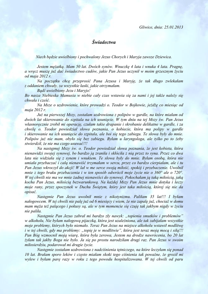 Gliwice, dnia: 25.01.2013 Świadectwa Niech będzie uwielbiony i pochwalony Jezus Chorych i Maryja zawsze Dziewica. Jestem mężatką. Mam 50 lat. Dwóch synów. Wnuczkę 4 lata i wnuka 4 lata. Pragnę, a wręcz muszę już dać świadectwo cudów, jakie Pan Jezus uczynił w moim grzesznym życiu od maja 2012 r. Na początku chcę przeprosić Pana Jezusa i Maryję, że tak długo zwlekałam z oddaniem chwały, za wszystkie łaski, jakie otrzymałam. Bądź uwielbiony Jezu i Maryjo! Bo nasza Niebieska Mamusia w niebie cały czas wstawia się za nami i jej także należy się chwała i cześć. Na Msze o uzdrowienie, które prowadzi o. Teodor w Bojkowie, jeżdżę co miesiąc od maja 2012 r. Już na pierwszej Mszy, zostałam uzdrowiona z polipów w gardle, na które miałam od dwóch lat skierowanie do szpitala na ich usunięcie. W tym dniu na tej Mszy św. Pan Jezus własnoręcznie zrobił mi operację, czułam takie drapanie i skrobanie delikatne w gardle, i za chwilę o. Teodor powiedział słowa poznania, o kobiecie, która ma polipy w gardle i skierowanie na ich usunięcie do szpitala, ale boi się tego zabiegu. Te słowa były do mnie. Polipów już nie mam, obyło się bez zabiegu. Byłam u laryngologa, ale tylko po to żeby stwierdził, że nie ma czego usuwać!!! Na następnej Mszy św. o. Teodor powiedział słowa poznania, że jest kobieta, która nienawidzi swojej synowej, bo bardzo ją zraniła i skłóciła z nią przez to syna. Przez co dwa lata nie widziała się z synem i wnukiem. Te słowa były do mnie. Byłam osobą, która nie umiała przebaczać i całą nienawiść trzymałam w sercu, przez co bardzo cierpiałam, ale i tu Pan Jezus wkroczył do akcji! W lał w me serce swoją miłość, spokój i przebaczenie. Uwolnił mnie z tego braku przebaczenia i w ten sposób odwrócił moje życie nie o 360° ale o 720°. W tej chwili nie ma we mnie żadnej nienawiści do synowej. Pokochałam ją taką miłością, jaką kocha Pan Jezus, miłością bezwarunkową. Na każdej Mszy Pan Jezus mnie dotyka i leczy moje rany, przez spoczynek w Duchu Świętym, który jest taka miłością, której się nie da opisać. Następnie Pan Jezus uwolnił mnie z nikotynizmu. Paliłam 35 lat!!! I byłam nałogowcem. W tej chwili nie palę już od 6 miesięcy i wiem, że nie zapalę już, chociaż w domu mam męża też palącego i pokusy są, ale w tym momencie się czuję tak jakbym nigdy w życiu nie paliła. Następnie Pan Jezus zabrał mi bardzo zły nawyk: „topienia smutków i problemów” w alkoholu, Nie byłam nałogową pijaczką, która jest uzależniona, ale tak zabijałam wszystkie moje problemy, których było niemało. Teraz Pan Jezus na miejsce alkoholu wstawił modlitwę i w tej chwili, gdy ma problemy: „topię je w modlitwie”, która jest teraz moją mocą i siłą!!! Pan Bóg wzmocnił moją wiarę, która była zerowa, Jestem na drodze nawrócenia, bo 20 lat żyłam tak jakby Boga nie było. Ja się po prostu narodziłam drugi raz. Pan Jezus w swoim miłosierdziu, podarował mi drugie życie. Następnie zostałam uzdrowiona z nadciśnienia tętniczego, na które leczyłam się ponad 10 lat. Brałam sporo leków i często miałam skoki tego ciśnienia tak poważne, że groził mi wylew i byłam parę razy w roku z tego powodu hospitalizowana. W tej chwili od paru miesięcy leków nie biorę żadnych. Ciśnienie mam „książkowe”. Codziennie je kontroluję i czuję się wspaniale. Łaski, jakie otrzymałam od Boga są żywym świadectwem tego, że Jezus żyje, jest wśród nas i działa z wielką mocą!!! Jednym słowem Pan Jezus uzdrowił mnie duchowo i fizycznie. Dziękuję Ci mój Jezu za moje uzdrowienia i uwolnienia z całego serca i tobie Maryjo, nasza Mamusiu i proszę jeszcze o nawrócenie mojego męża i uwolnienie go z jego licznych nałogów i ze zła, które w nim siedzi! (Ty znasz ten problem mój Jezu!). Chwała Panu!!! – Bożena. *** Gliwice, dnia: 3.03.2013 Świadectwa. Niech będzie pochwalony Jezus Chrystus! Piszę do Waszej parafii, aby dać świadectwo mojego uzdrowienia. Od roku uczestniczę w Mszach o uzdrowienie, które odbywają się w Bojkowie. Otóż mam stwierdzone skrzywienie kręgosłupa w odcinku lędźwiowym i przez wiele lat zmagałam się z bólami w tym miejscu. Były okresy, że nie potrafiłam się dźwignąć z łóżka. Nie miałam żadnej rehabilitacji, ani nie ćwiczyłam. Po kilku mszach, w jakich uczestniczyłam w Bojkowie bóle ustały i od ponad pół roku już nigdy nie bolał mnie kręgosłup. Czuję i wiem, że to wszystko zasługa mojej żarliwej modlitwy do Pana Boga o uzdrowienie i uwolnienie mnie od trapiących dolegliwości. Czasami, gdy opowiadam innym osobom, które nigdy nie uczestniczyły w takiej Mszy, o radości i spokoju jak człowiek czuje podczas modlitwy w Bojkowie, one patrzą z niedowierzaniem i lekką dezaprobatą, ale ja wiem, że to wszystko dzieje się na prawdę, a ja jestem tego niezbitym dowodem. Z Panem Bogiem. – Beata. *** Gliwice, dnia: 14.10.2013 Świadectwa Niech będzie pochwalony Jezus Chrystus! Pragnę złożyć świadectwo uzdrowienia. Miałam problemy z jelitem i odbytem. Po Mszy św. w czerwcu moje kłopoty się skończyły. W czasie Mszy św. czułam pieczenie policzków i ból z tyłu głowy. Kapłan prosił, żeby ludzie z takimi odczuciami podeszli do ołtarza. Ja tego nie zrobiłam, za co pragnę Pana Boga przeprosić. – Grażyna ze Świętochłowic. *** Mam na imię Bogusia, 47 lat, pochodzę z Gliwic. Na Msze św. z Ojcem Teodorem przyjeżdżam od sierpnia 2012 r. W moim życiu zraniło mnie bardzo dużo osób, przez co jestem osobą zniewoloną. Byłam u egzorcysty i jestem właśnie po modlitwach o przebaczenie. W moim życiu były sytuacje, w których nie radziłam sobie. Stawałam się „zła” coraz to bardziej. Odbijało się to na moich dzieciach i mężu. Któregoś dnia postanowiłam się zabić wraz z dwójką moich dzieci w wieku 5 lat. Poszłam na dworzec ko
