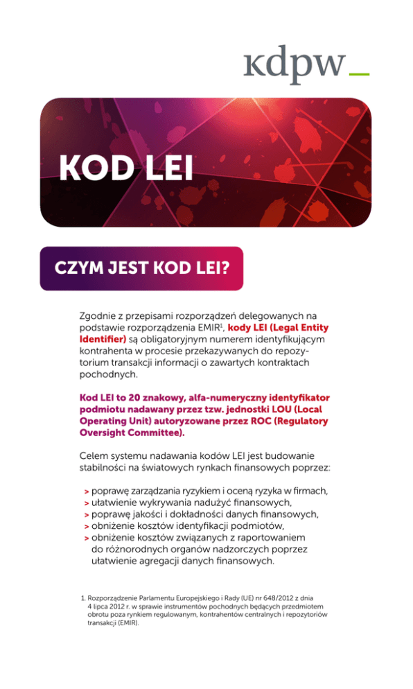 KOD LEI CZYM JEST KOD LEI? Zgodnie z przepisami rozporządzeń delegowanych na podstawie rozporządzenia EMIR1, kody LEI (Legal Entity Identifier) są obligatoryjnym numerem identyfikującym kontrahenta w procesie przekazywanych do repozytorium transakcji informacji o zawartych kontraktach pochodnych. Kod LEI to 20 znakowy, alfa-numeryczny identyfikator podmiotu nadawany przez tzw. jednostki LOU (Local Operating Unit) autoryzowane przez ROC (Regulatory Oversight Committee). Celem systemu nadawania kodów LEI jest budowanie stabilności na światowych rynkach finansowych poprzez: > > > > > oprawę zarządzania ryzykiem i oceną ryzyka w firmach, p ułatwienie wykrywania nadużyć finansowych, poprawę jakości i dokładności danych finansowych, obniżenie kosztów identyfikacji podmiotów, obniżenie kosztów związanych z raportowaniem do różnorodnych organów nadzorczych poprzez ułatwienie agregacji danych finansowych. 1. Rozporządzenie Parlamentu Europejskiego i Rady (UE) nr 648/2012 z dnia 4 lipca 2012 r. w sprawie instrumentów pochodnych będących przedmiotem obrotu poza rynkiem regulowanym, kontrahentów centralnych i repozytoriów transakcji (EMIR). OBOWIĄZEK RAPORTOWANIA DO REPOZYTORIÓW TRANSAKCJI Zgodnie z zapisami Rozporządzenia EMIR wszystkie podmioty prowadzące działalność gospodarczą (przedsiębiorcy), niezależnie od formy prawnej, w jakiej ta działalność jest wykonywana, które zawierają transakcje w instrumentach pochodnych, są zobowiązane do raportowania informacji o nich do repozytoriów transakcji. 7 listopada 2013 r. Europejski Urząd Nadzoru Giełd i Papierów Wartościowych ESMA (European Securities Market Authority) zarejestrował Repozytorium Transakcji w KDPW, stwierdzając tym samym, że spełnia ono wszelkie wymagania stawiane repozytoriom zgodnie z wymogami rozporządzenia EMIR. Warto dodać, że we wniosku rejestracyjnym Krajowy Depozyt wystąpił o możliwość rejestracji wszystkich rodzajów kontraktów objętych obowiązkiem raportowania. KTO MOŻE NADAWAĆ KOD LEI? Za rejestrowanie zainteresowanych podmiotów i nadawanie kodów LEI odpowiedzialne są lokalne jednostki, tzw. Local Operating Units (LOU), nadzorowane przez Regulatory Oversight Committee (ROC). Implementacja procesu nadawania kodów LEI kontrolowana jest przez Central Operating Unit (COU), który gwarantuje jednolite światowe standardy. Zgodnie z decyzją ROC z 27 grudnia 2013 r. Krajowy Depozyt Papierów Wartościowych uzyskał status jednostki pre-LOU upoważnionej do nadawania kodów LEI. KDPW NADAJE KODY LEI 19 sierpnia 2013 r. Krajowy Depozyt Papierów Wartościowych otrzymał prefix (2594) umożliwiający nadawanie osobom prawnym numerów identyfikujących LEI. Prefix został nadany przez ROC Secretariat i identyfikuje nadane przez KDPW kody w globalnym systemie LEI. O numer prefix dla KDPW wystąpił Urząd Komisji Nadzoru Finansowego, który działa jako podmiot pośredniczący w procesie zatwierdzania przez ROC instytucji krajowej jako jednostki LOU (pre-LOU) w ramach globalnego systemu LEI (tzw. sponsoring authority). Krajowy Depozyt, w ramach przynależności do międzynarodowego Stowarzyszenia Krajowych Agencji Numerujących (ANNA), pełni już rolę Agencji Kodującej dla kodów ISIN. Oznacza to, że na polskim rynku KDPW jest jedyną instytucją upoważnioną do nadawania unikatowych, globalnych kodów dla instrumentów finansowych. Wiedza, doświadczenie oraz odpowiednie zasoby systemowe predestynują KDPW do roli podmiotu właściwego także do nadawania kodów LEI. Dodatkowym argumentem, przemawiającym za skorzystaniem z oferty KDPW, jest jego niezależna pozycja na rynku finansowym, wieloletnie doświadczenie w nadawaniu kodów zgodnie z międzynarodowymi standardami oraz obsłudze szeregu operacji dla całego rynku kapitałowego. JAK OTRZYMAĆ KOD LEI? Obowiązujące obecnie regulacje prawne, w tym Rozporządzenie EMIR i jego akty wykonawcze, stawiają numerację LEI na pozycji kluczowej z punktu widzenia obowiązku raportowania transakcji instrumentów pochodnych do repozytoriów transakcji. Oznacza to, że każdy podmiot prawny zaangażowany w takie transakcje, bez względu na pozycję, jaką zajmuje w całym procesie zawierania i rozliczania takich transakcji jest zobowiązany do posiadania takiego numeru. KDPW umożliwi uzyskanie LEI w łatwy i szybki sposób poprzez swoją stronę internetową. Oto 4 proste kroki: 1. Rejestracja konta internetowego 2. Rejestracja wniosku o kod LEI i złożenie zamówienia 3. Dokonanie opłaty 4. Uzyskanie numeru LEI. OBSŁUGA KODÓW LEI Strona internetowa KDPW, prowadzona w języku polskim i angielskim, pozwwala posiadaczom konta na: > Obsługę procesów związanych z kodami LEI, w tym: ∞ składanie wniosków o kod LEI; ∞ przegląd i obsługę zarejestrowanych kodów LEI; ∞ przegląd płatności i faktur; ∞ zarządzanie kontem użytkownika. > Kontakt z KDPW. > Przeglądanie danych dot. podmiotów z nadanym przez KDPW kodem LEI. > Uzyskanie wszelkich informacji dotyczących kodów LEI i ich nadawania. Słowniczek: Kod LEI - Legal Entity Identifier - 20-znakowy kod alfa-numeryczny, który jednoznacznie identyfikuje podmioty zawierające transakcje na światowych rynkach finansowych. GLEIS - Global LEI System - system do nadawania unikalnych w skali globalnej numerów identyfikacyjnych klienta LEI. Funkcjonowanie systemu GLEIS opiera się na współpracujących ze sobą lokalnych jednostkach operacyjnych (tzw. LOU) i na uczestnikach rynku na całym świecie w ramach jednego systemu. ROC - Regulatory Oversight Committee - regulacyjne ciało nadzorcze nad GLEIS, powołane przez Financial Stability Board i zaakceptowane przez grupę G-20. LOU - Local Operating Units - lokalna jednostka uprawniona do nadawania numerów LEI w ramach globalnego systemu GLEIS oraz walidacji i modyfikacji danych referencyjnych dla podmiotów, którym zostały nadawane te numery (np. KDPW). www.kdpw.pl email: [email protected] tel. 